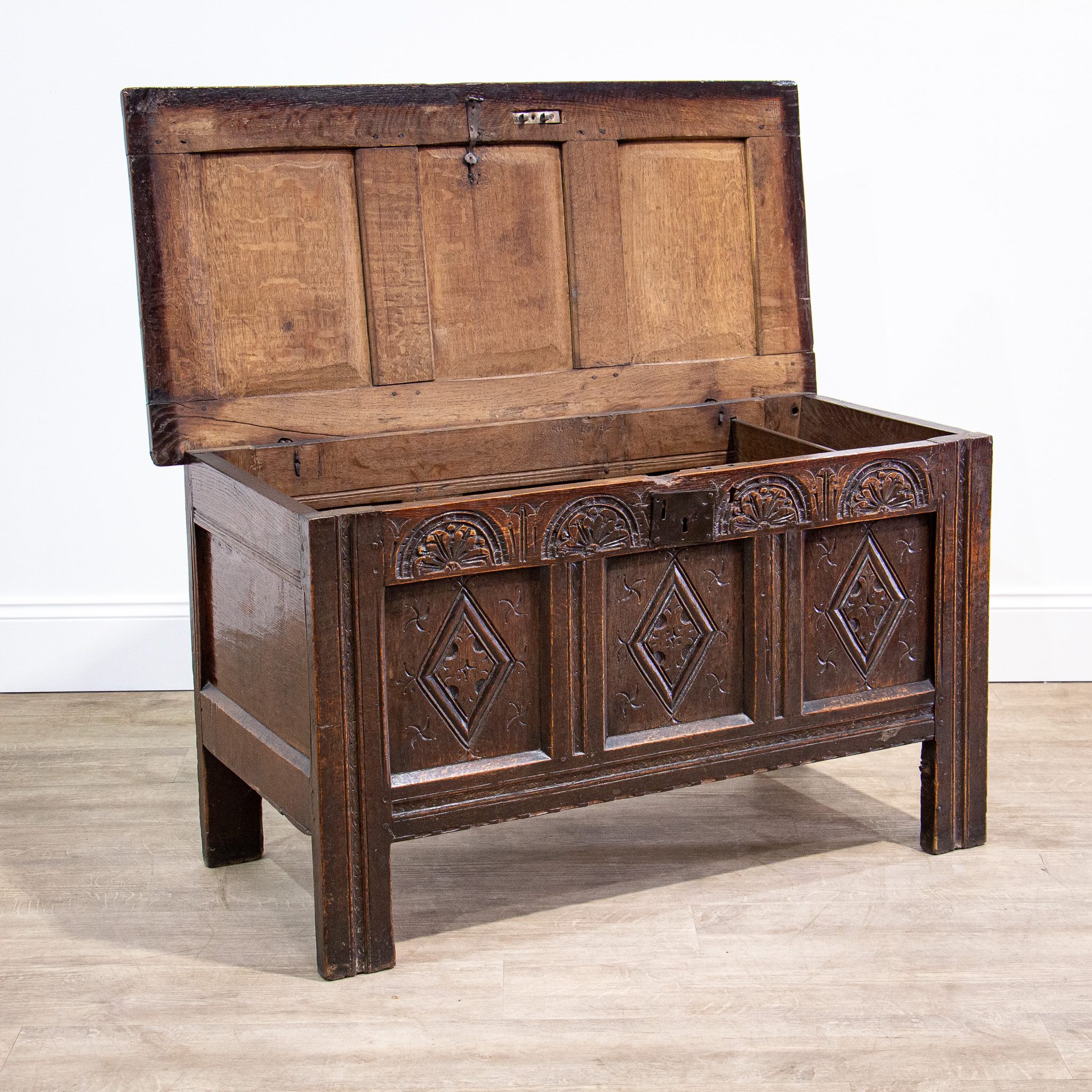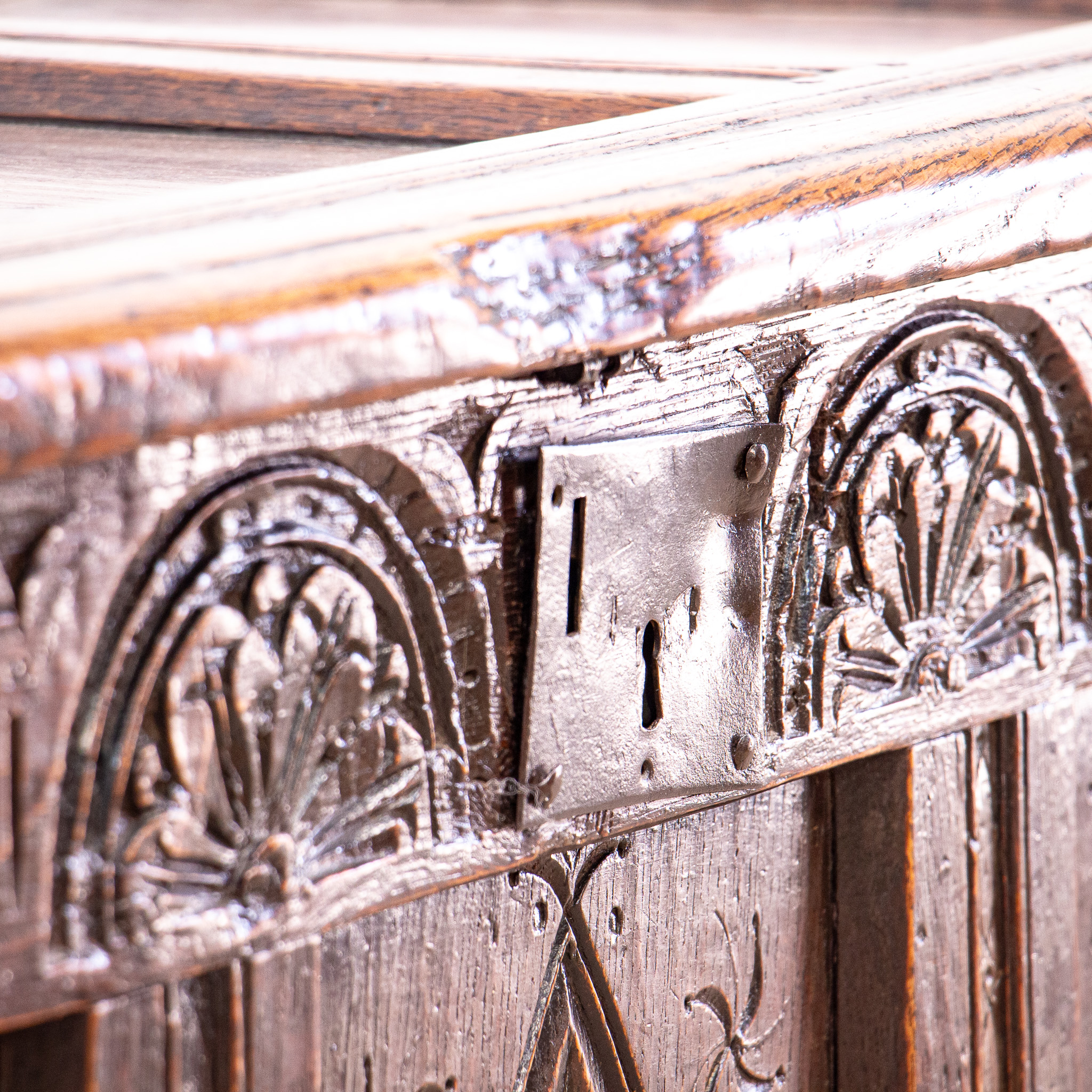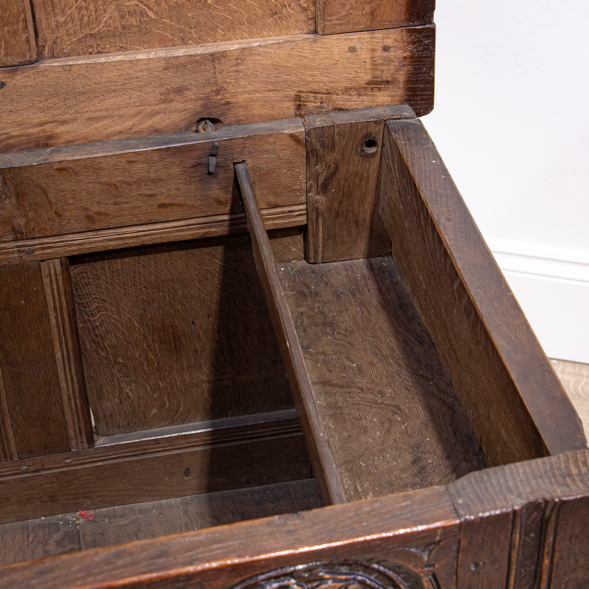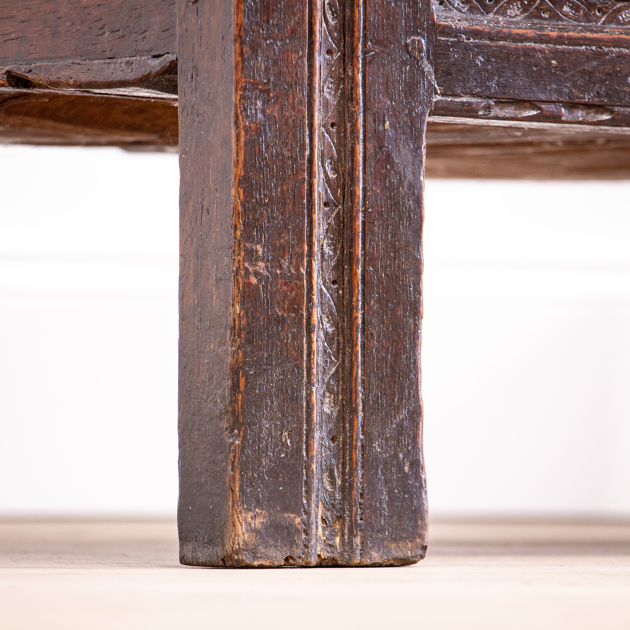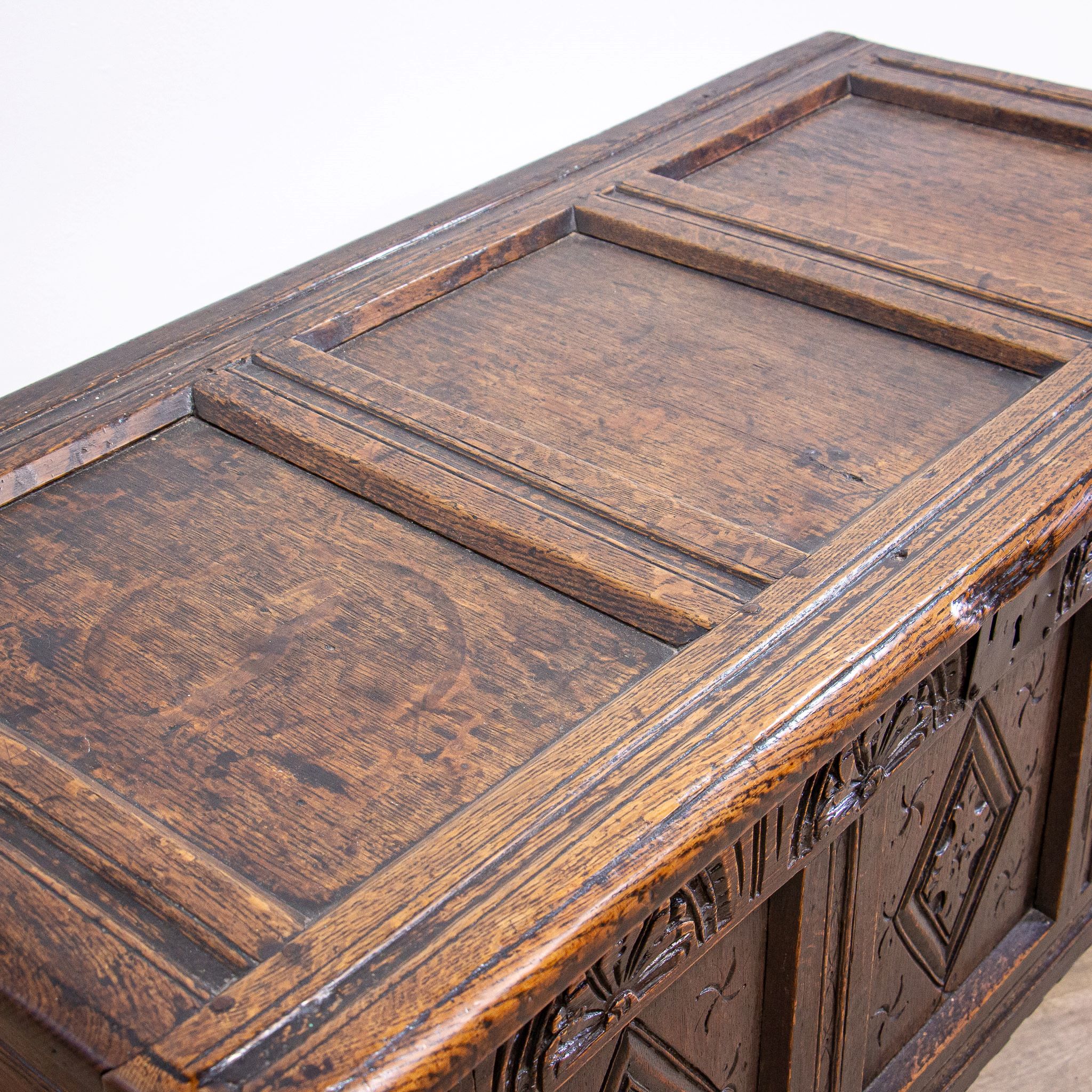 A beautifully carved 17th century oak coffer, this will make a great storage piece for any home.