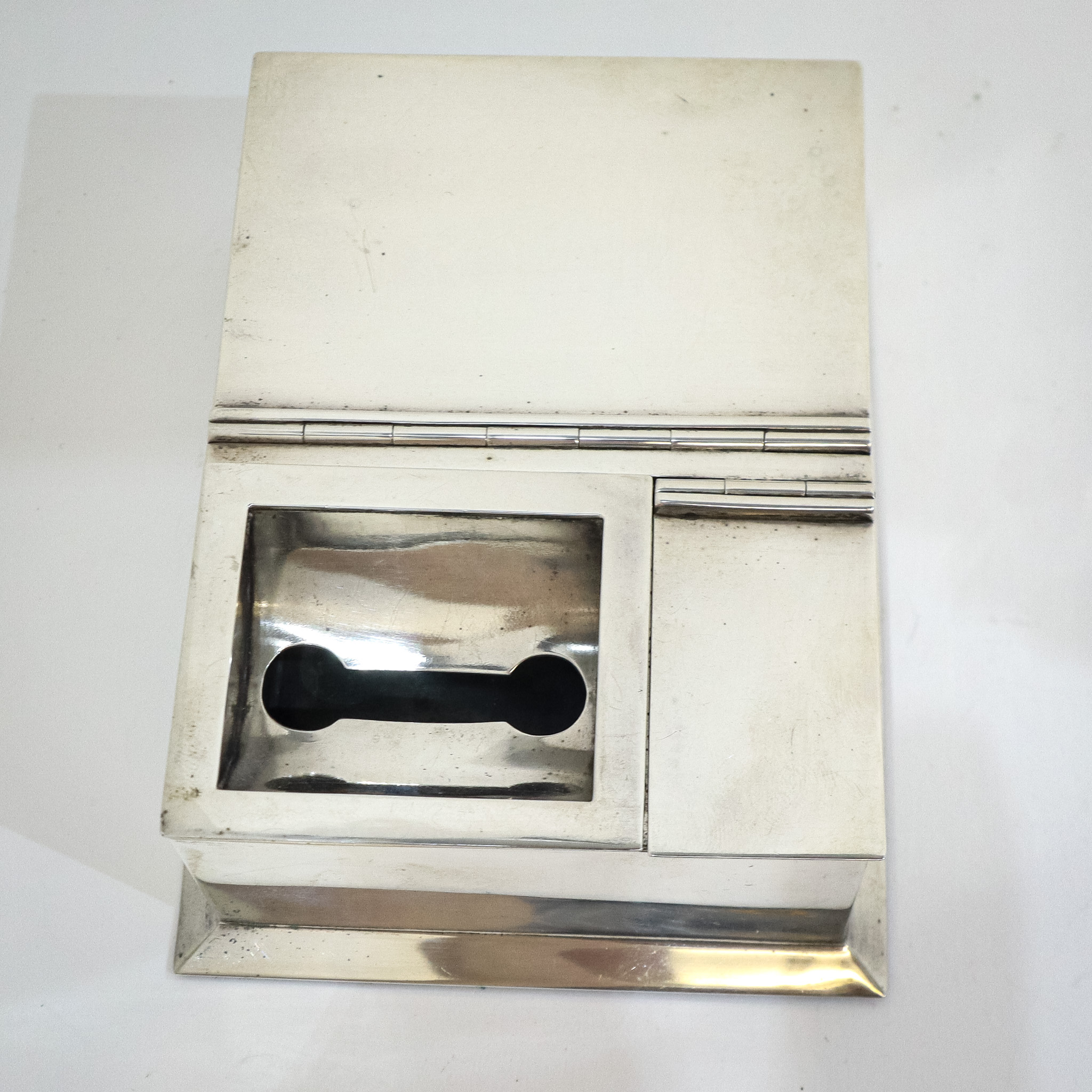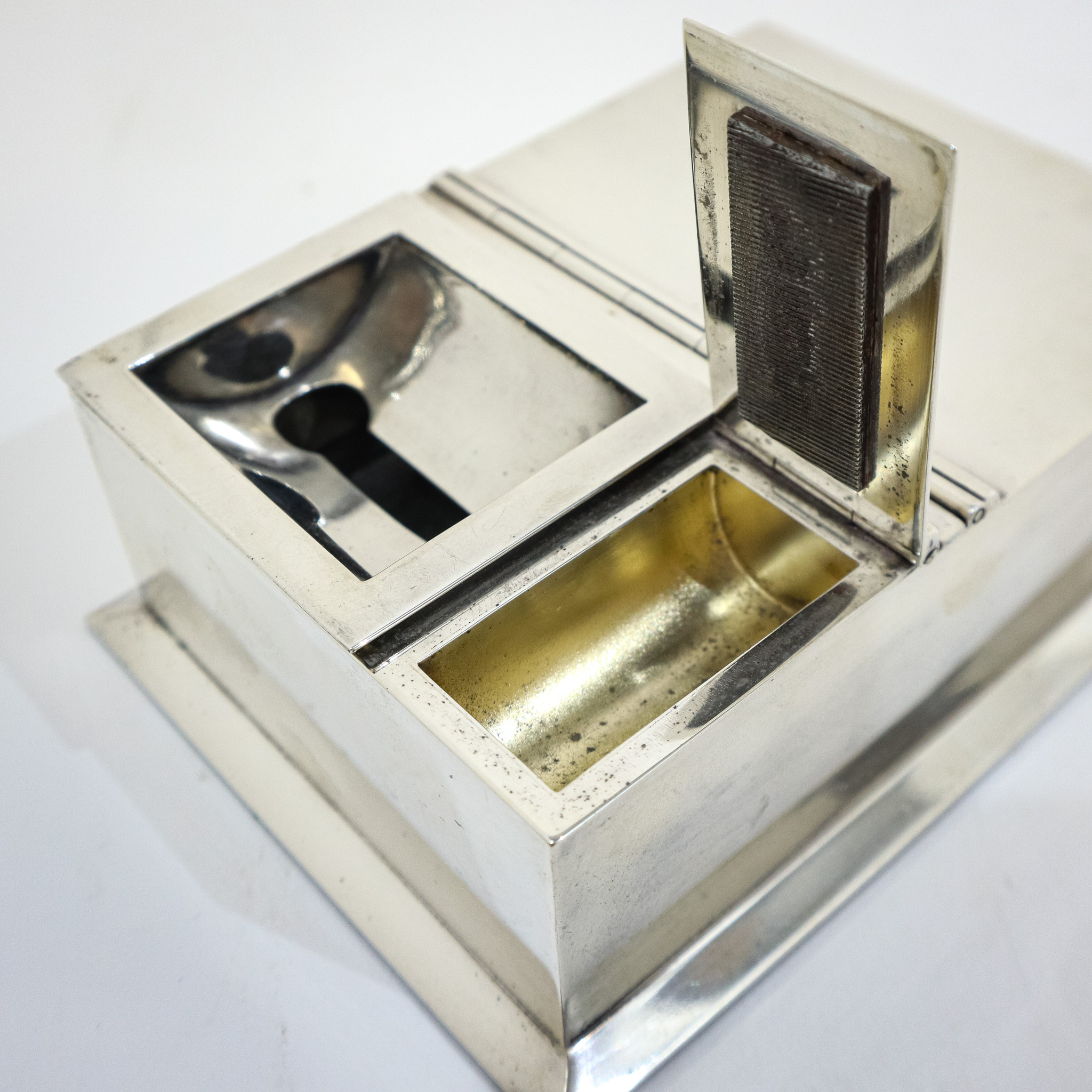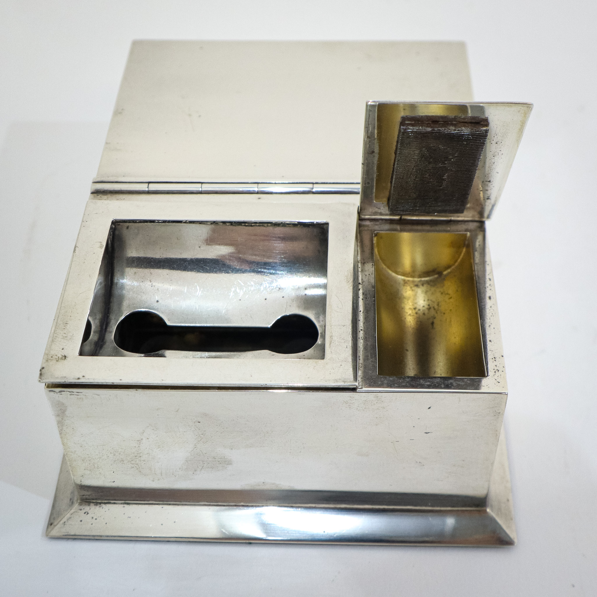A superb highly collectable piece of smoking memorabilia. This fantastic combination box has a compartment for cigarettes and another for holding matches. The lid of this compartment has a fitted striker. There is a well designed ashtray adjacent to it that finishes the piece beautifully. This is a testament to great craftsmanship and is indicative of its time.