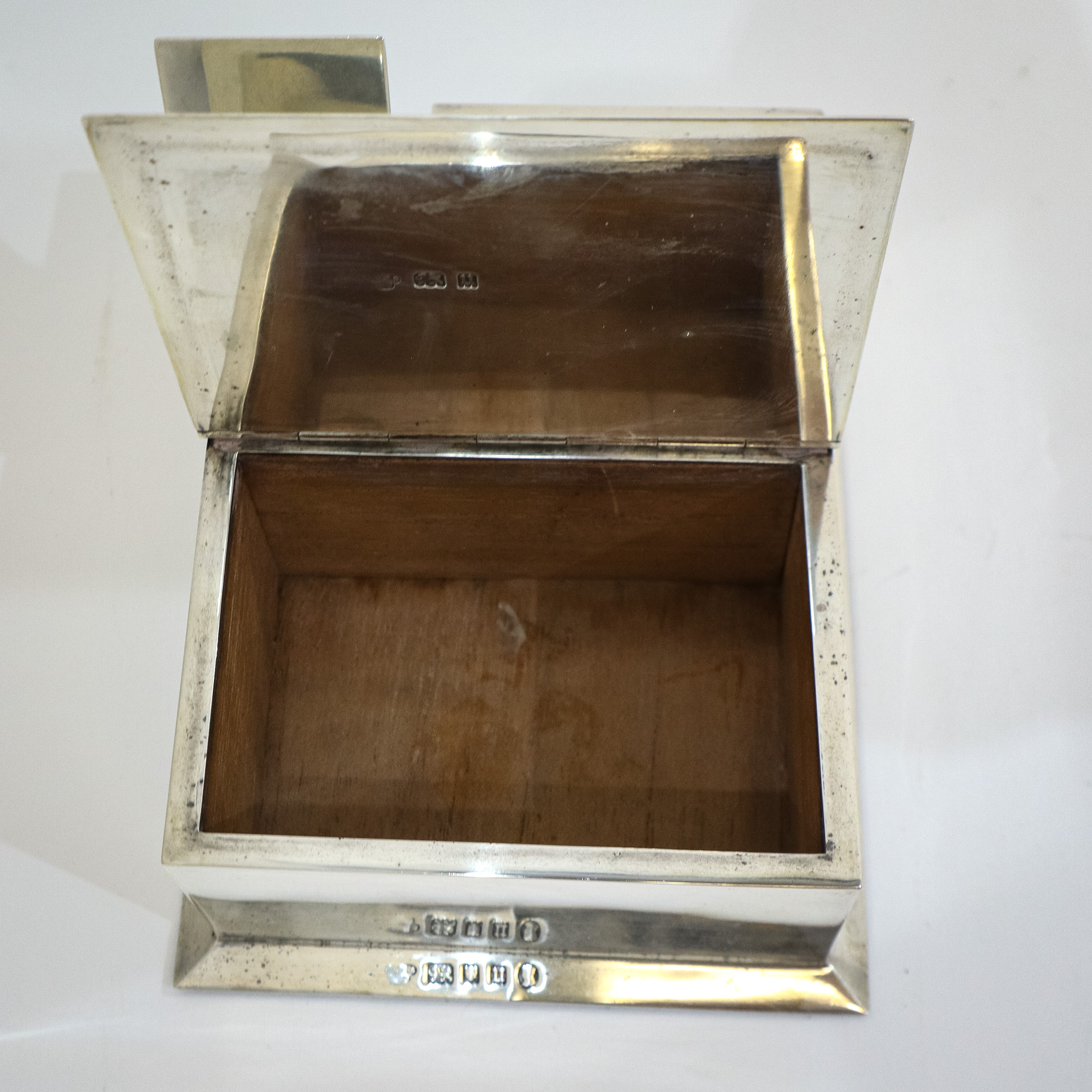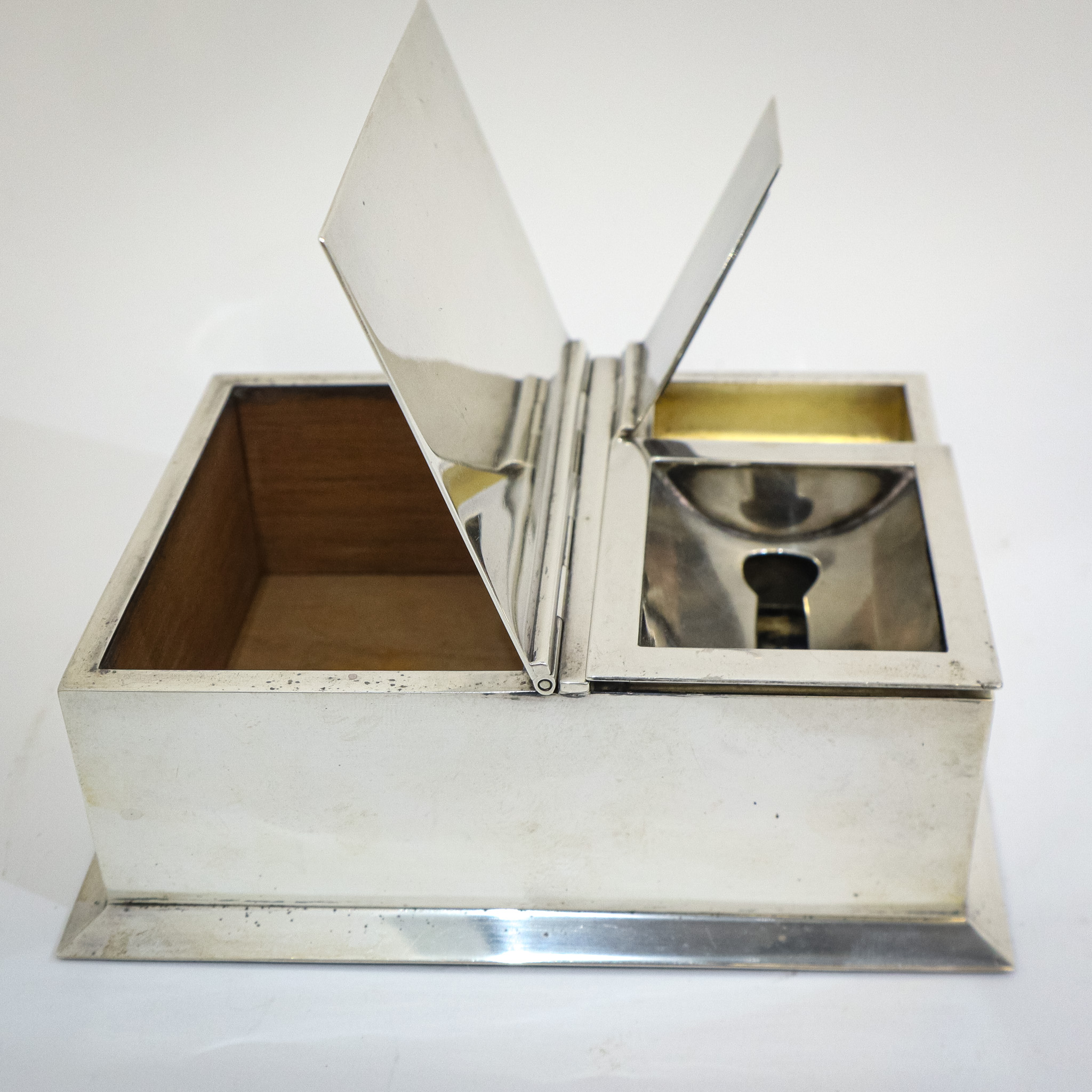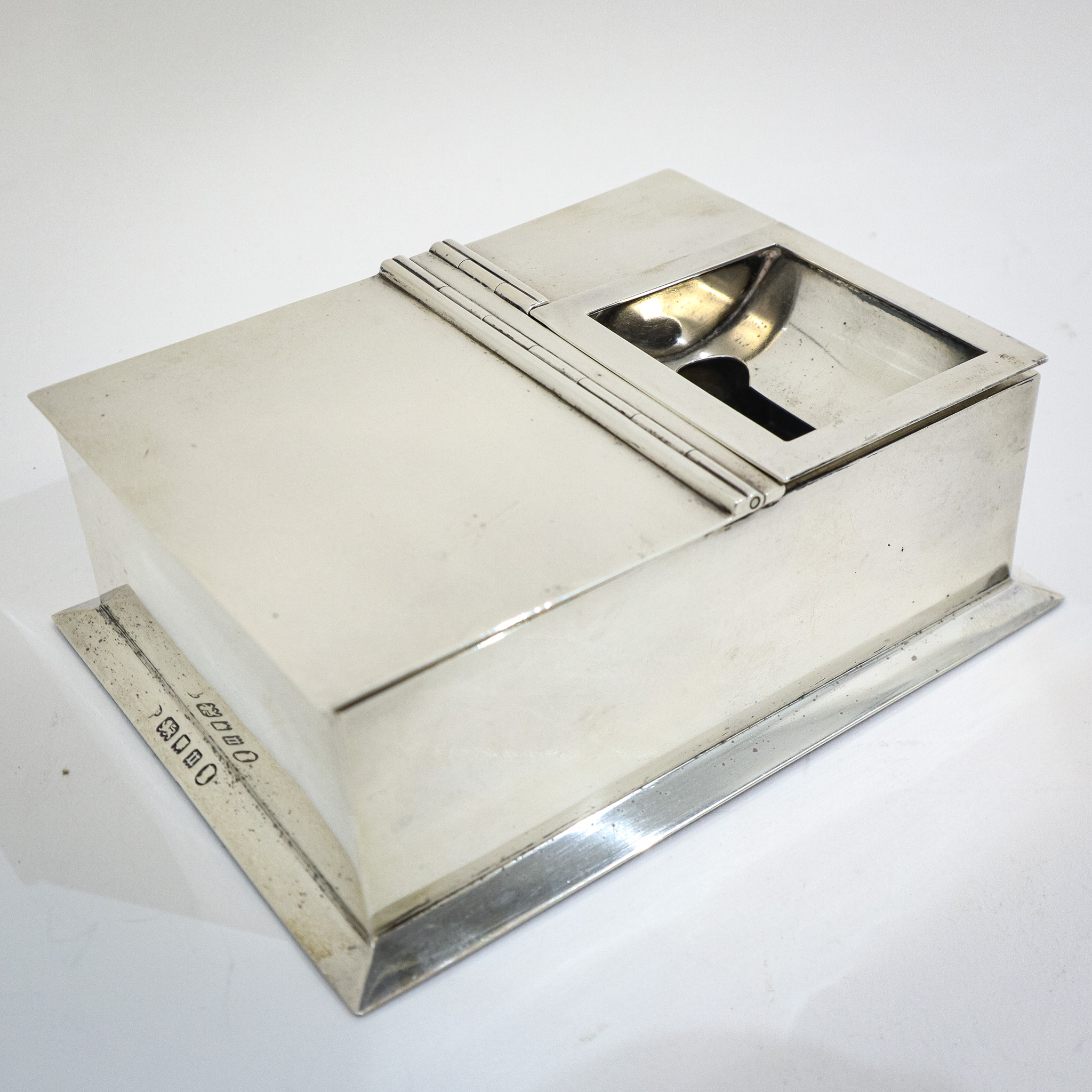 A superb highly collectable piece of smoking memorabilia. This fantastic combination box has a compartment for cigarettes and another for holding matches. The lid of this compartment has a fitted striker. There is a well designed ashtray adjacent to it that finishes the piece beautifully. This is a testament to great craftsmanship and is indicative of its time.