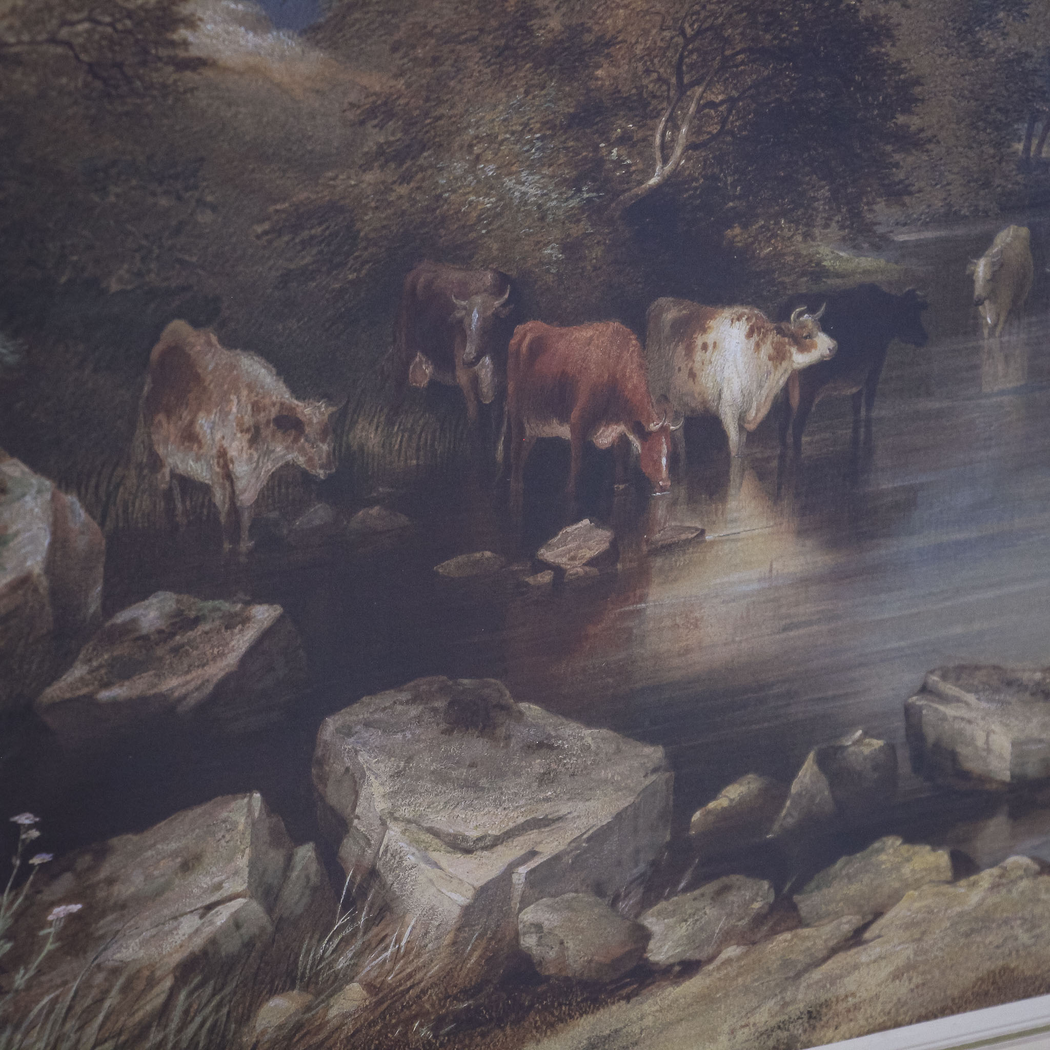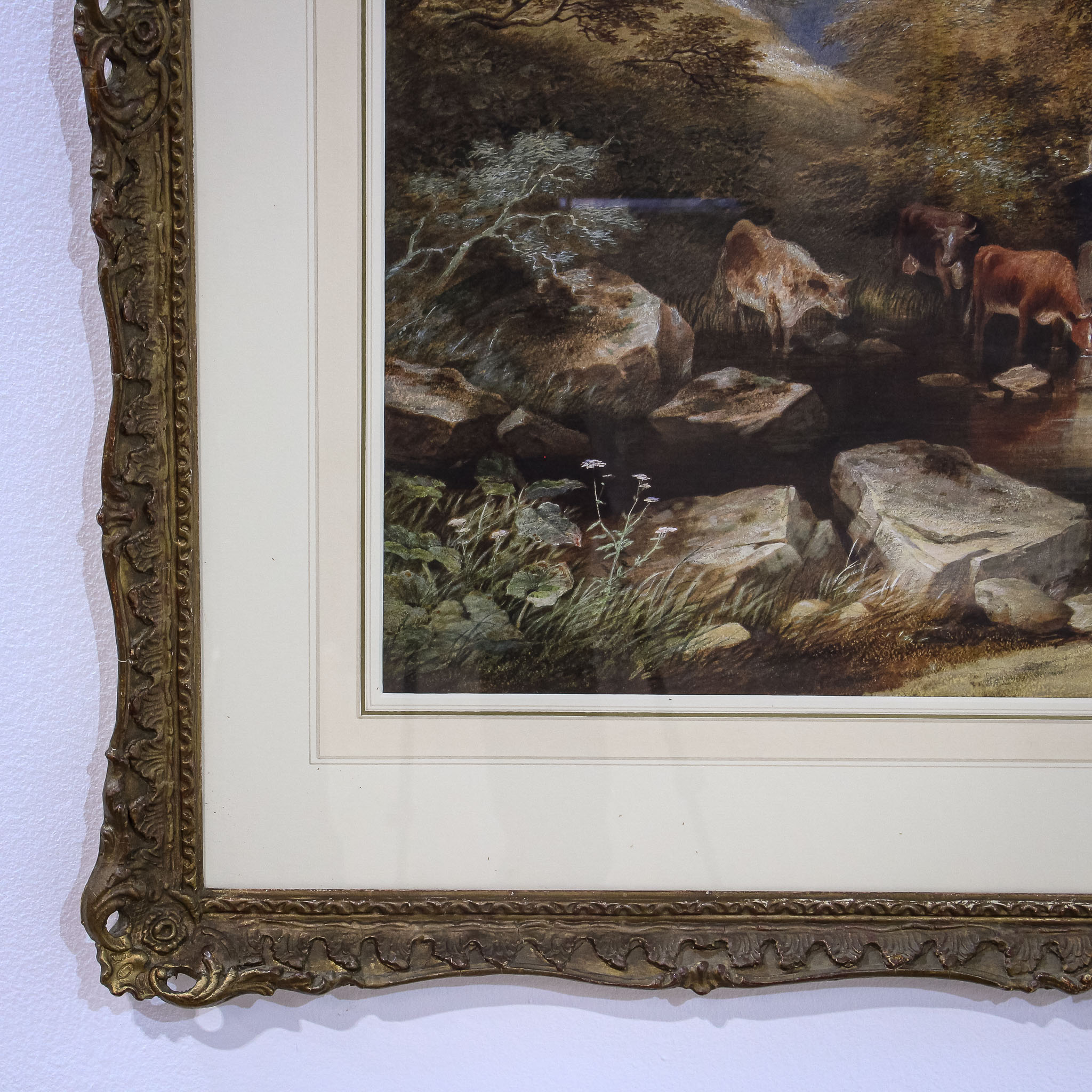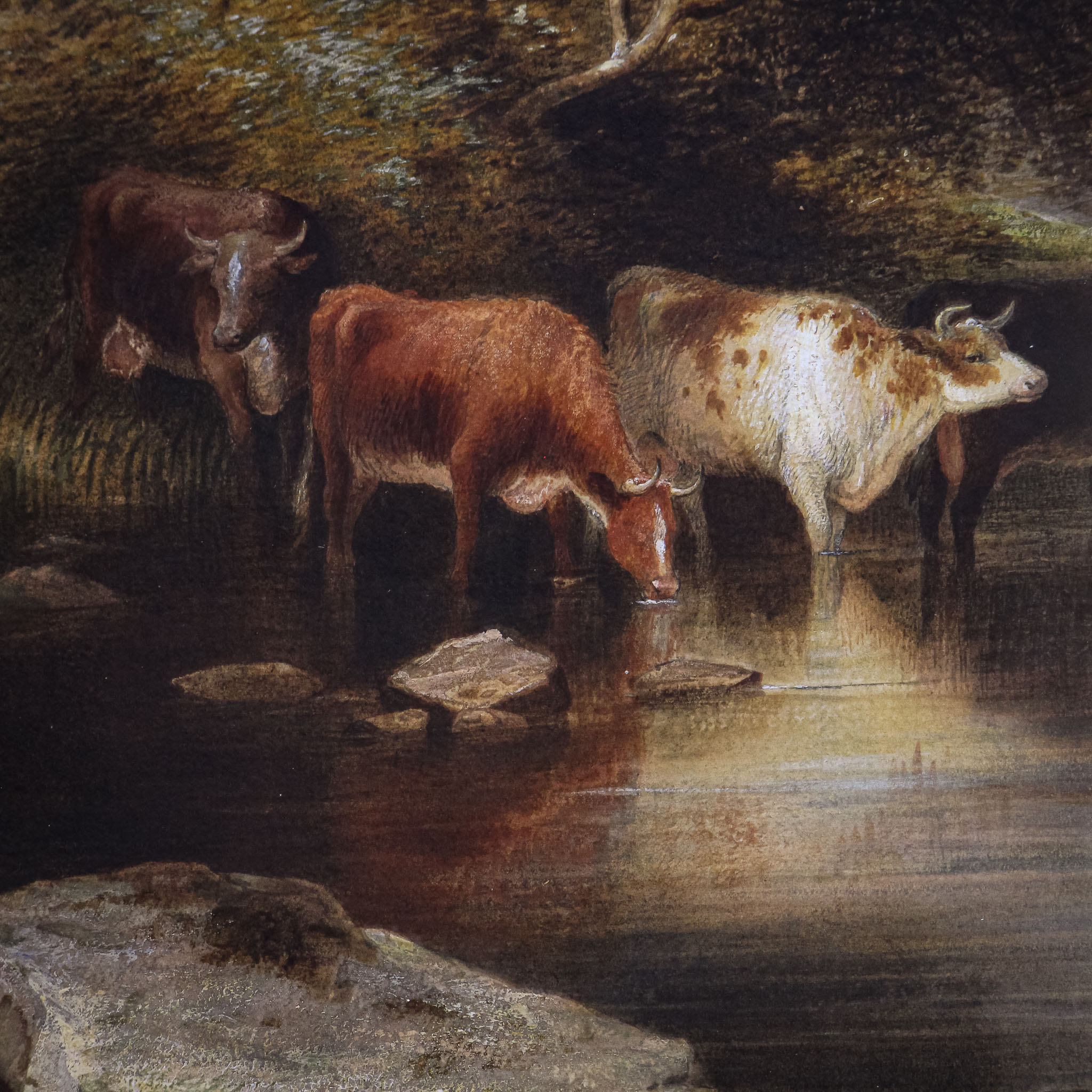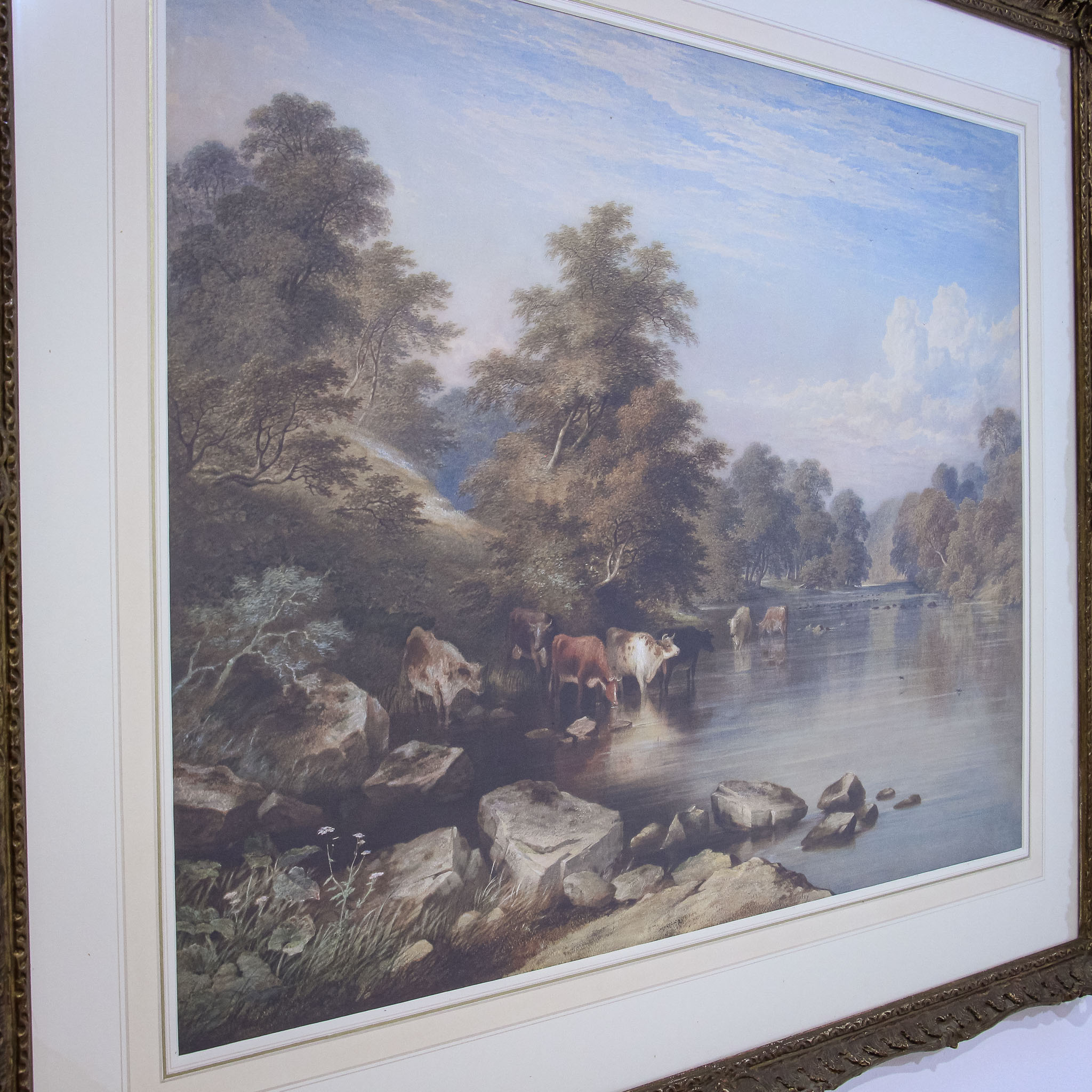 A wonderful Victorian watercolour by Charles Frederick Buckley (1812-1869), this is an atmospheric painting of cattle at the riverside. Buckley is known as a landscape watercolourist who produced scenes from across England. His work hangs in many galleries and museums, including the Victoria and Albert Museum (V & A) in London.