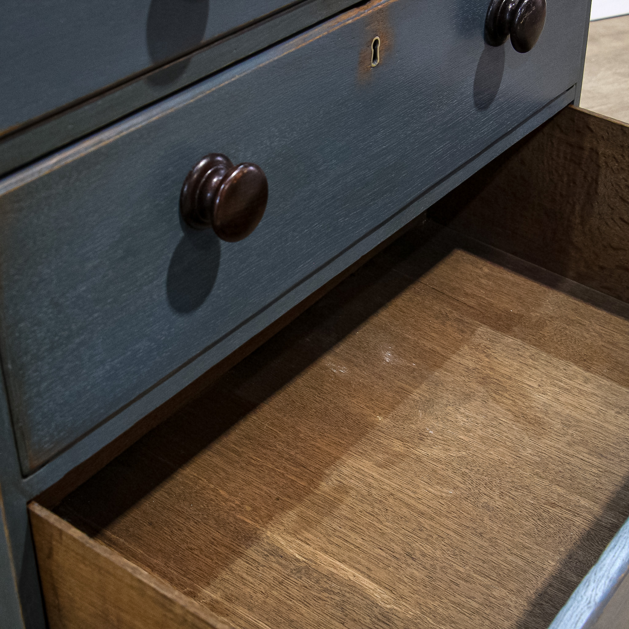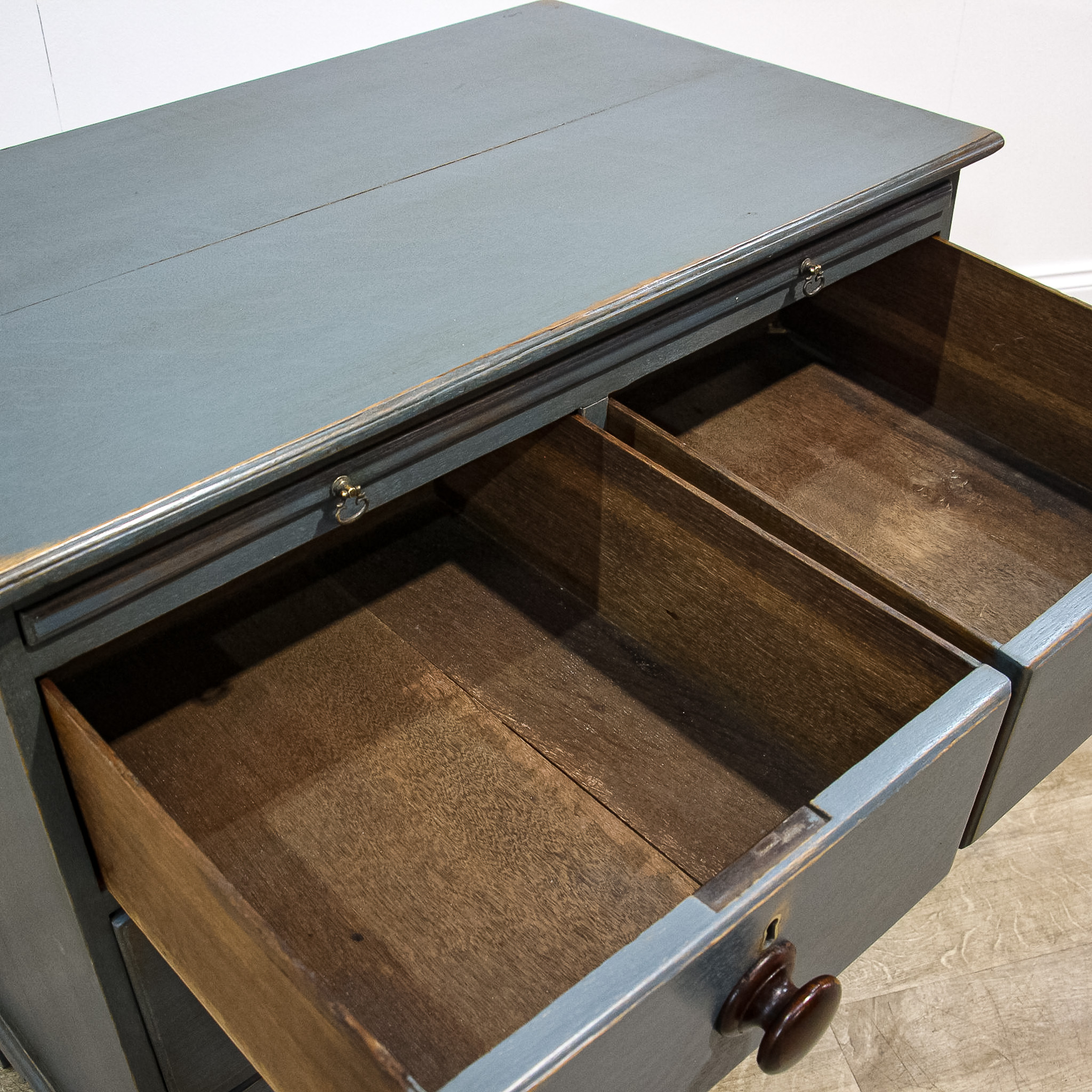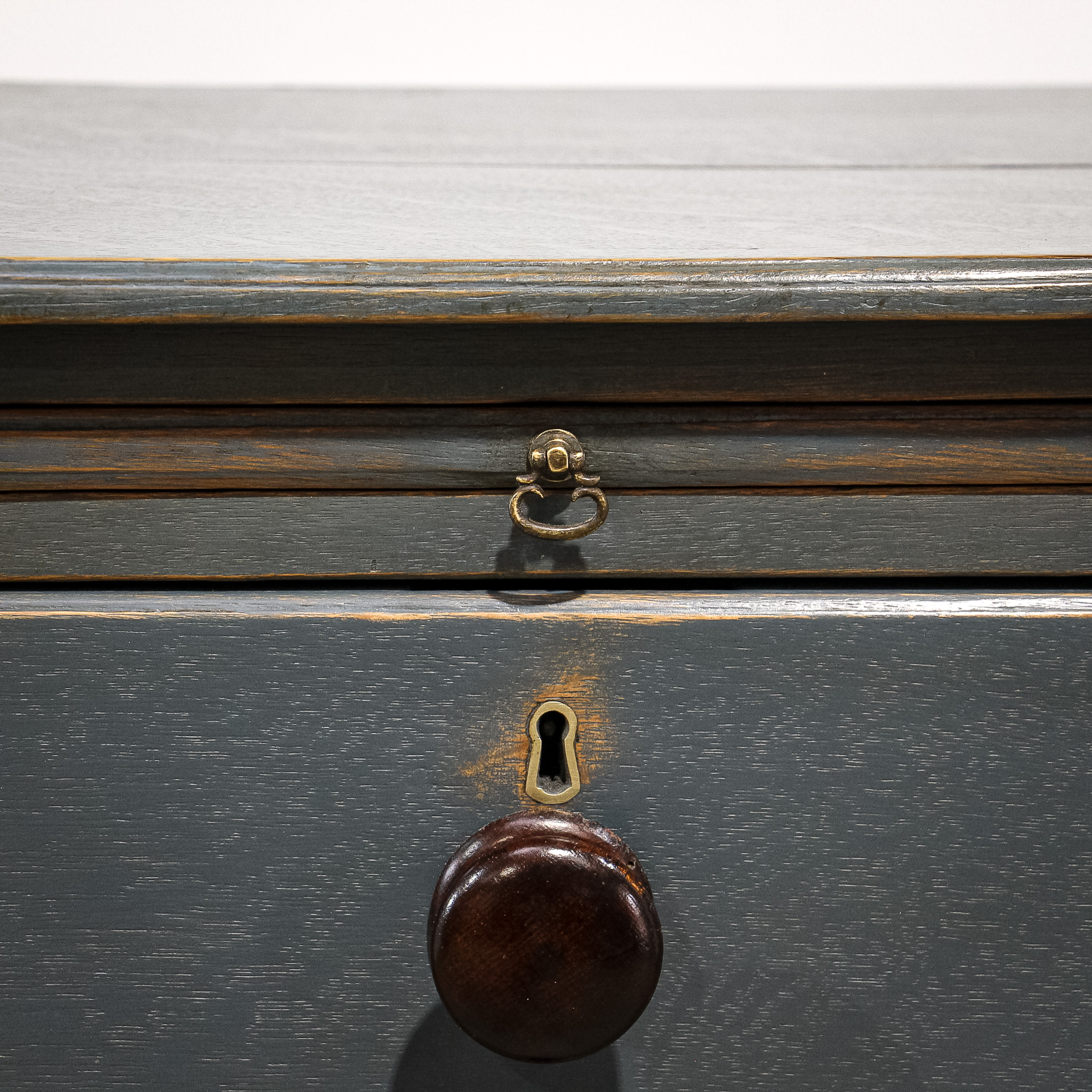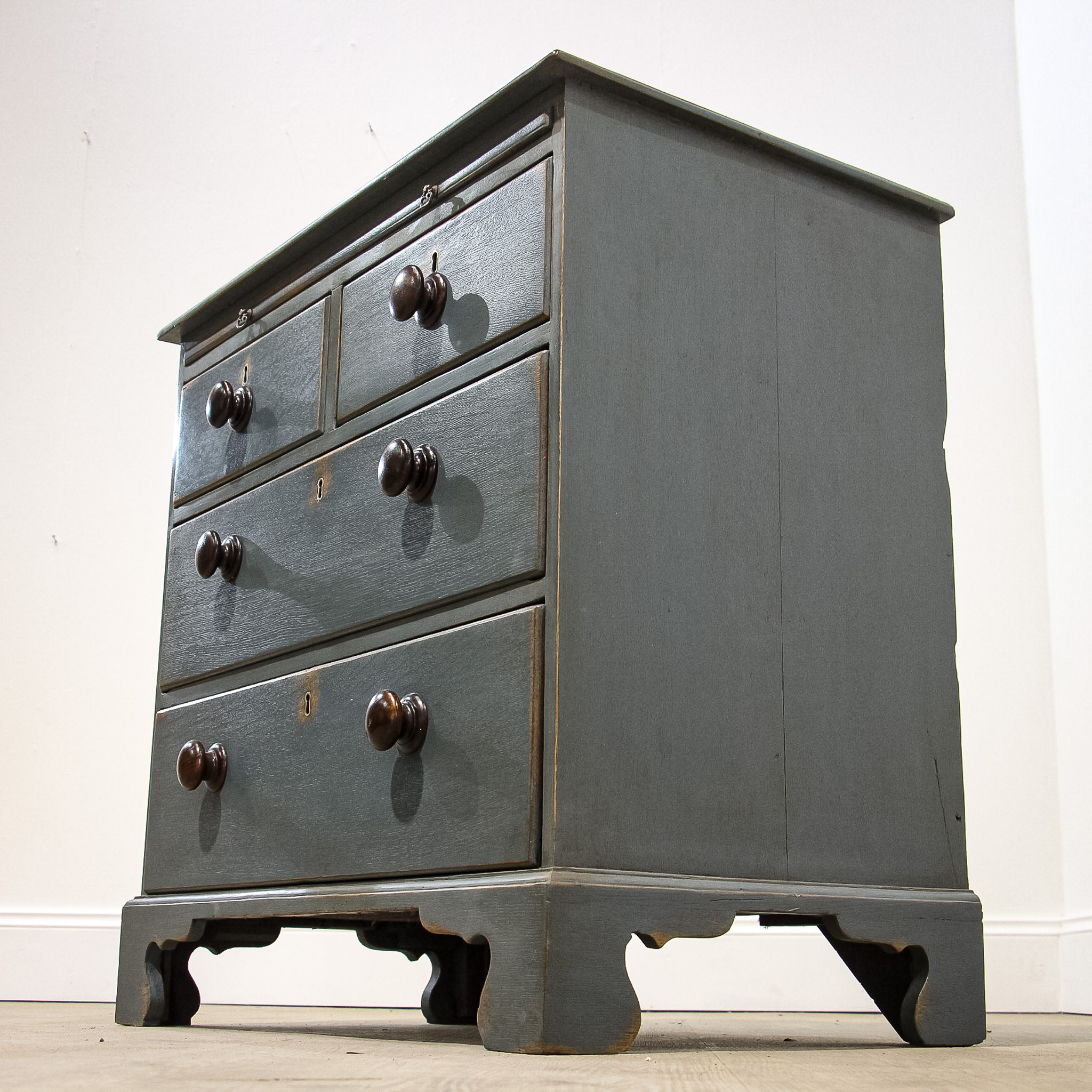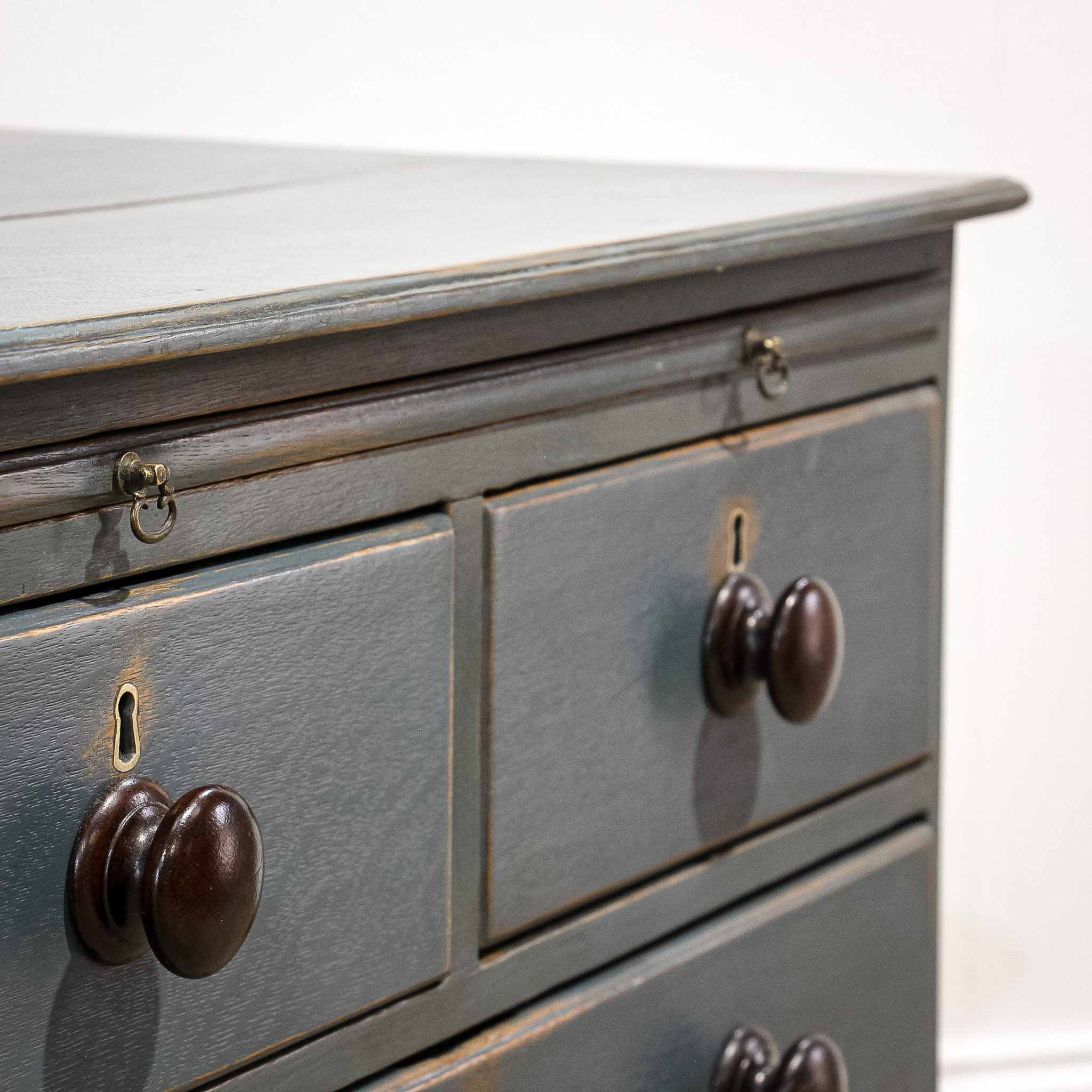 This fabulous little oak chest of drawers dates to around 1740 and has a rare, original brushing slide. Painted a dusky blue and waxed, it has an appeal for the modern home and is ideal for a smaller bedroom space, where the slide allows it to be used as a laptop desk.