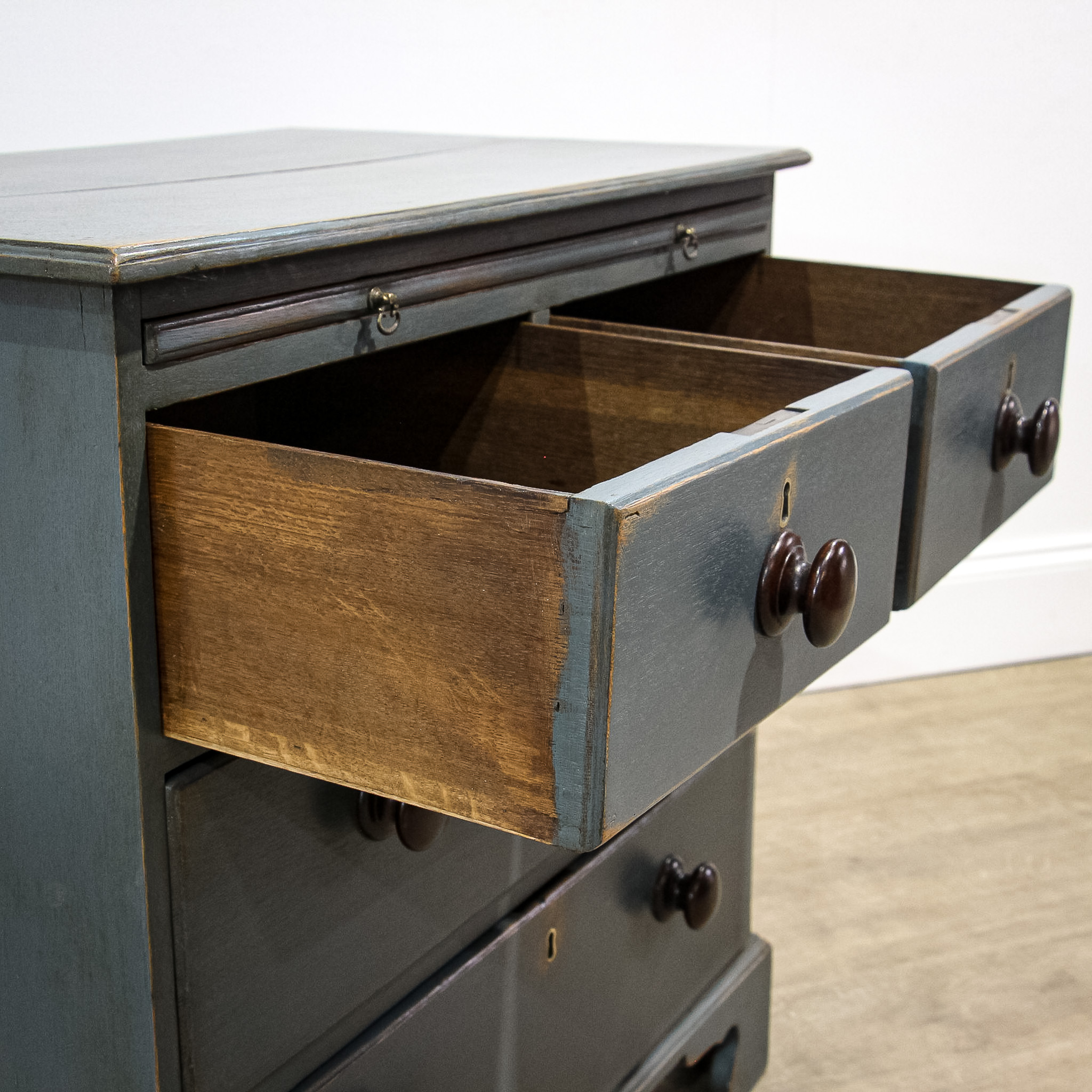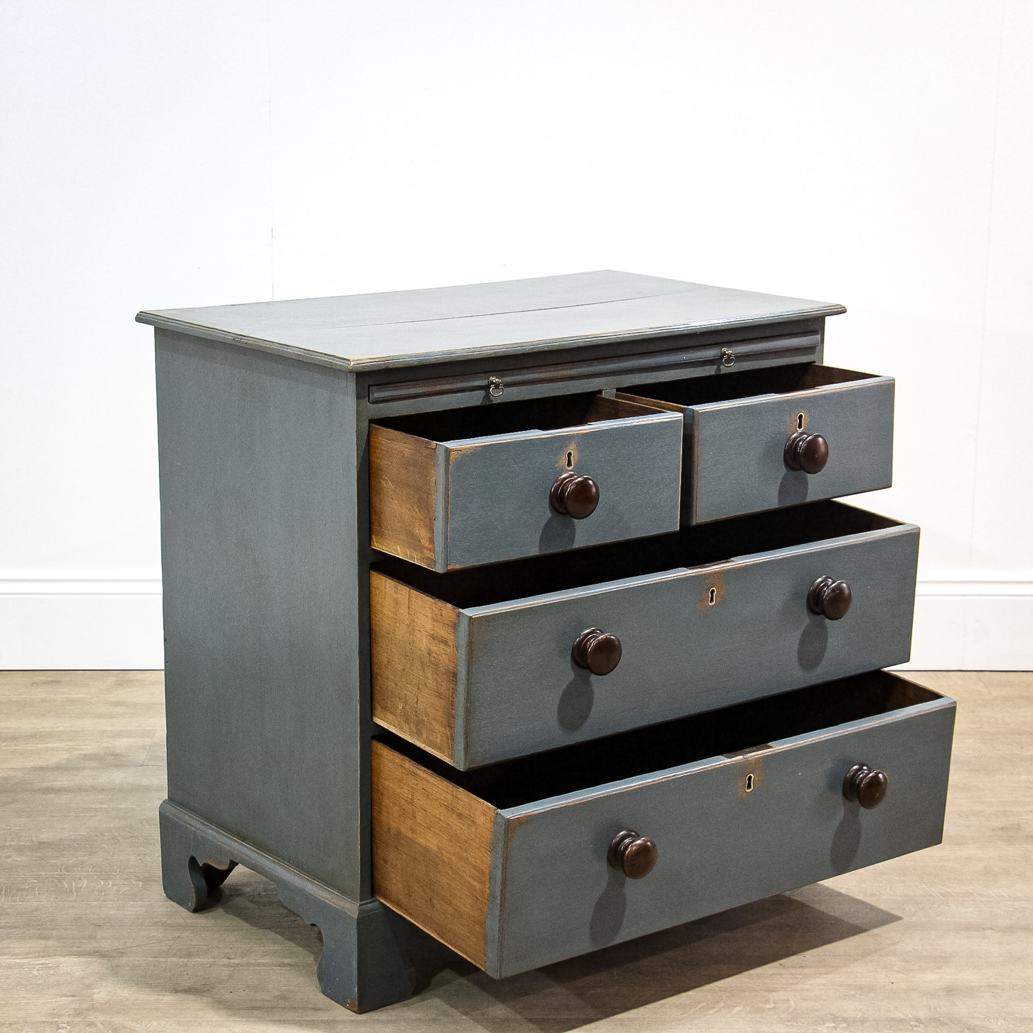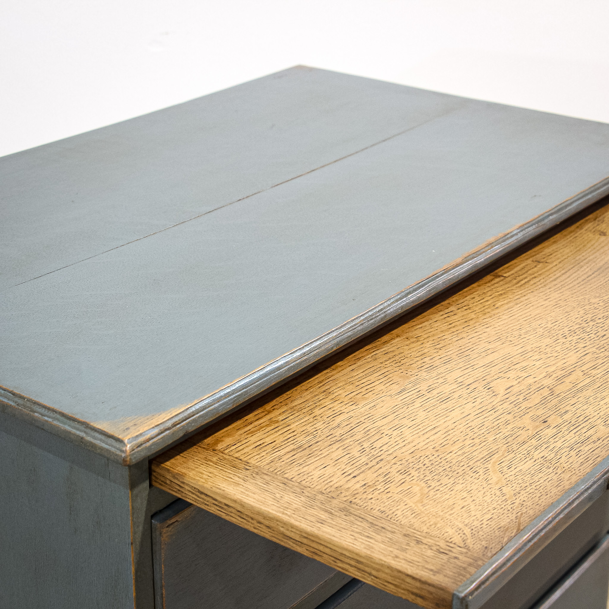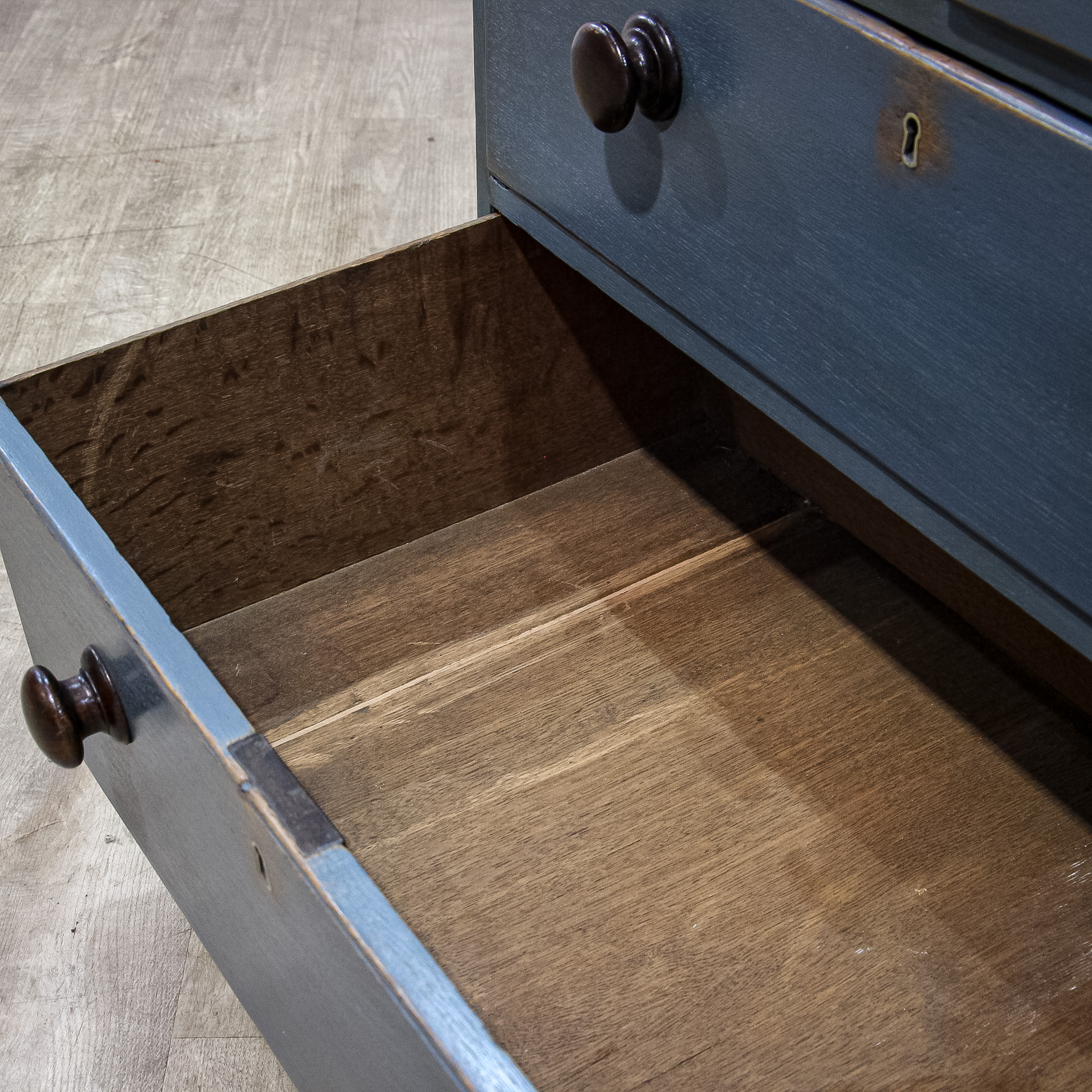 This fabulous little oak chest of drawers dates to around 1740 and has a rare, original brushing slide. Painted a dusky blue and waxed, it has an appeal for the modern home and is ideal for a smaller bedroom space, where the slide allows it to be used as a laptop desk.