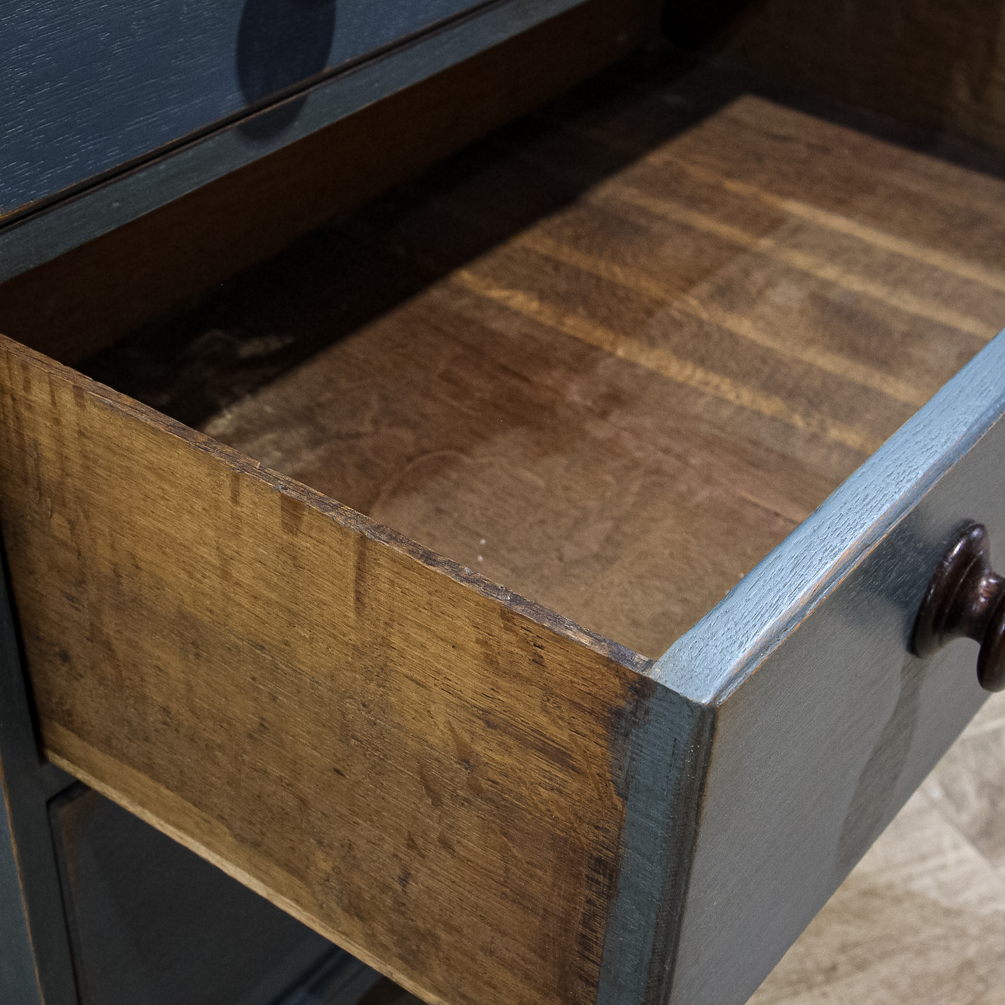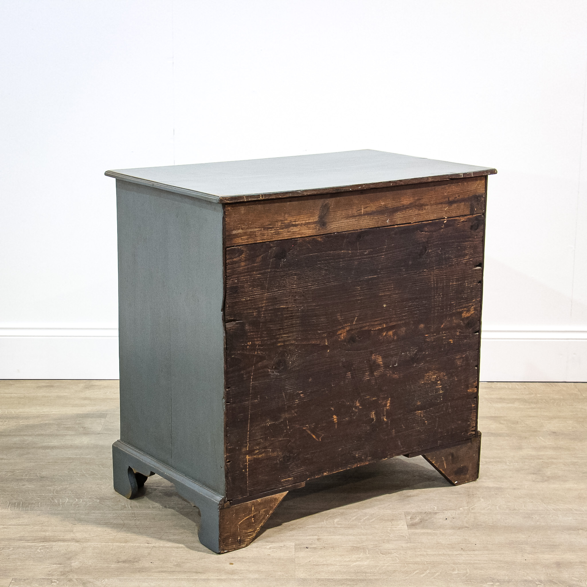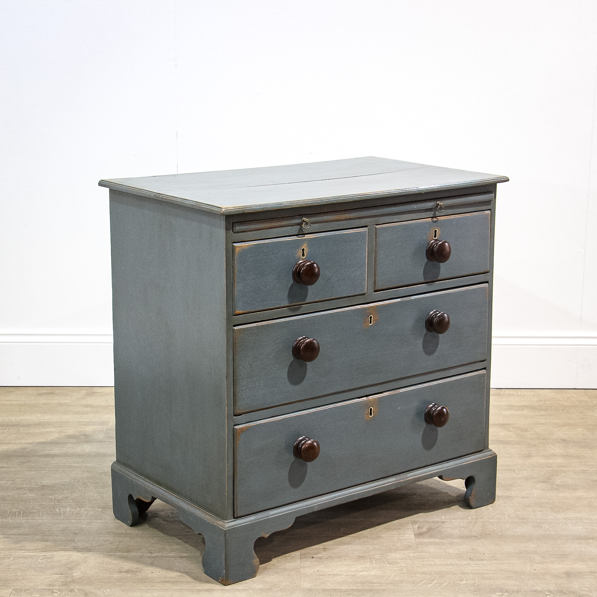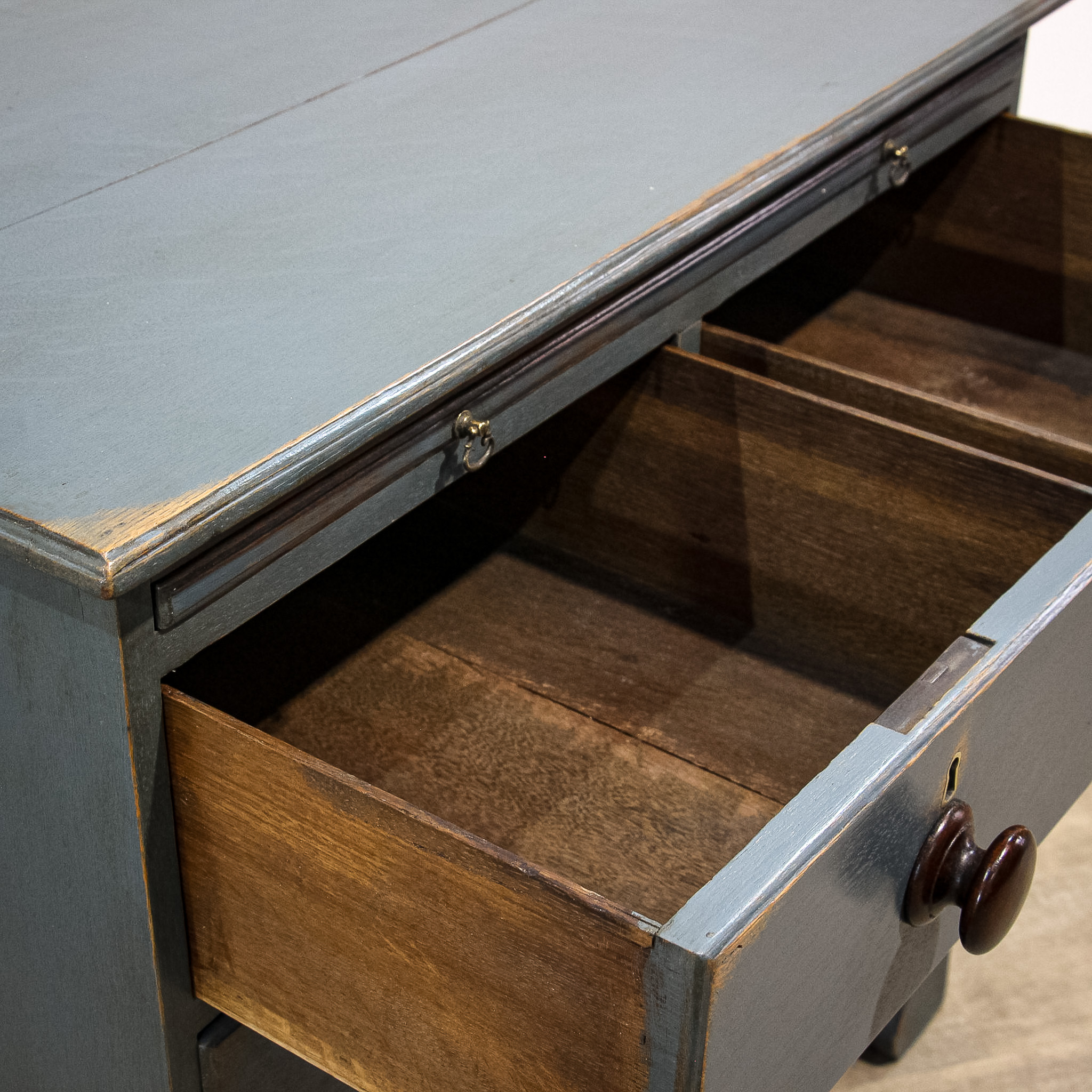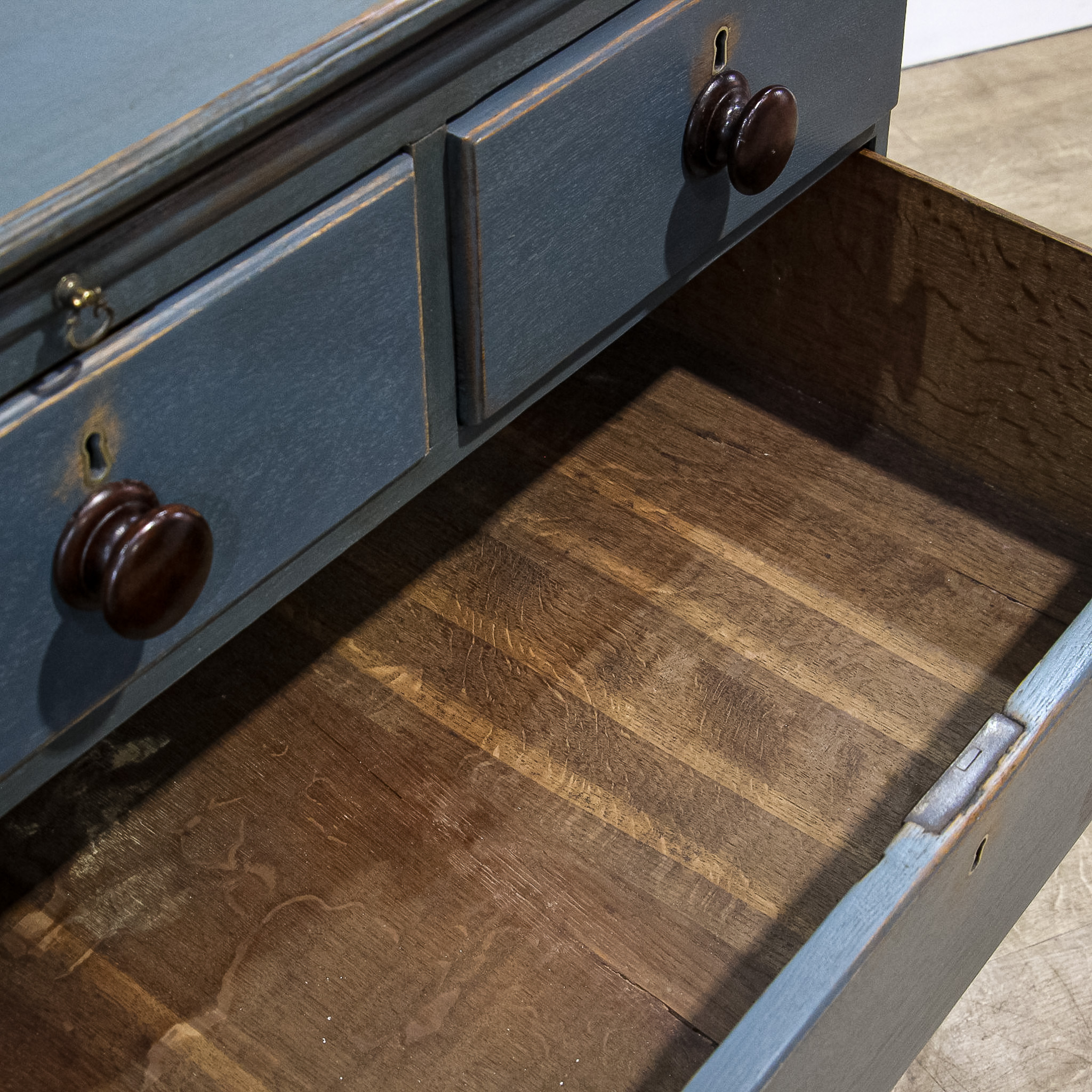 This fabulous little oak chest of drawers dates to around 1740 and has a rare, original brushing slide. Painted a dusky blue and waxed, it has an appeal for the modern home and is ideal for a smaller bedroom space, where the slide allows it to be used as a laptop desk.