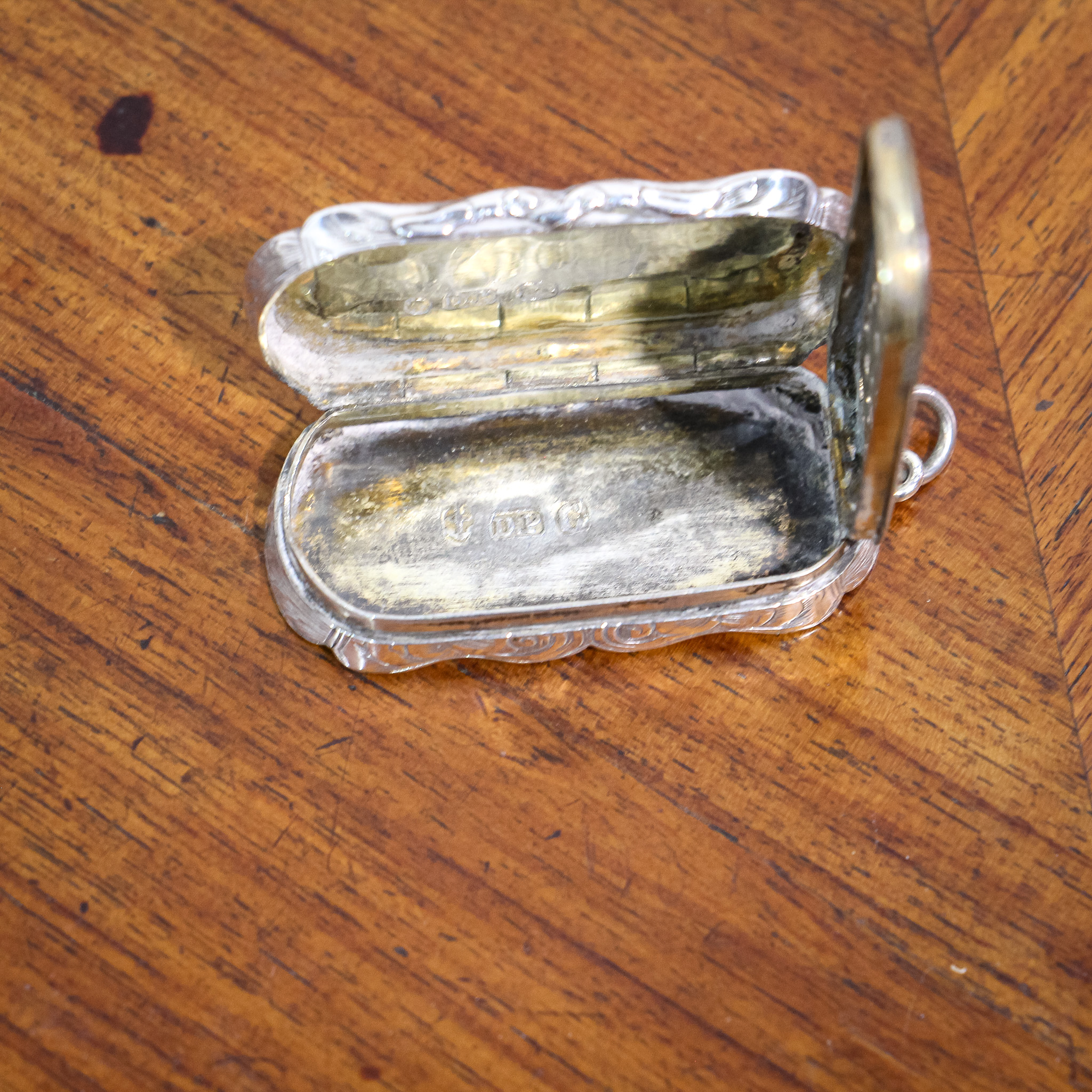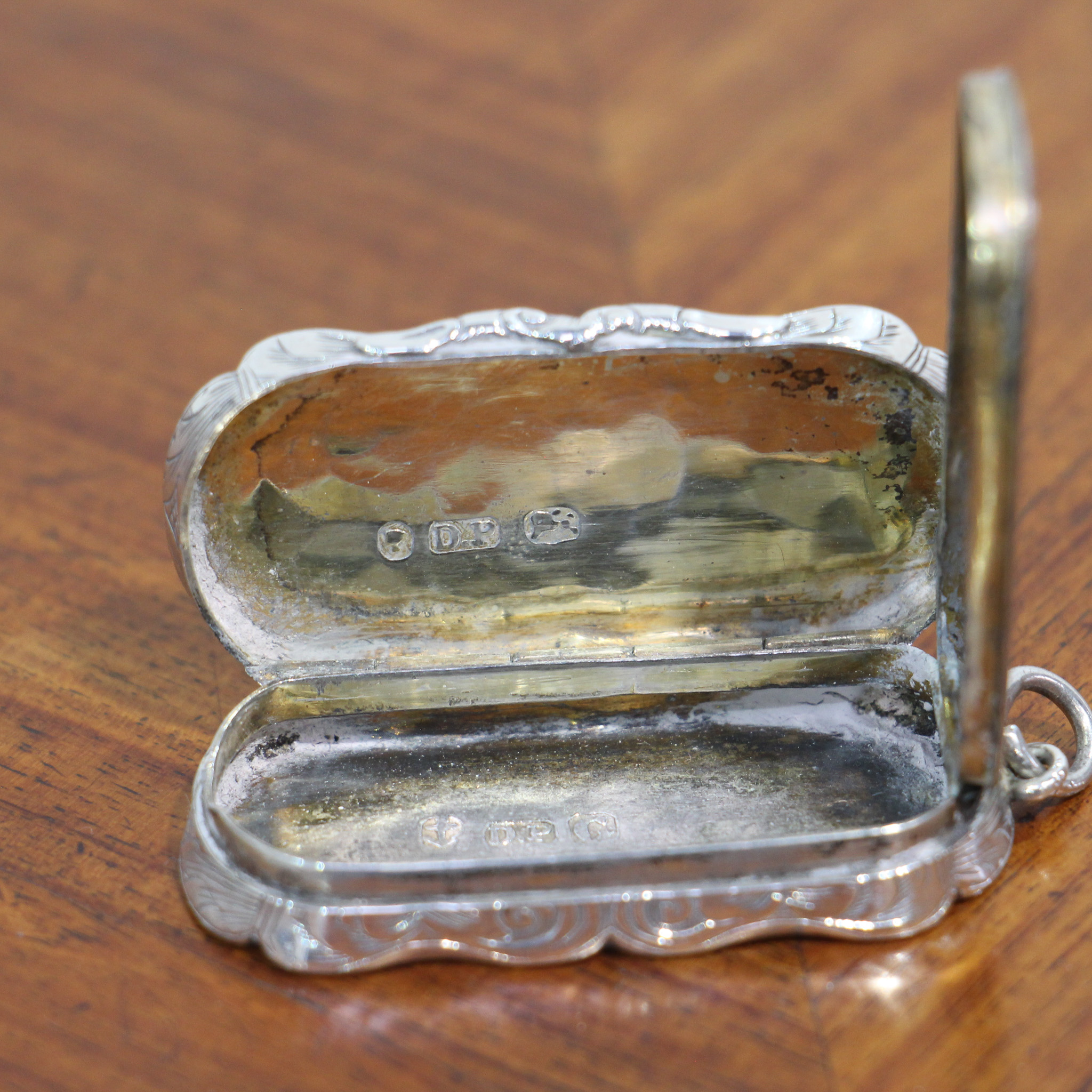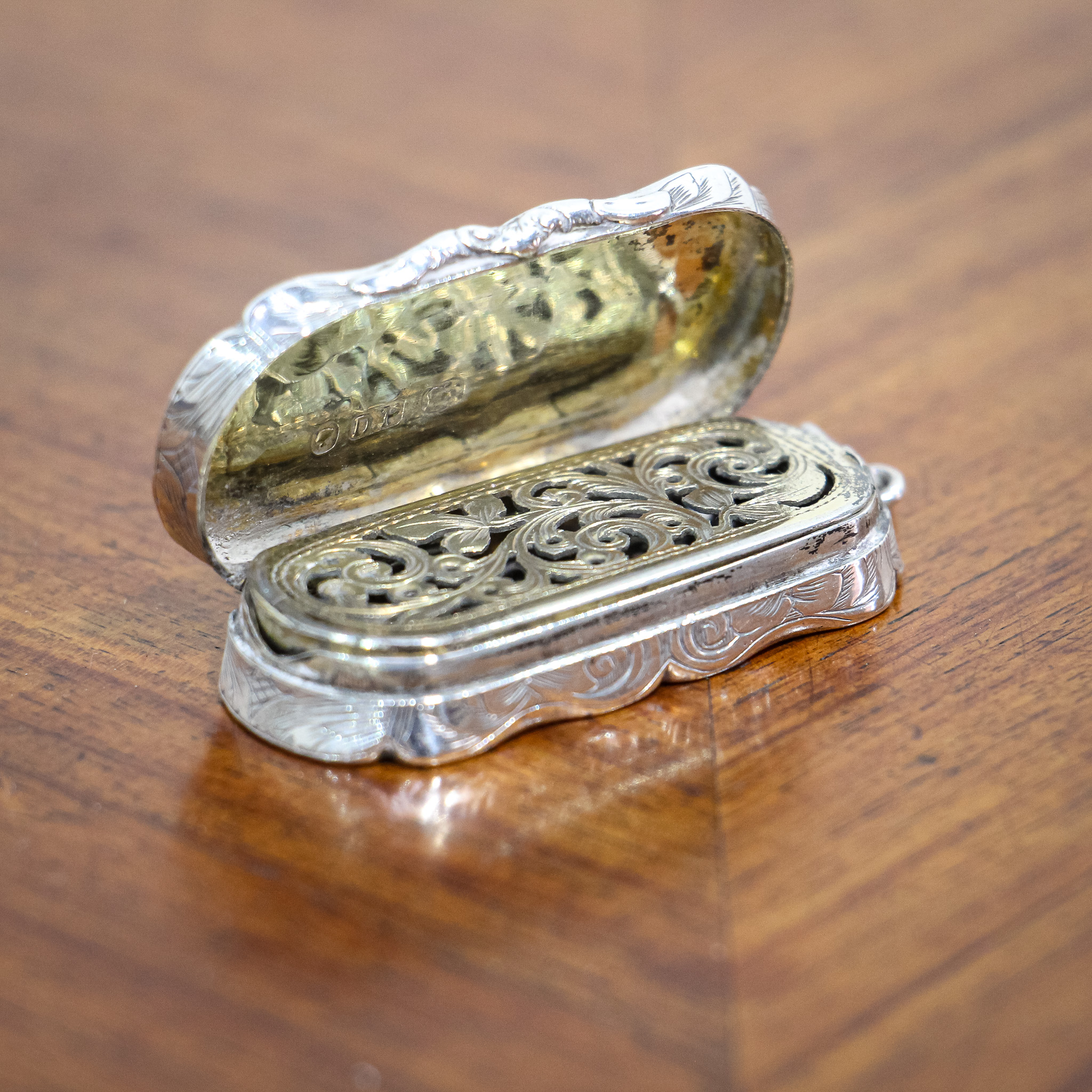 A beautiful little vinaigrette by David Pettifer. The piece is wonderfully decorated with some detailed scroll work upon a body with an unusual waved body. The gilded interior holds an equally detailed gilded grill. The piece is hallmarked for Birmingham 1851.