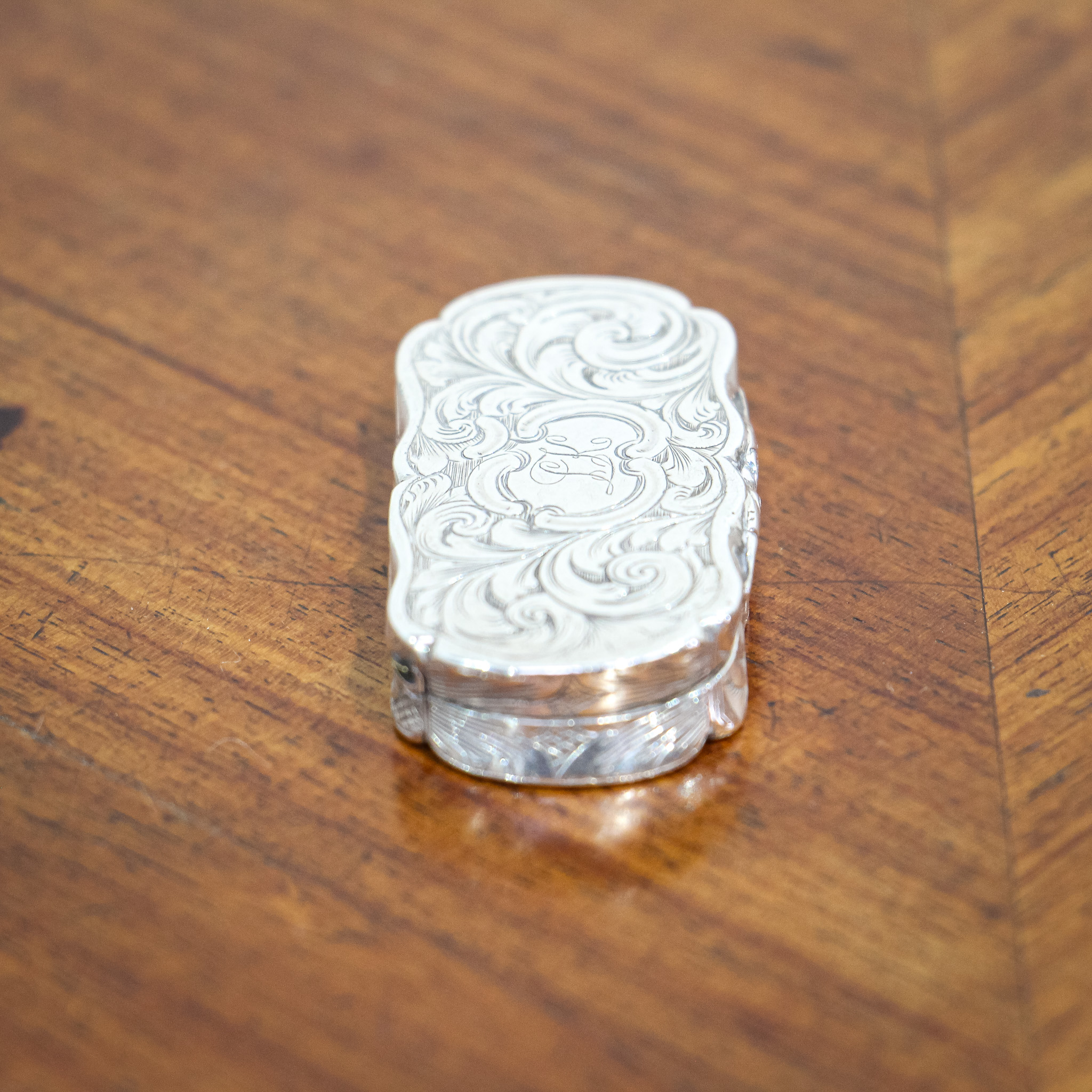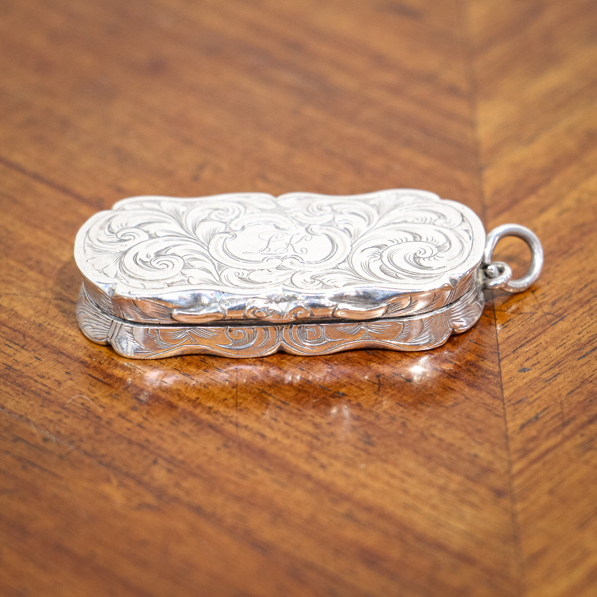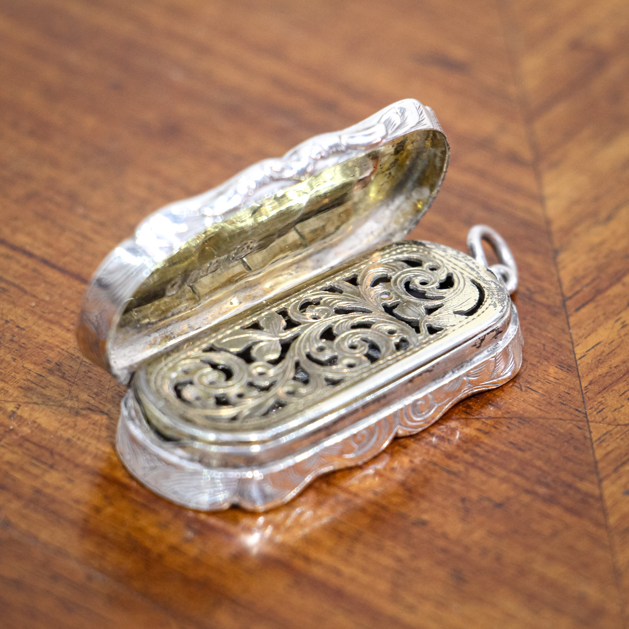 A beautiful little vinaigrette by David Pettifer. The piece is wonderfully decorated with some detailed scroll work upon a body with an unusual waved body. The gilded interior holds an equally detailed gilded grill. The piece is hallmarked for Birmingham 1851.