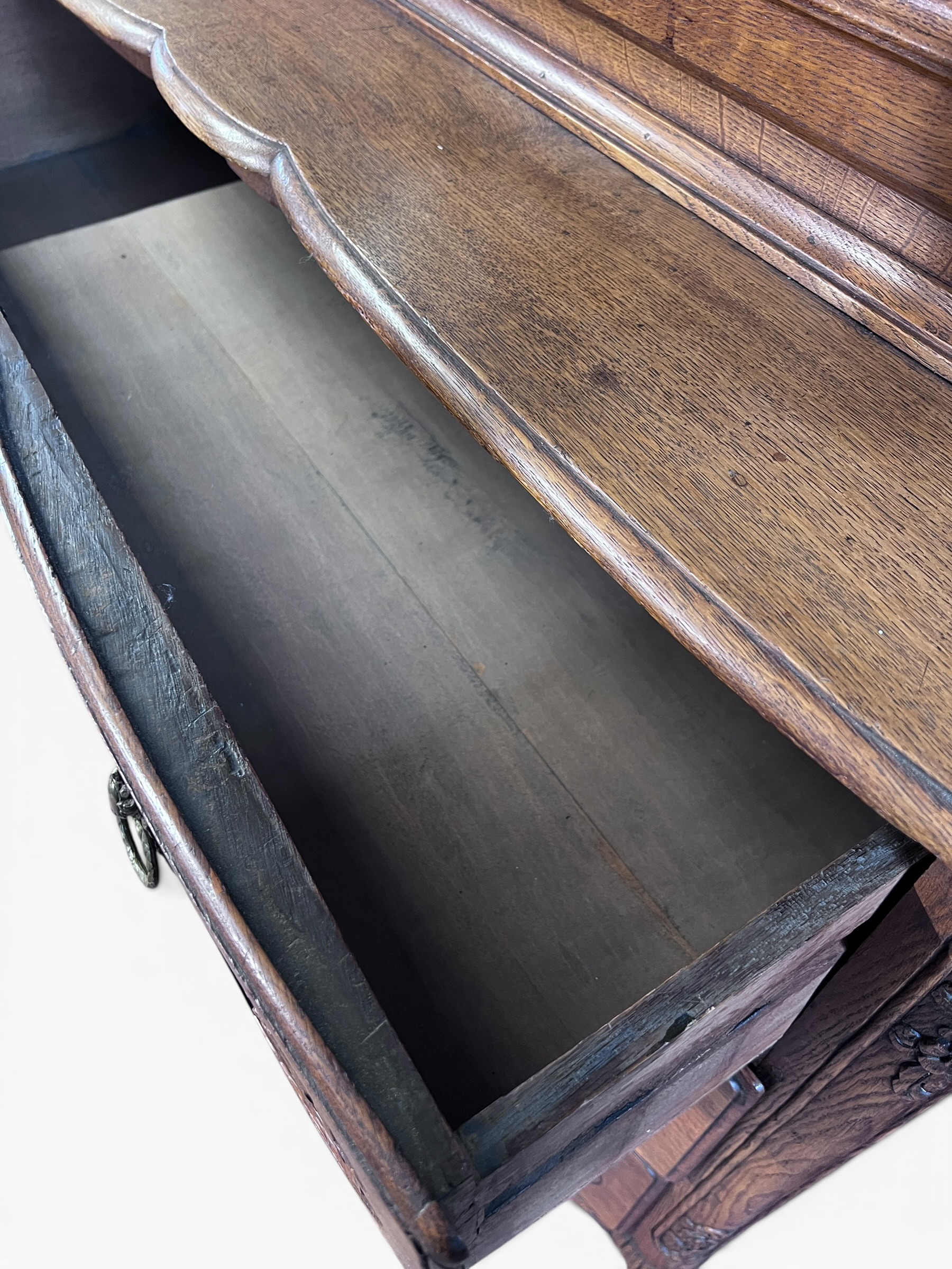 A magnificent item of French furniture, this 18th century oak piece is in two parts, with a glazed vitrine or display cabinet at the top and drawers beneath. It will look stunning in a large room and is a wonderful quality antique.