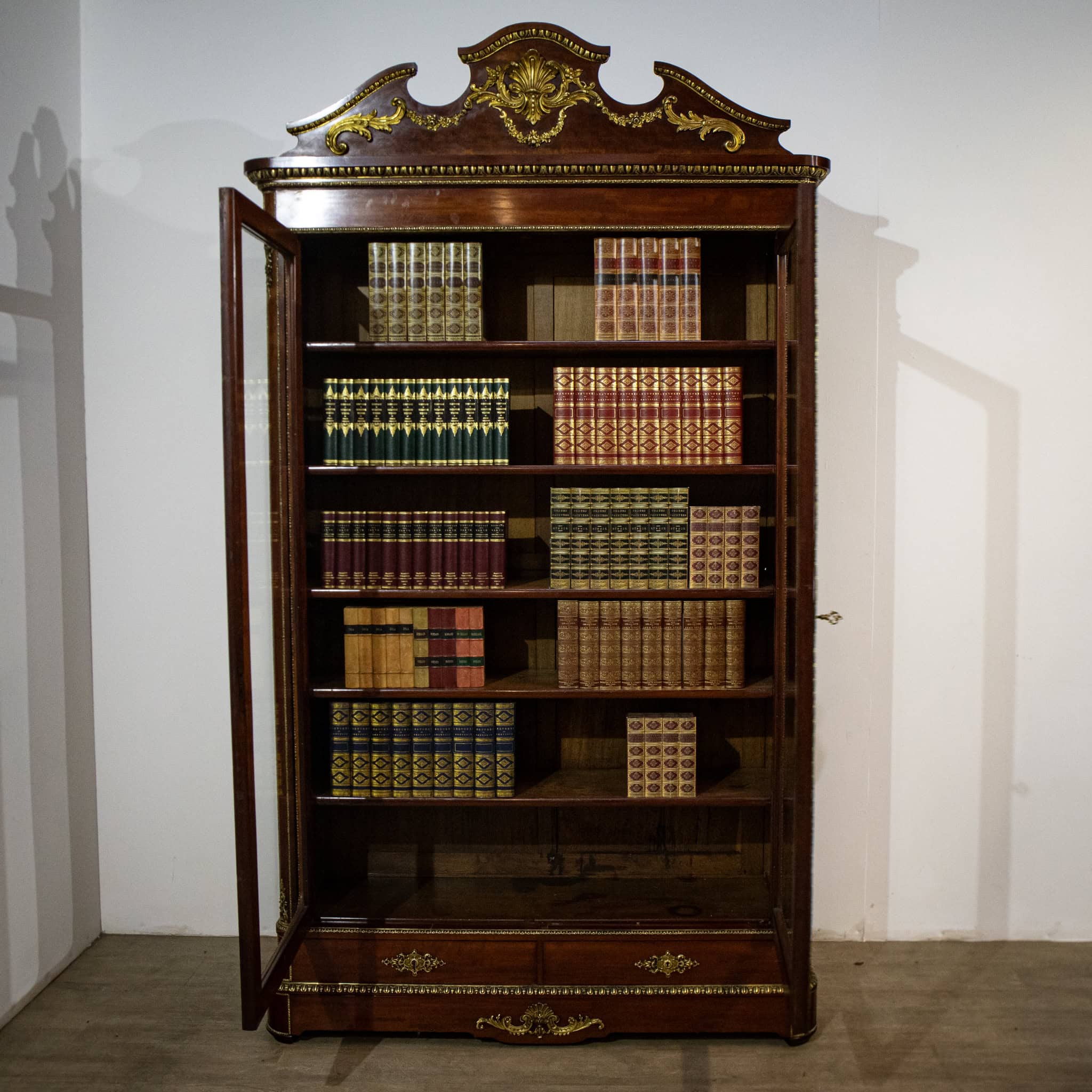 A magnificent 19th century glazed bookcase from the period of Napoleon III, this piece is of exceptional quality. In line with French practice of the time, it is designed to be dismantled to allow easy transport and installation. With five adjustable shelves on saw tooth brackets, it has three drawers at the bottom, two short and lockable over one longer. The ormolu decoration includes egg and dart borders, along with leaf pattern surrounds on the doors and an ornamented broken top pediment. The lock for the doors is a quality vertical mechanism with a full length brass backing plate. This splendid piece will make a wonderful addition to any period interior.