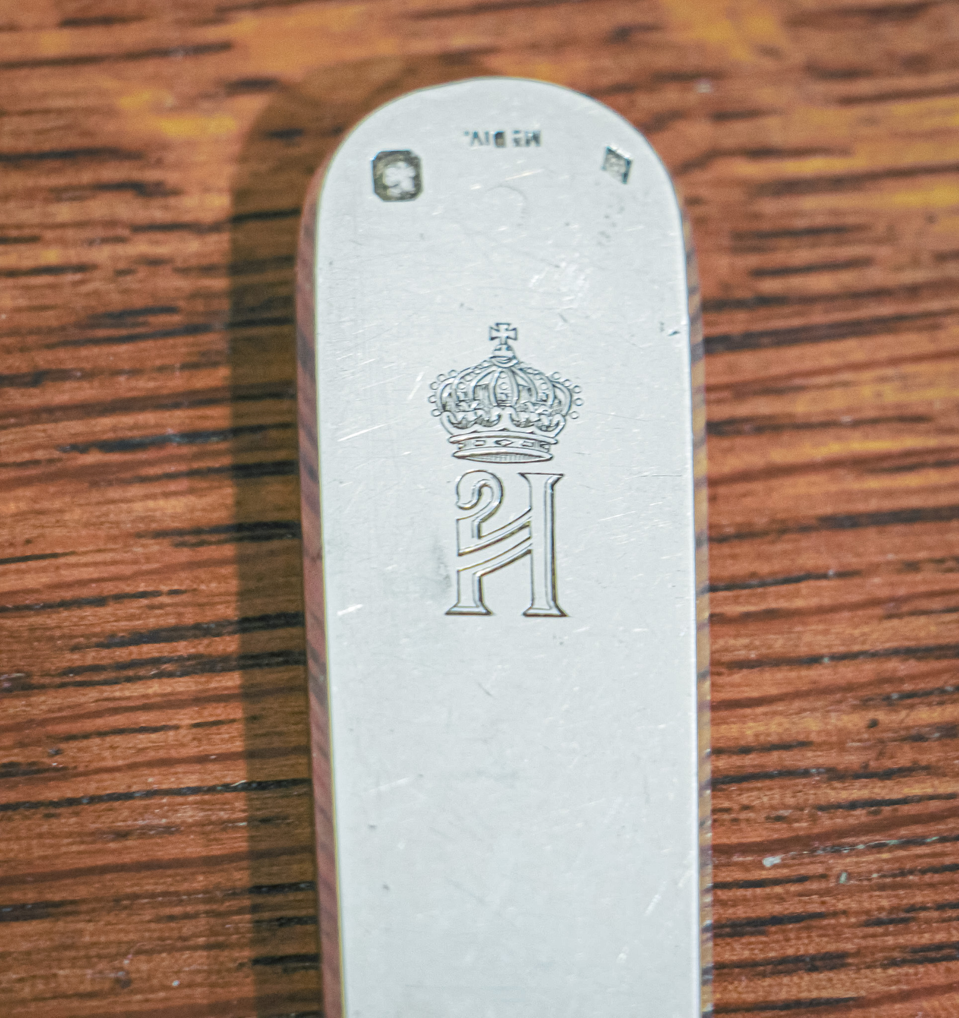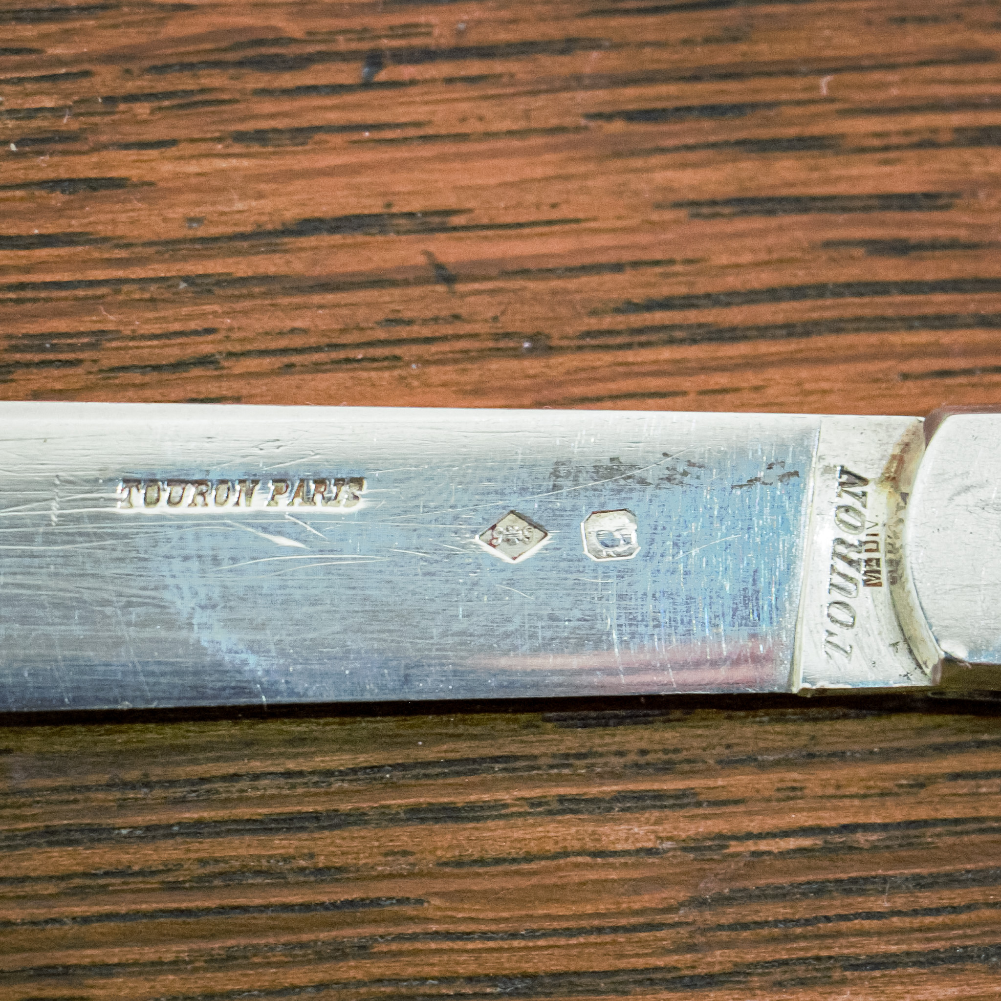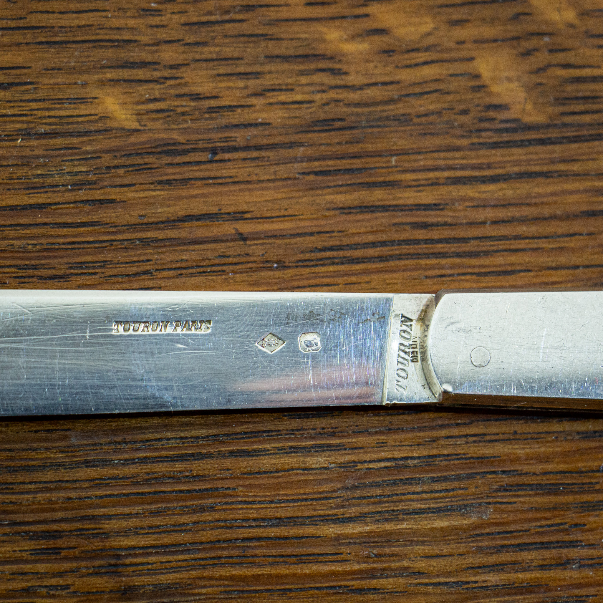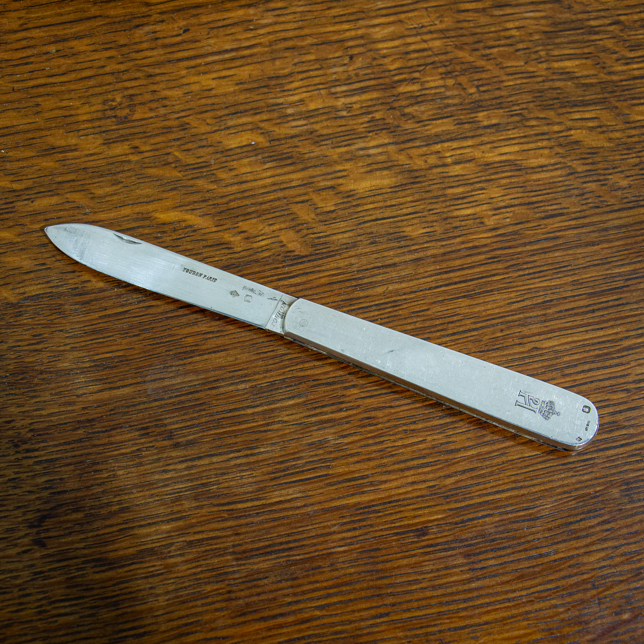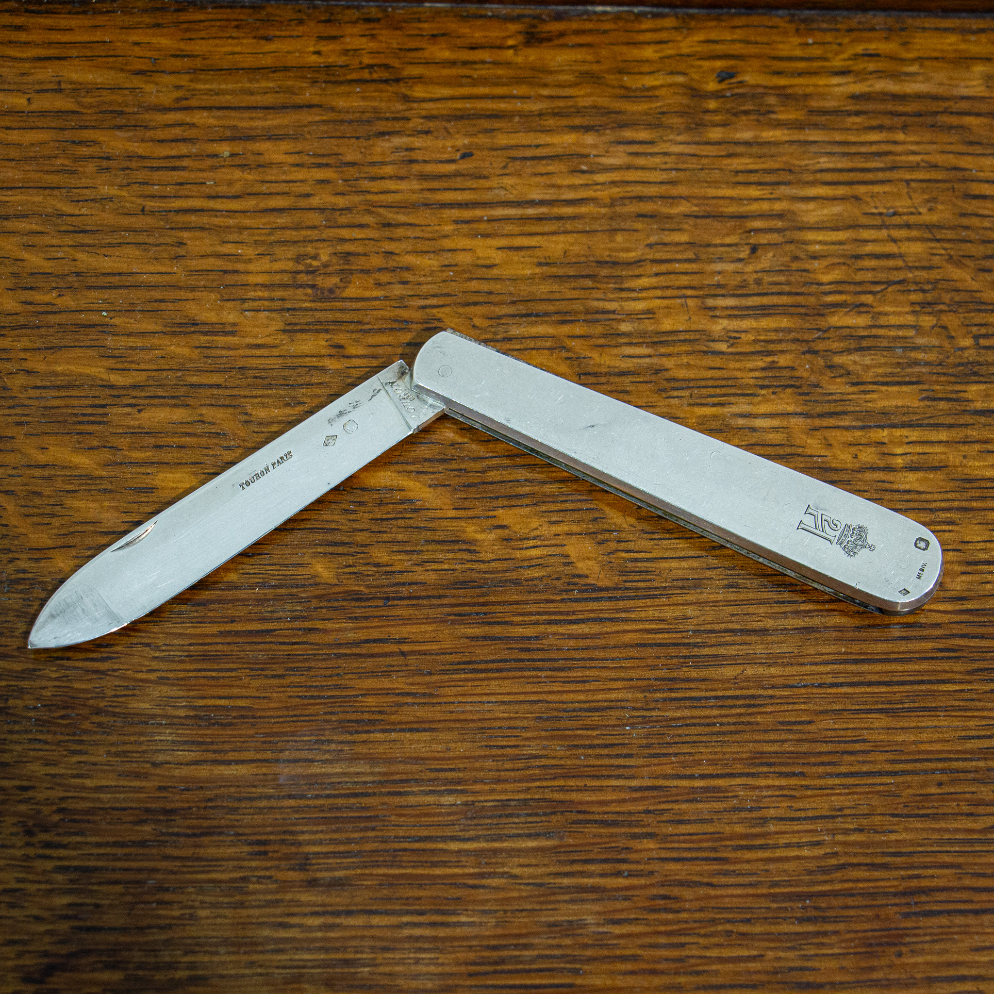 A substantial good quality penknife with a large handle and blade. The handle is extremely tactile, and the blade opens with a sturdy and strong mechanism. The piece is engraved with a Royal Cypher and has hallmarks for Touron, Paris. Weight of Piece 100 grams.