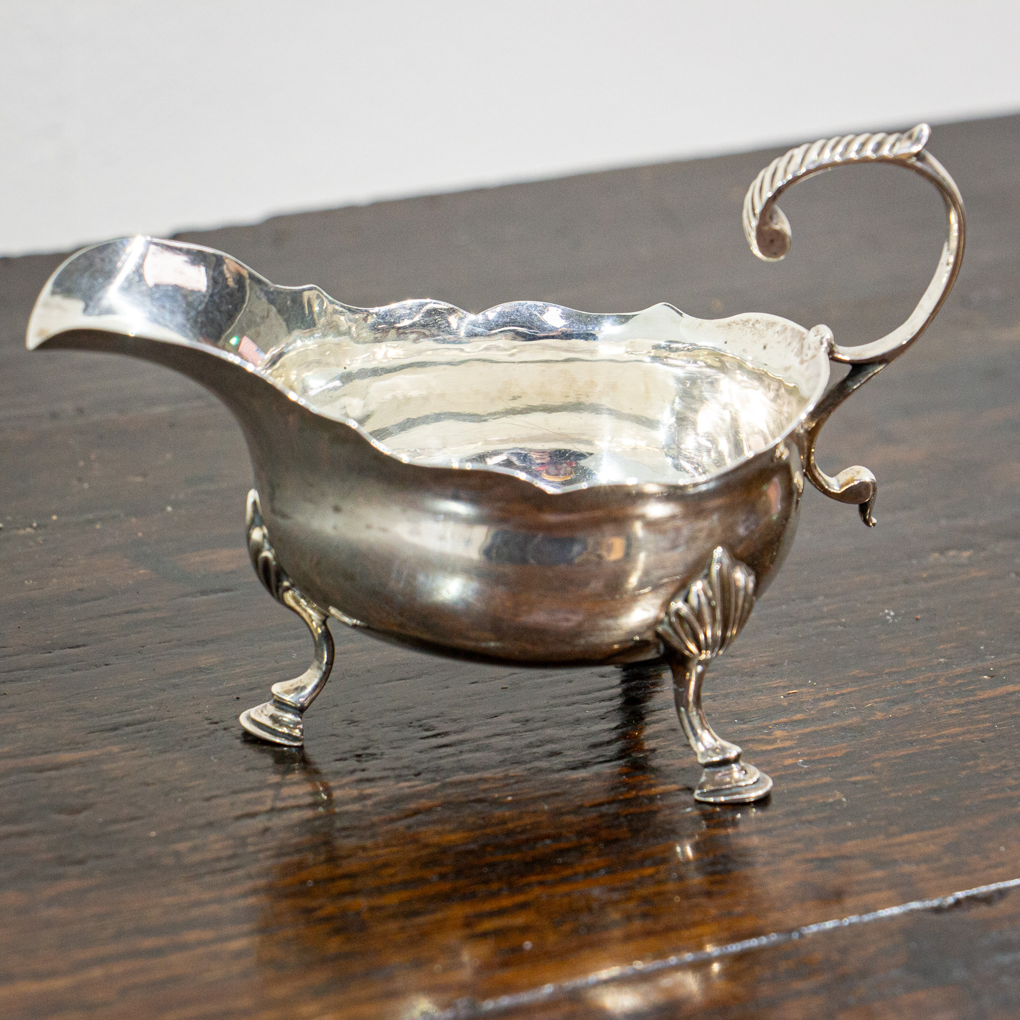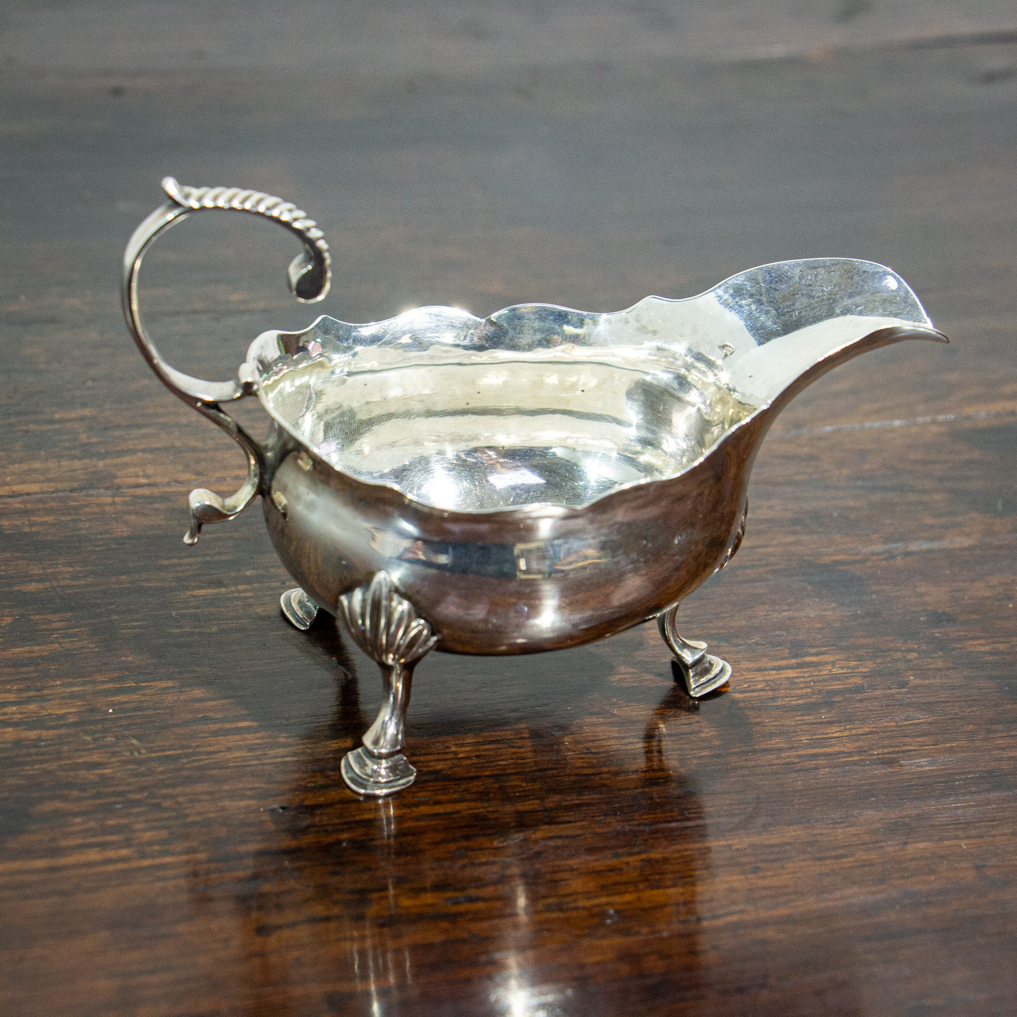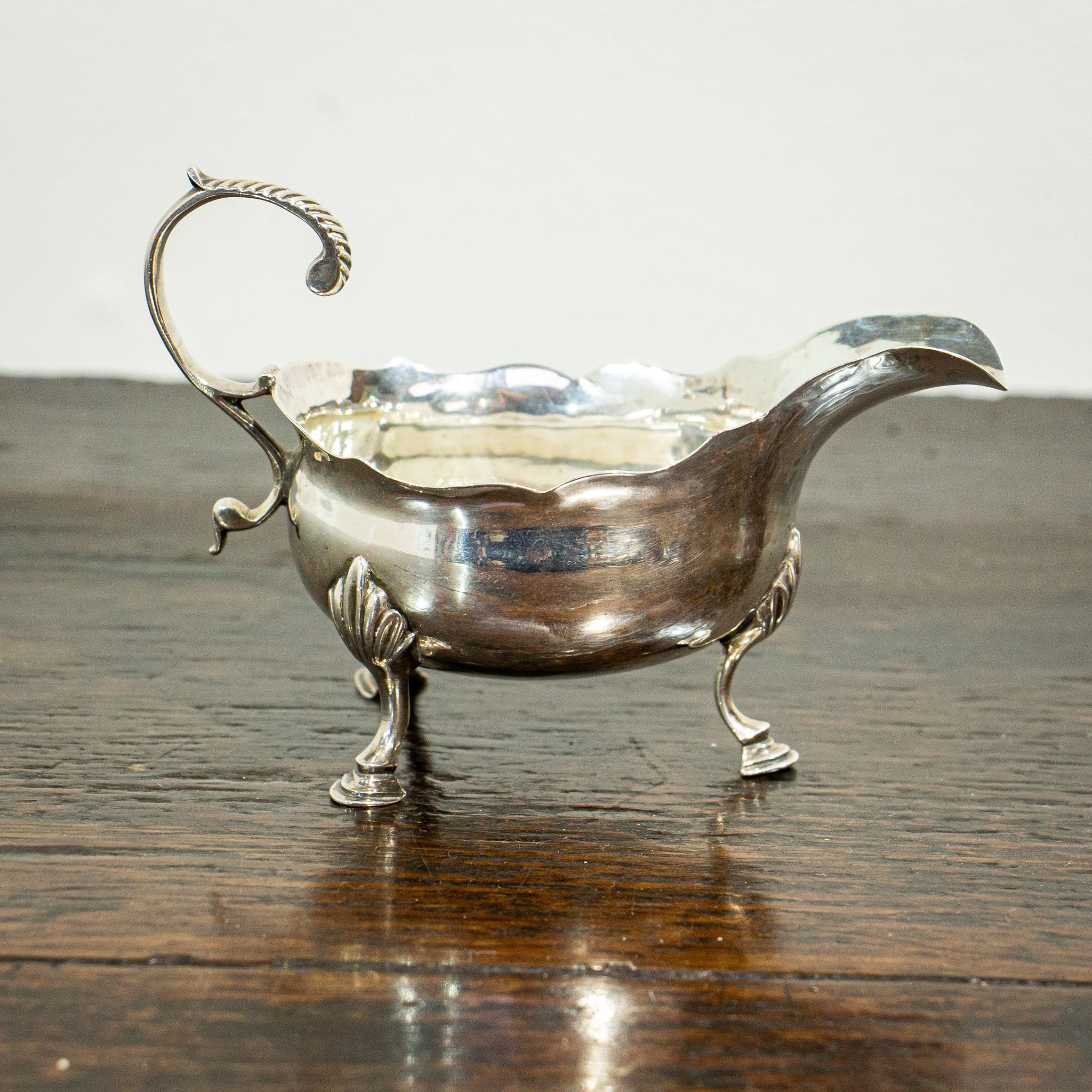 A fine petite silver sauce boat by Thomas Shepherd. The handle has some light gadrooning to the top which leads down to a waved bowl and large spout. The body sits on three graduated feet. The hallmarks for London 1771 can be found to the base. This is a good quality early piece of practical and attractive Georgian silver. Weight 102 grams.