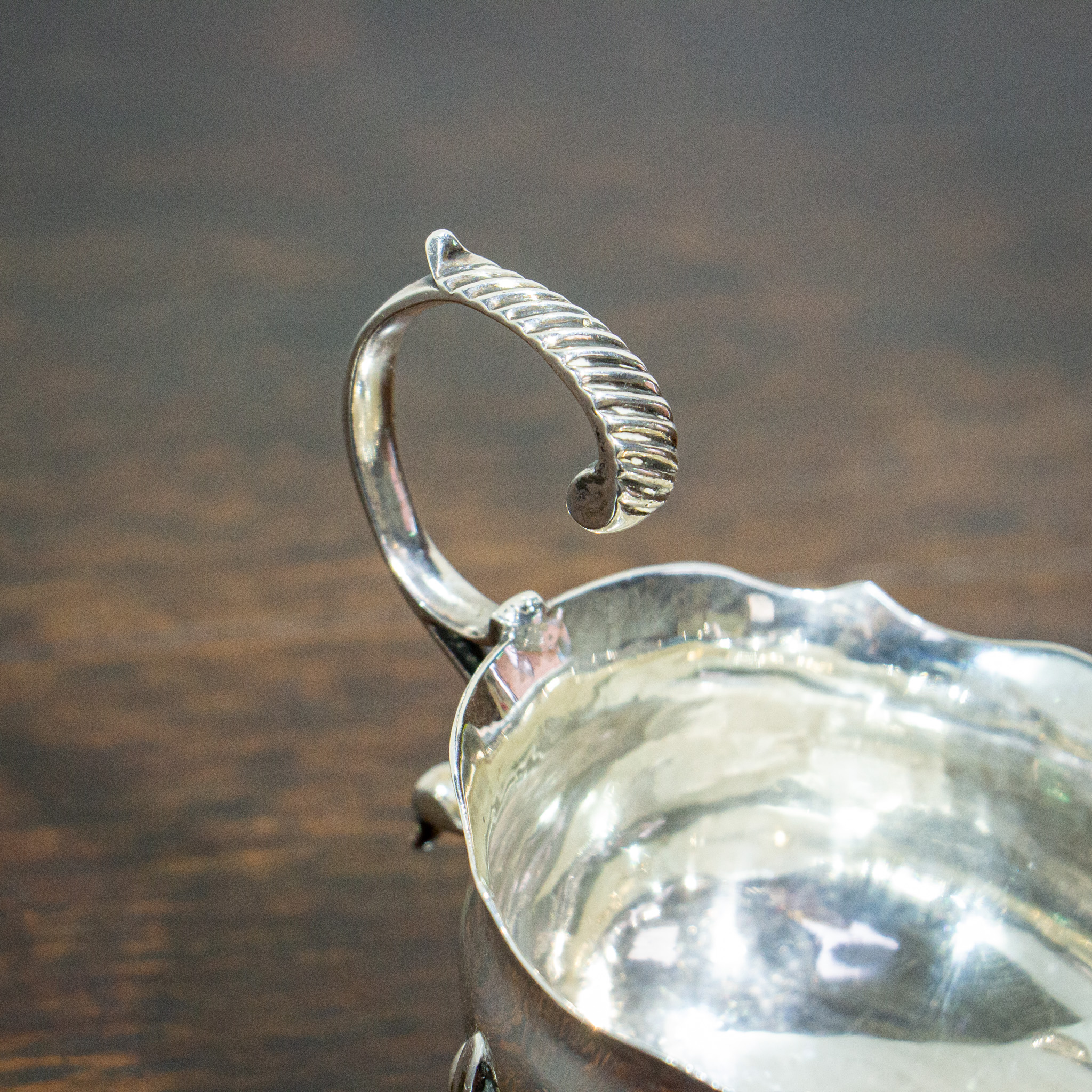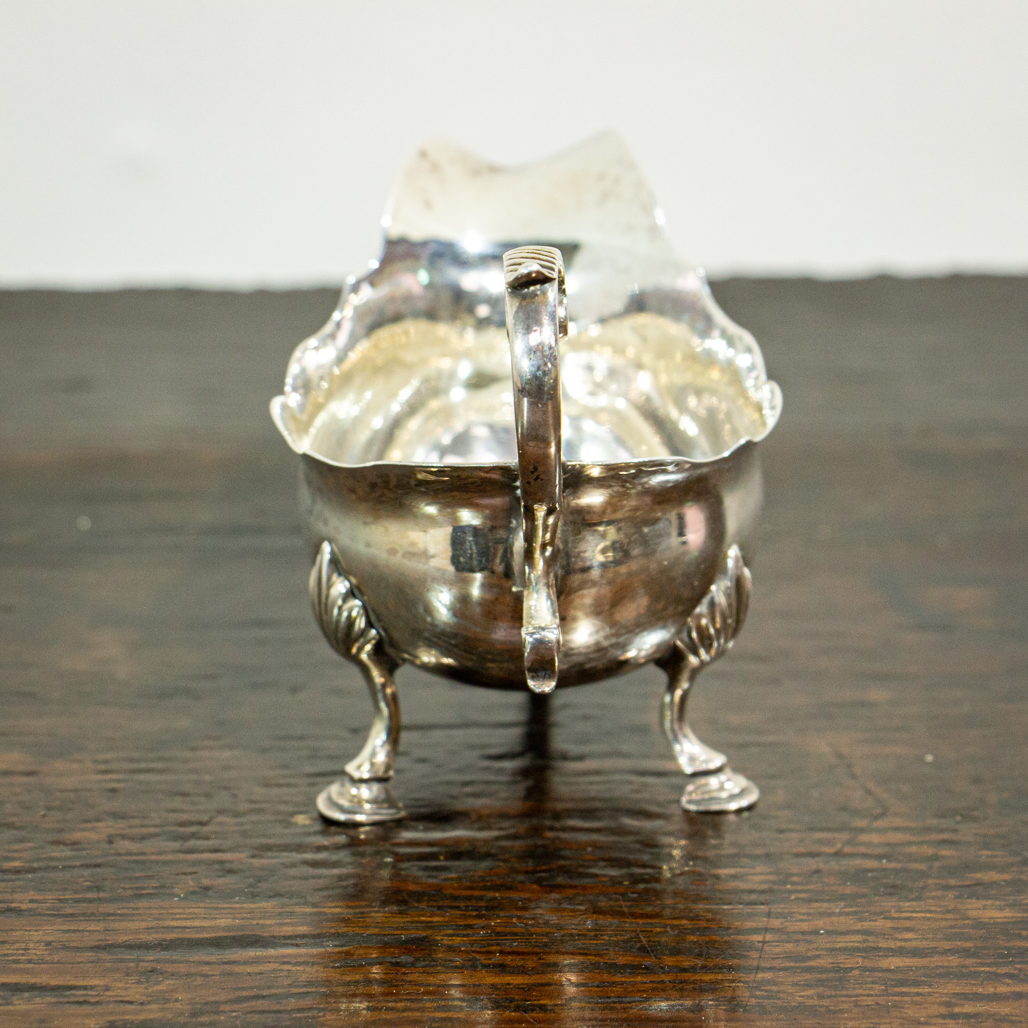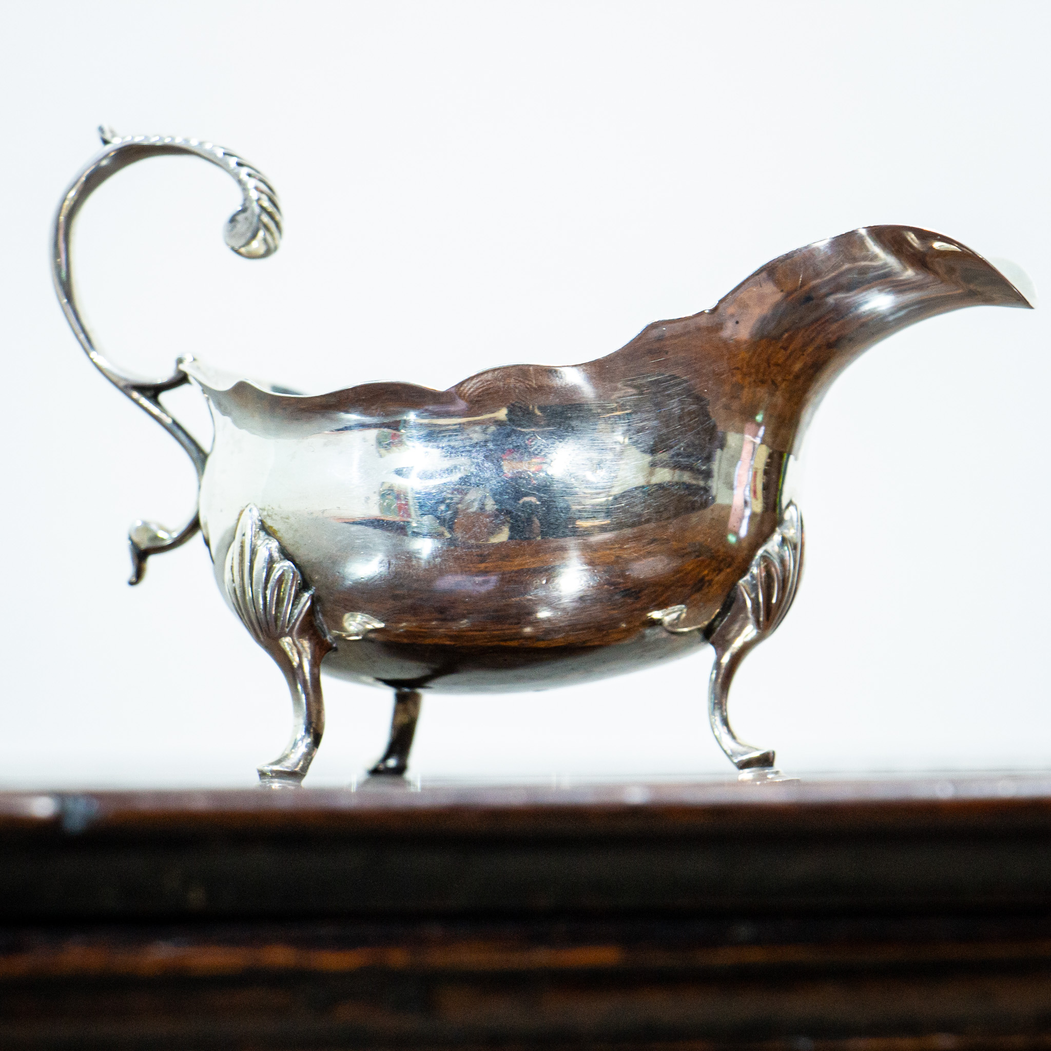 A fine petite silver sauce boat by Thomas Shepherd. The handle has some light gadrooning to the top which leads down to a waved bowl and large spout. The body sits on three graduated feet. The hallmarks for London 1771 can be found to the base. This is a good quality early piece of practical and attractive Georgian silver. Weight 102 grams.