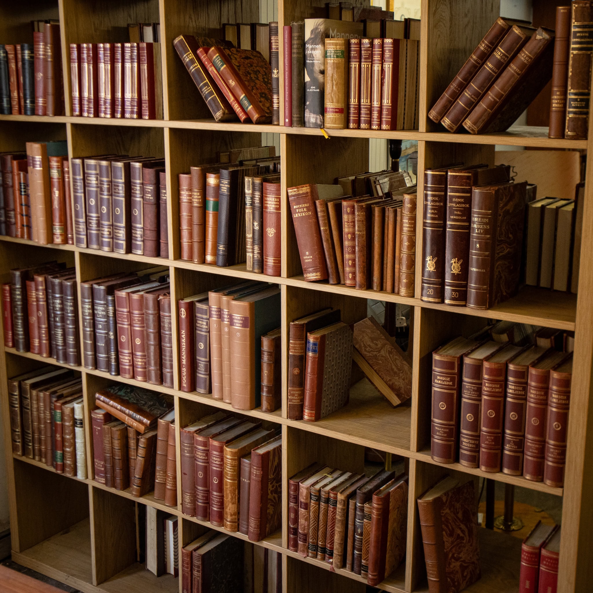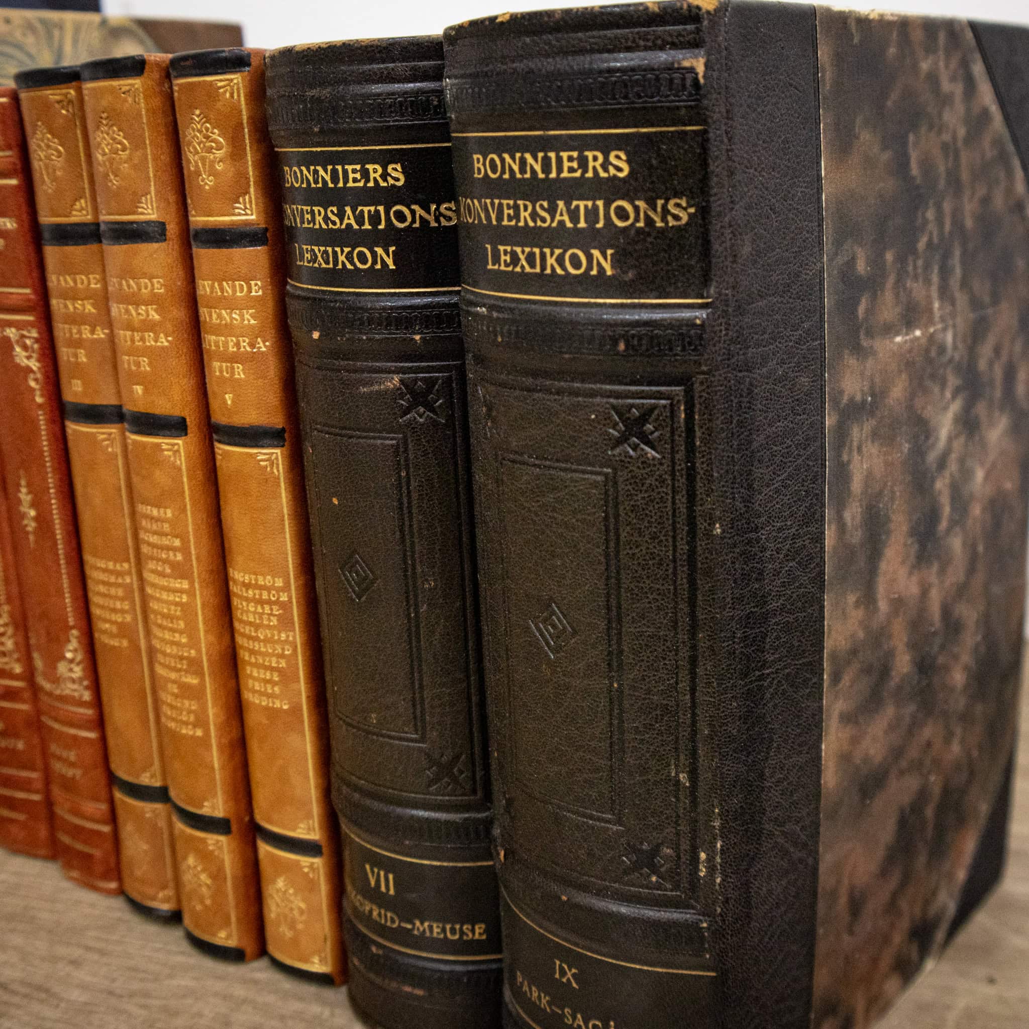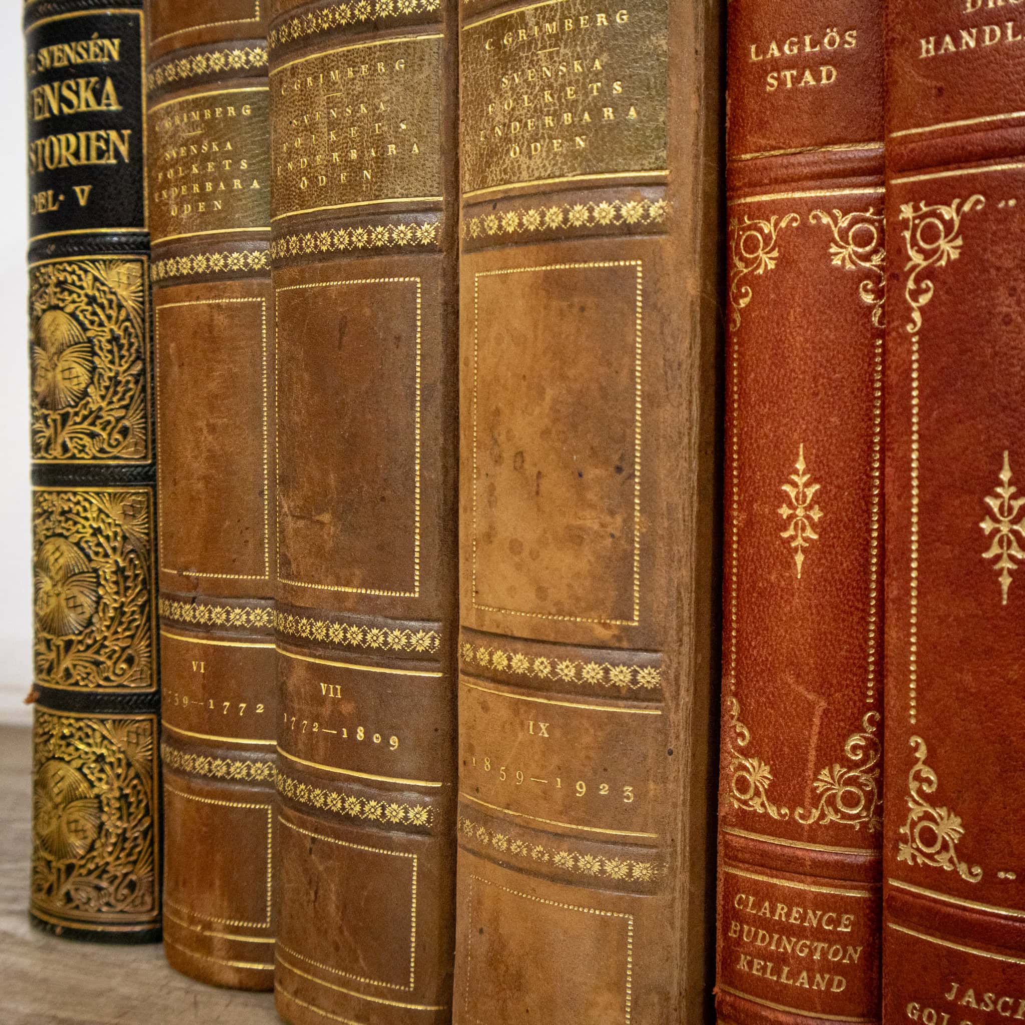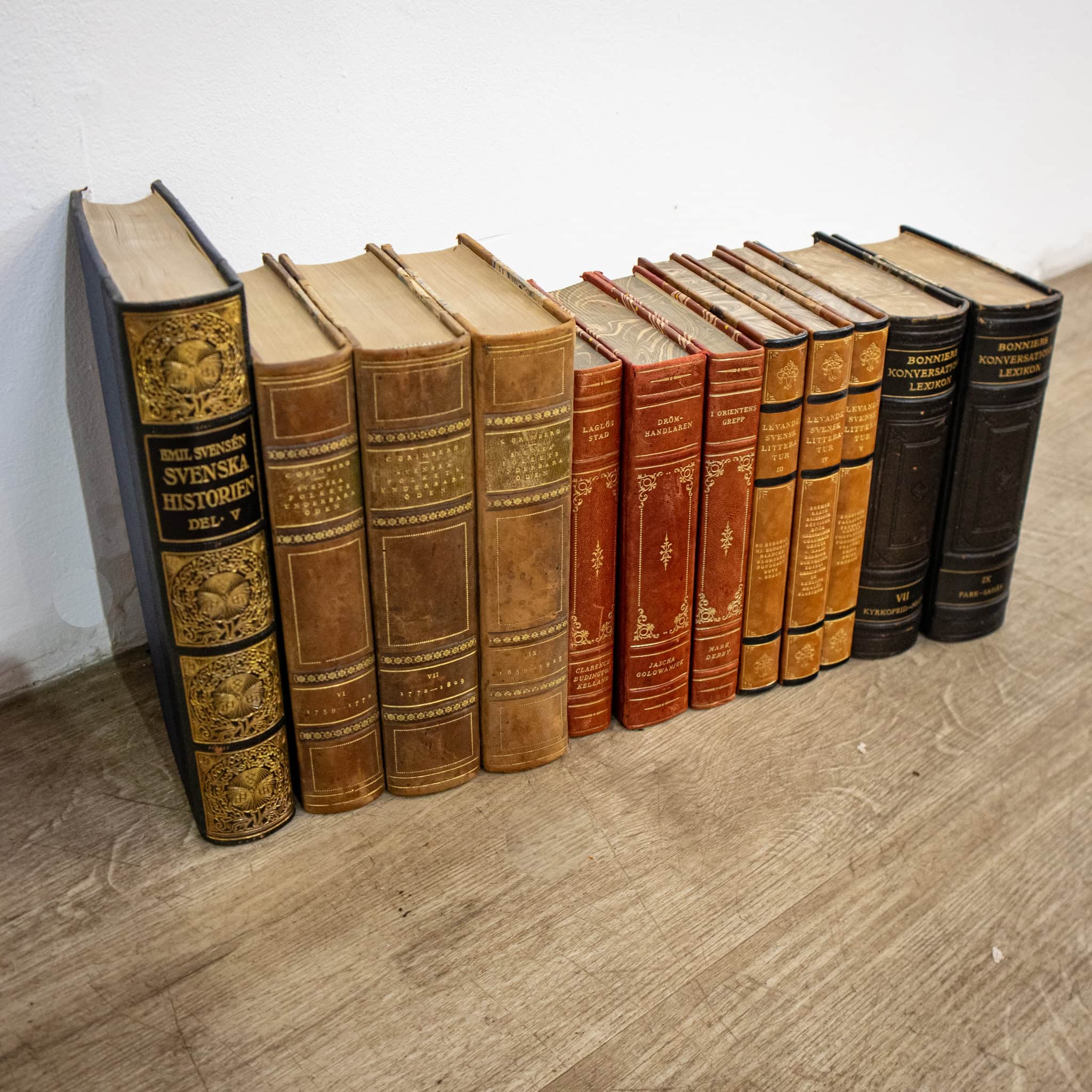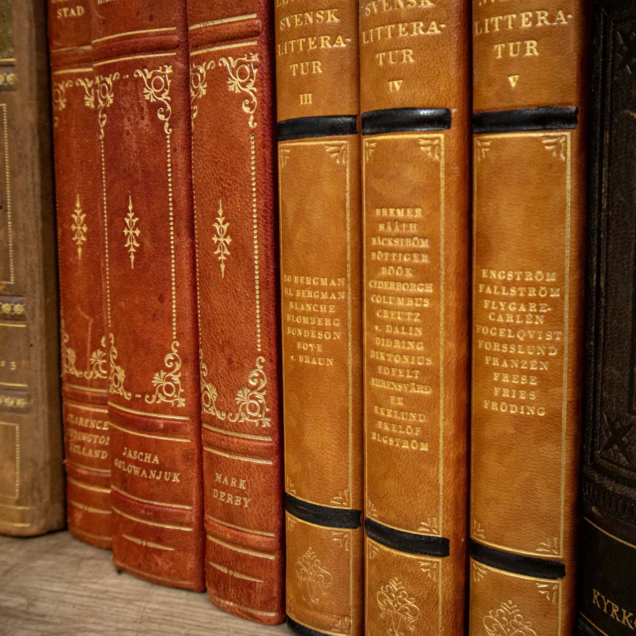 Attractive leather bound books in Scandinavian languages, mostly Swedish, these are available in quantity for interior decoration. The pictures show examples, but won’t necessarily be the specific items in stock at the time of order, so enquiries can be answered with more pictures and information regarding availability, and orders without enquiries will be supplied as a set of 12 books taken at random. Most of them date to the first half of the 20th century. Minimum orders will be in sets of 12 books, but larger quantities can be supplied, either by numbers or shelf measurements. Customers may be able to choose colour and size preferences dependent upon stock availability. A discount can be discussed for orders of over 1000 books.