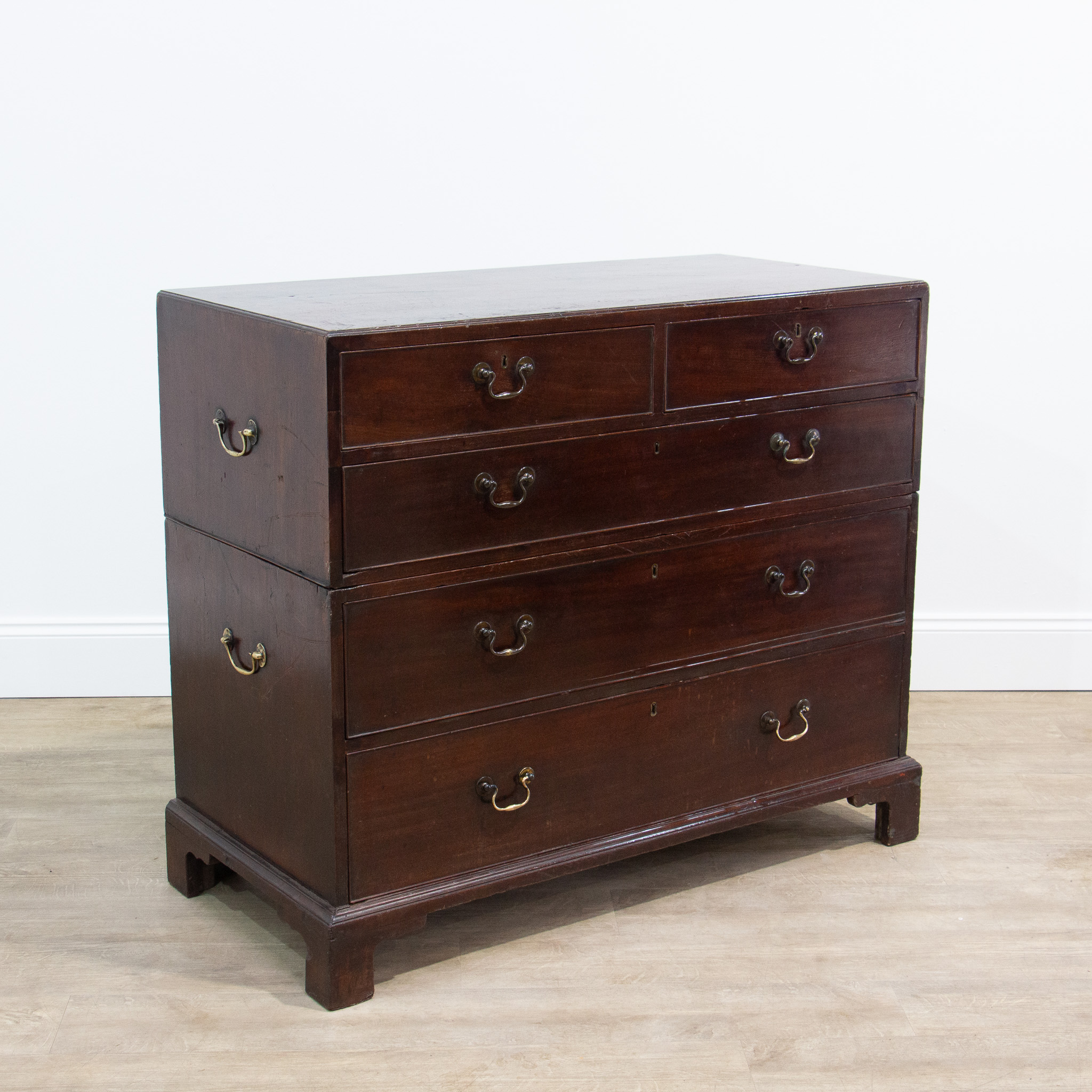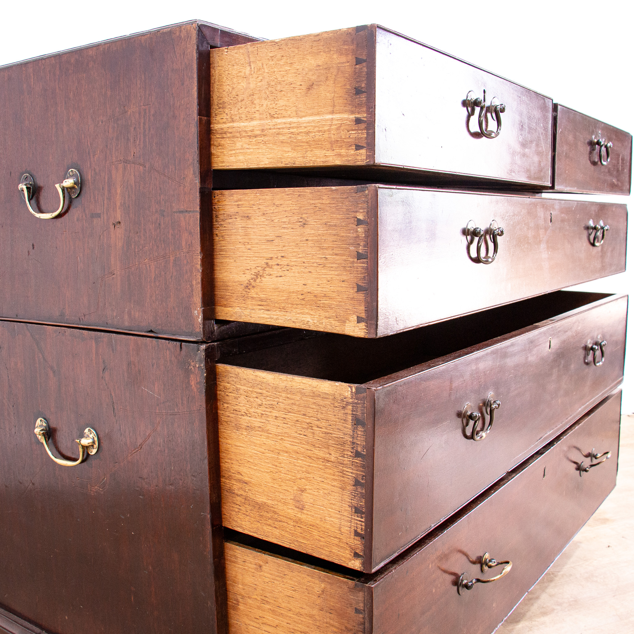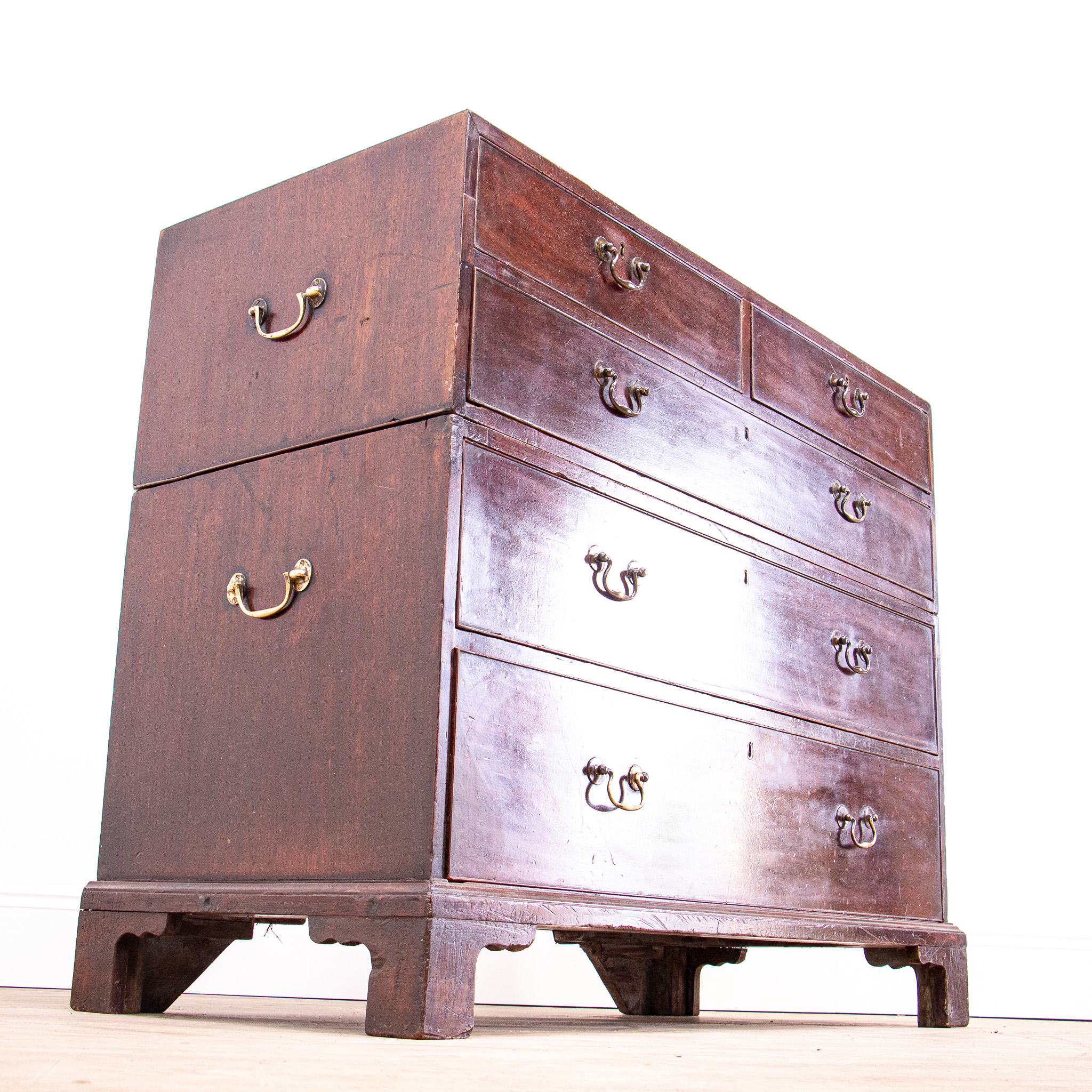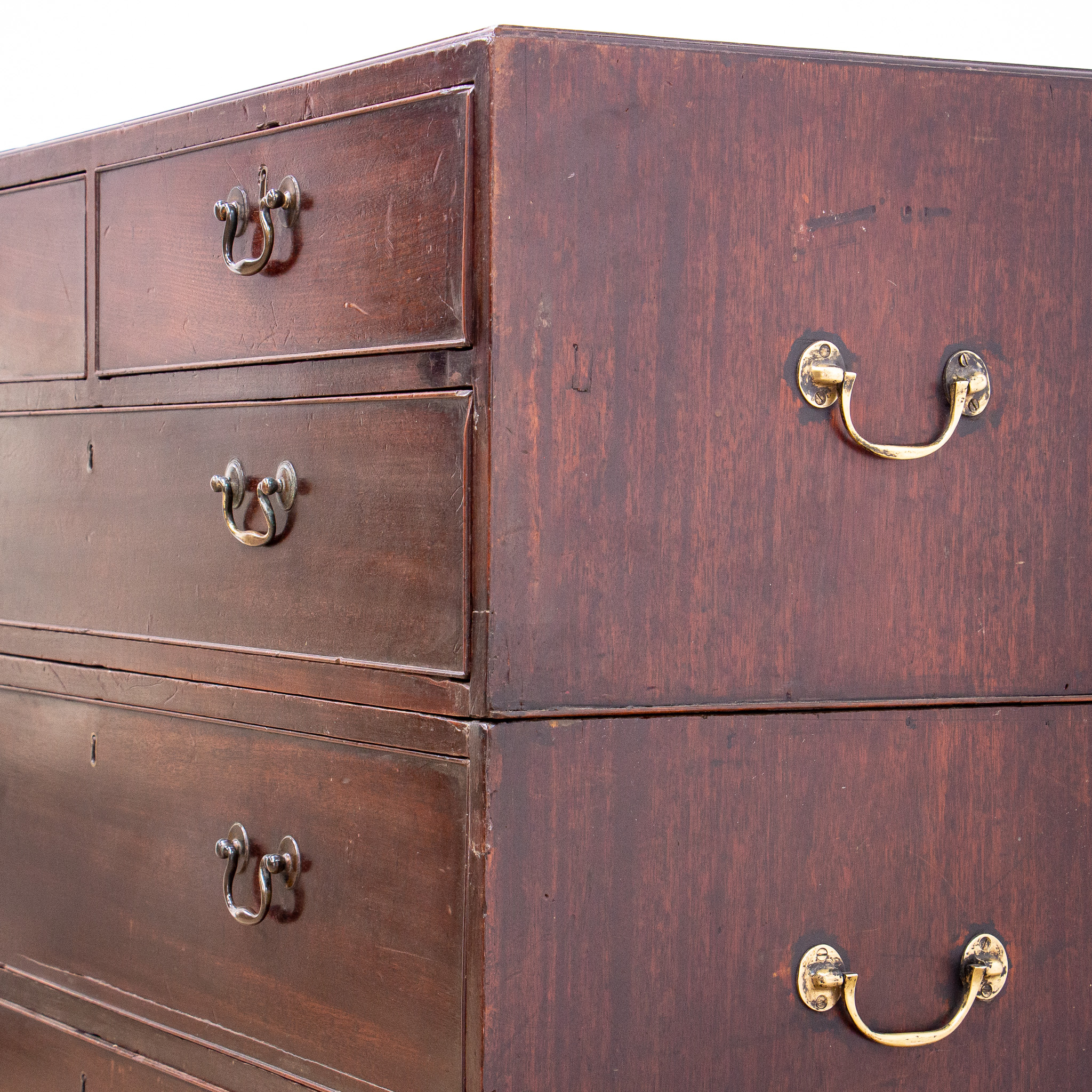 A handsome storage piece, this campaign style chest of drawers fits together as two pieces, originally allowing it to be easily dismantled and carried between locations. A solid and sturdy item of furniture, this is marked as having been associated with the Royal Navy.
