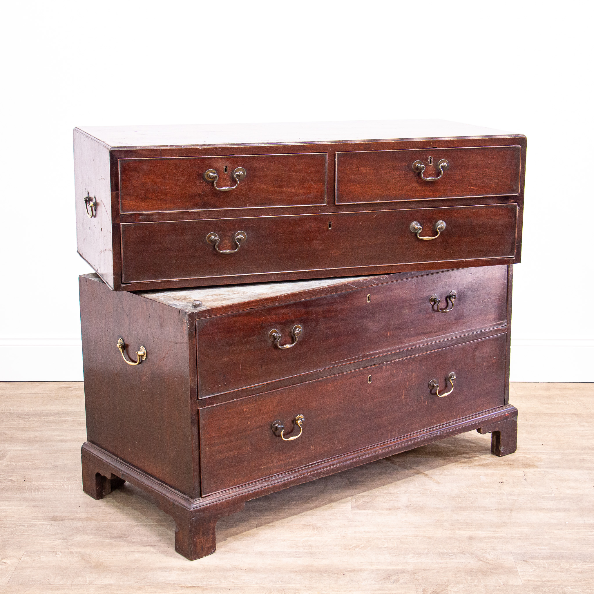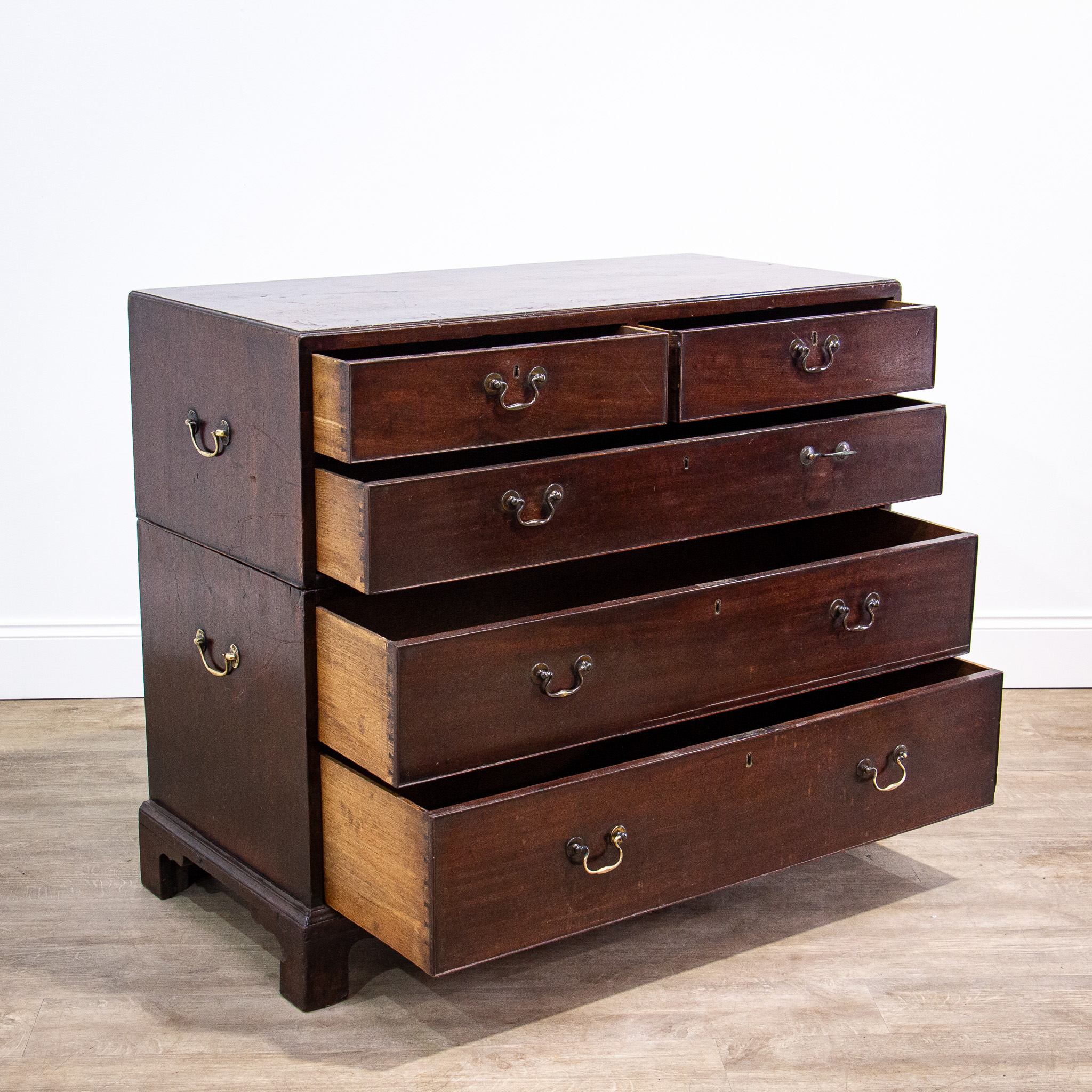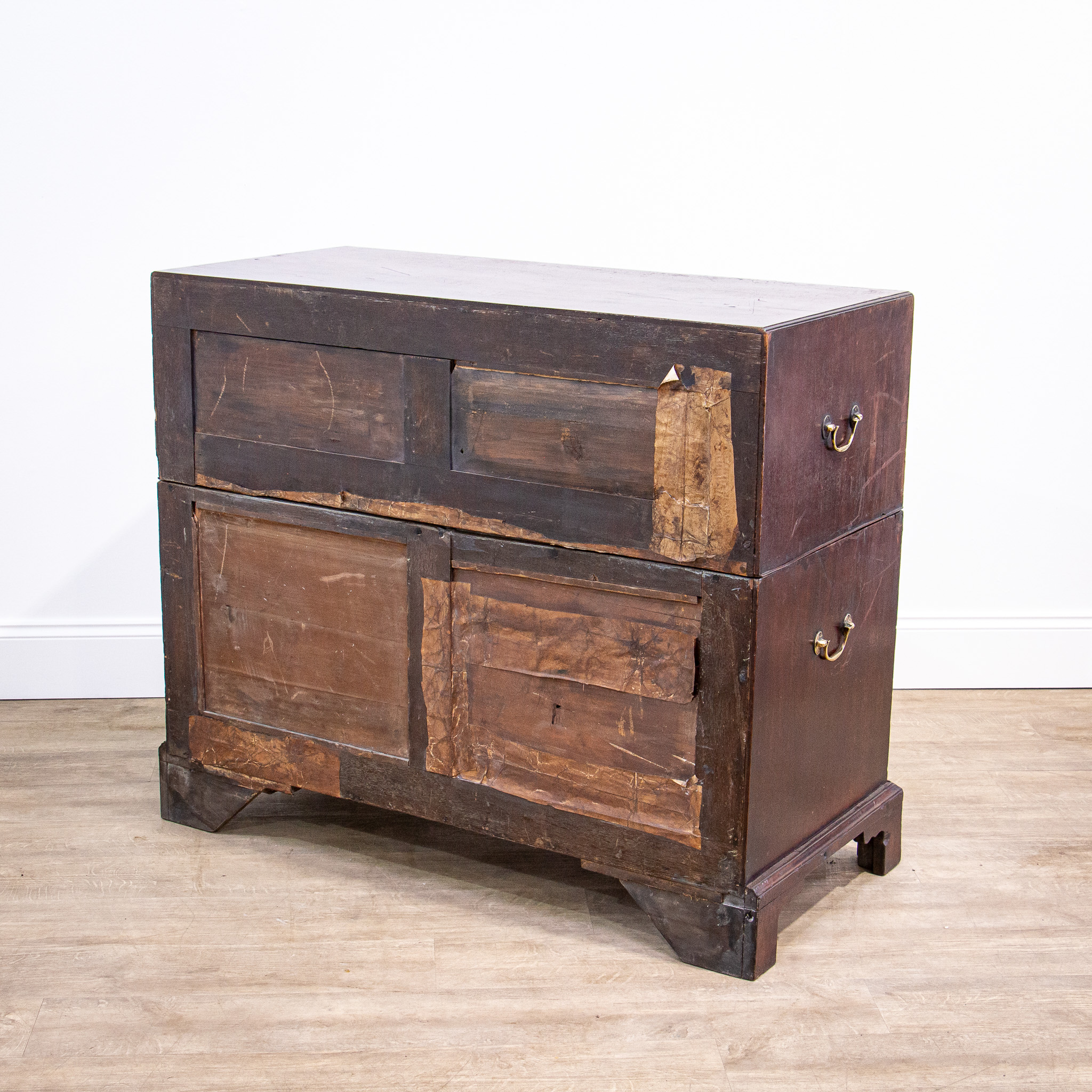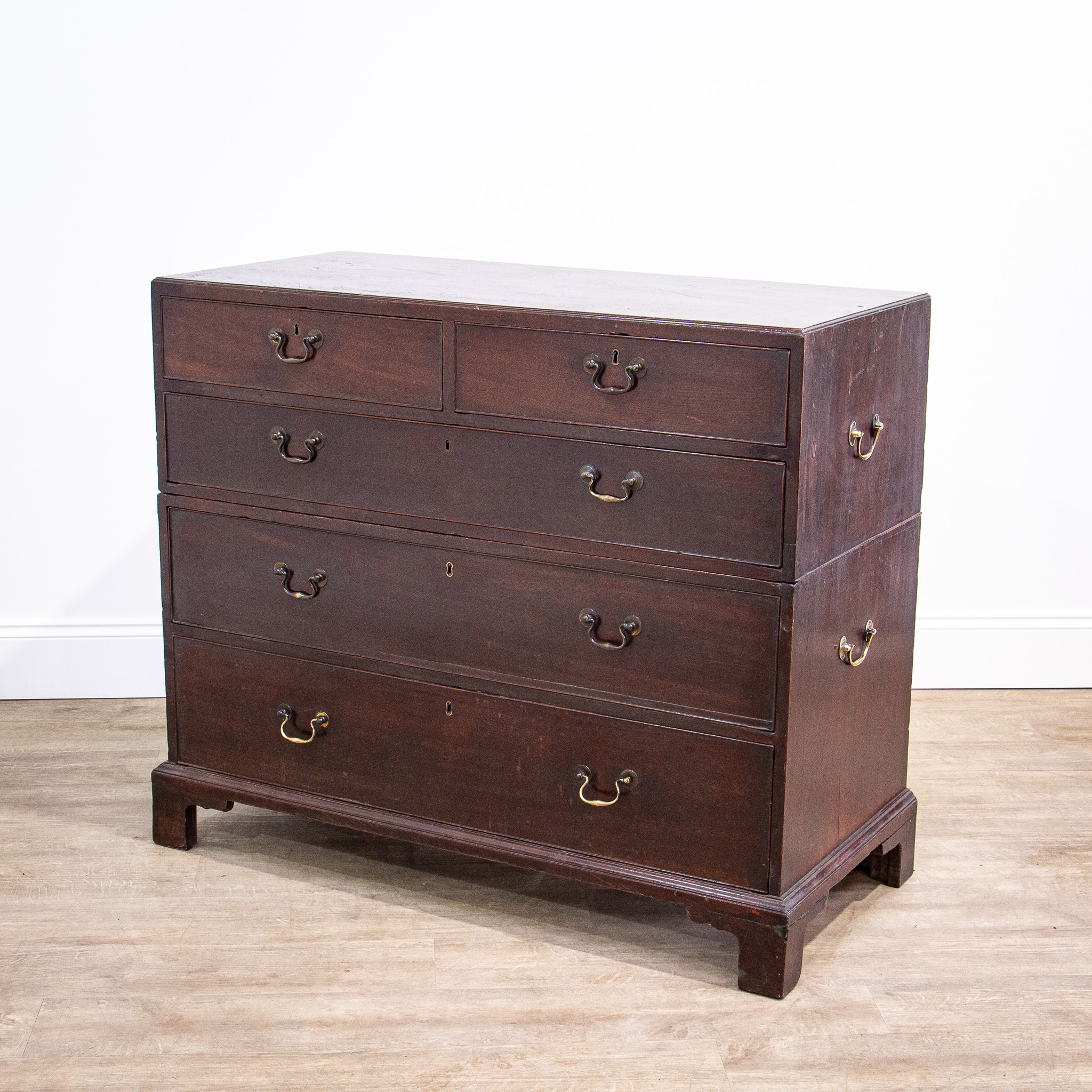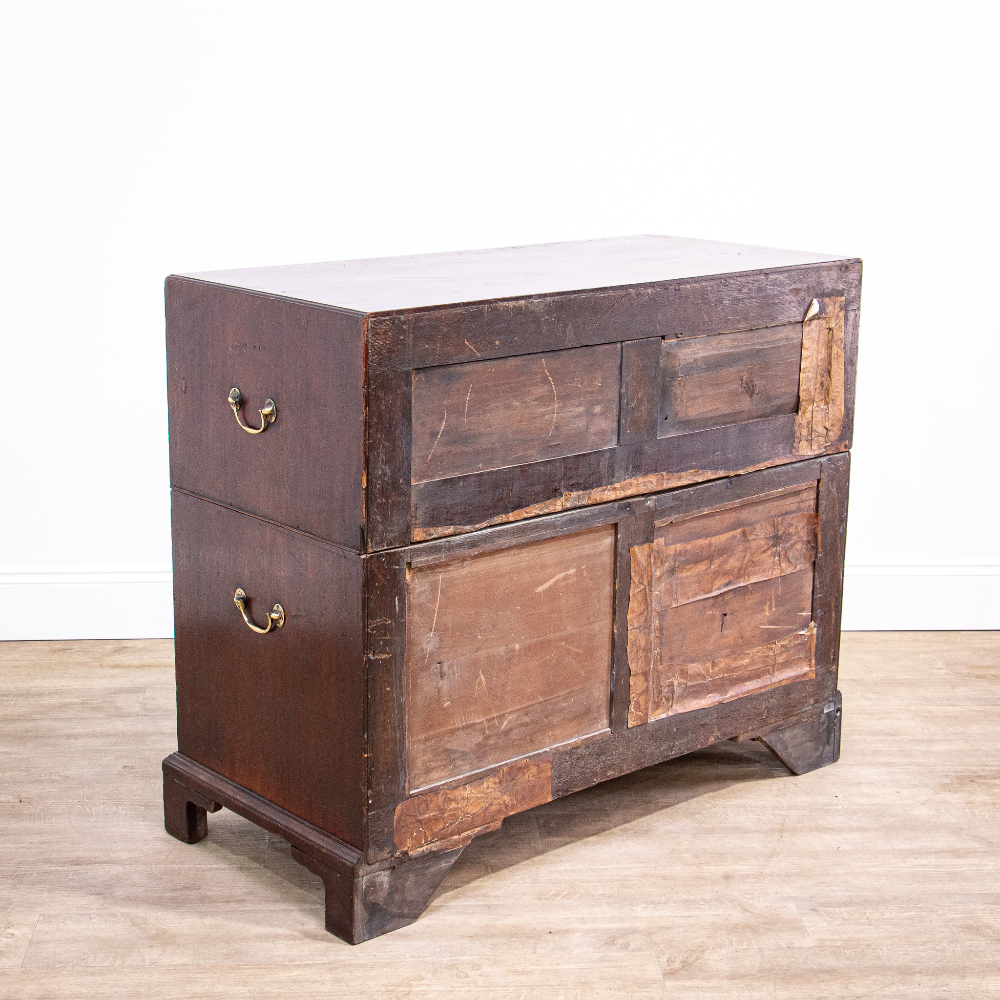 A handsome storage piece, this campaign style chest of drawers fits together as two pieces, originally allowing it to be easily dismantled and carried between locations. A solid and sturdy item of furniture, this is marked as having been associated with the Royal Navy.