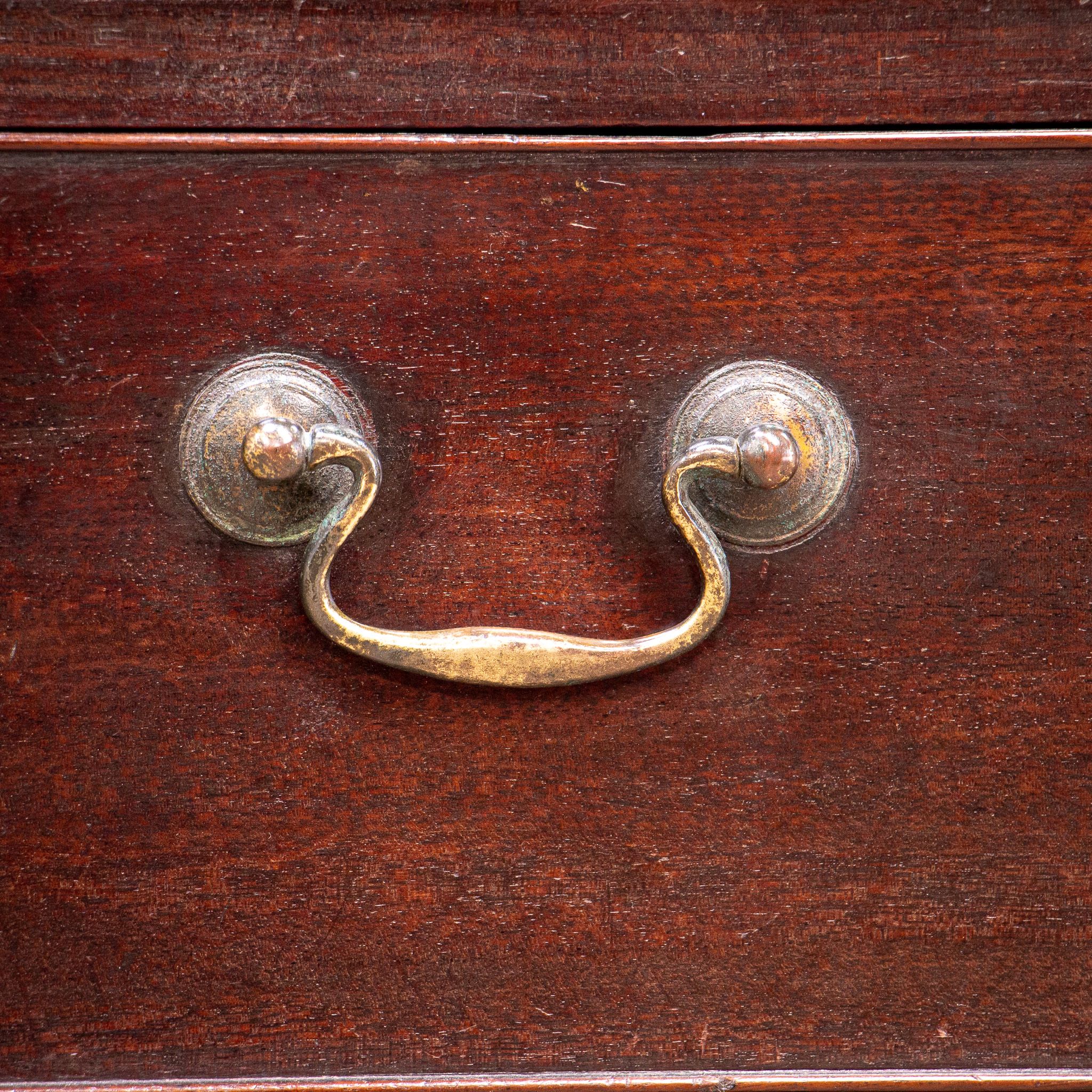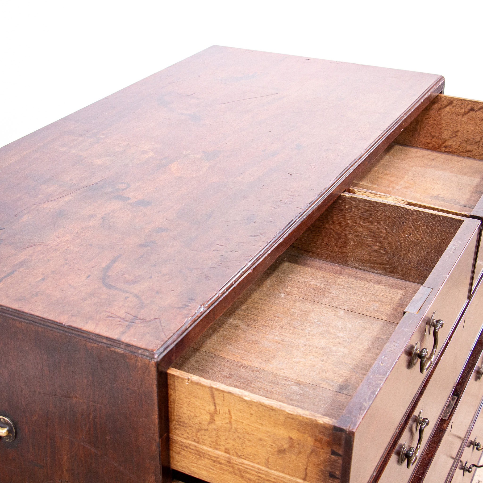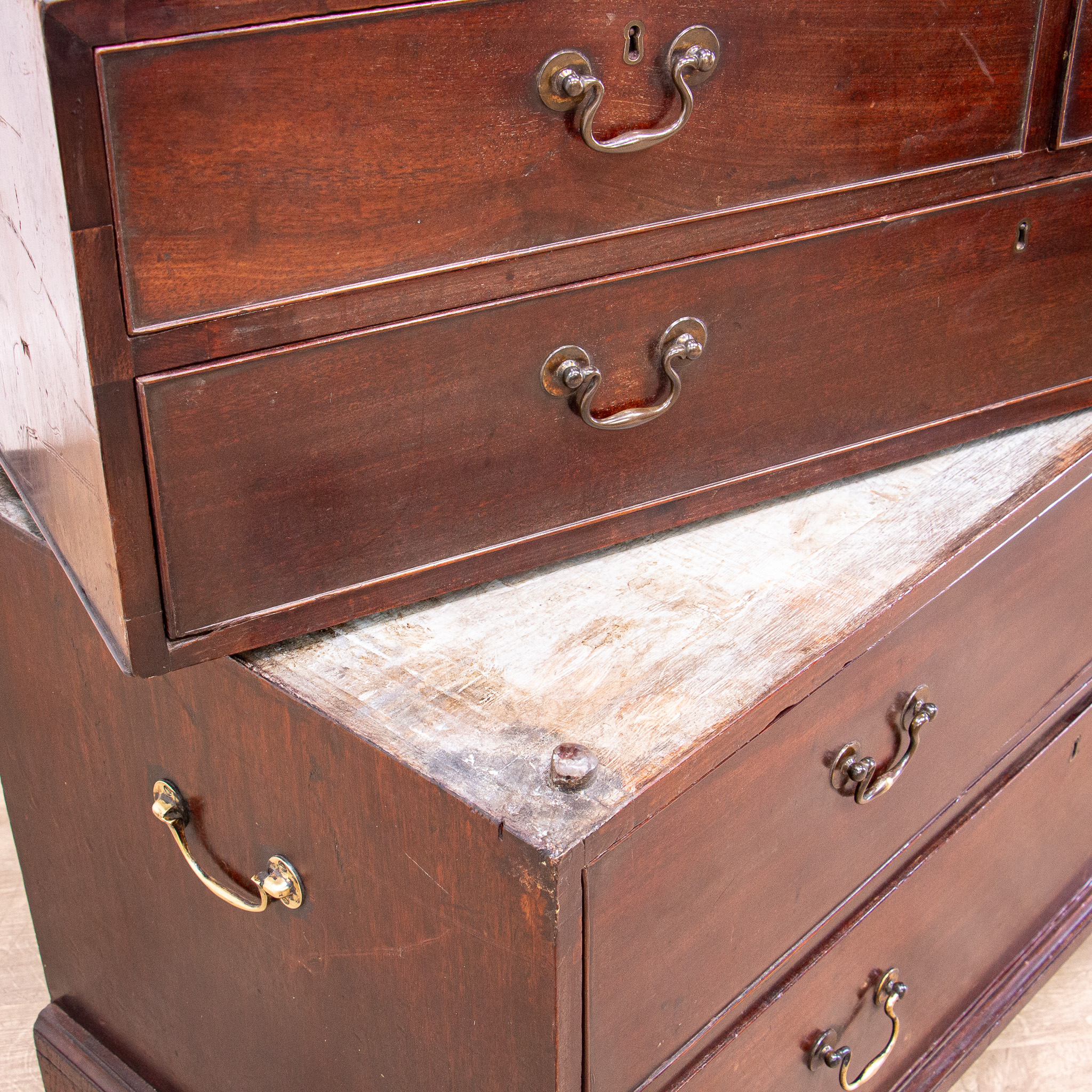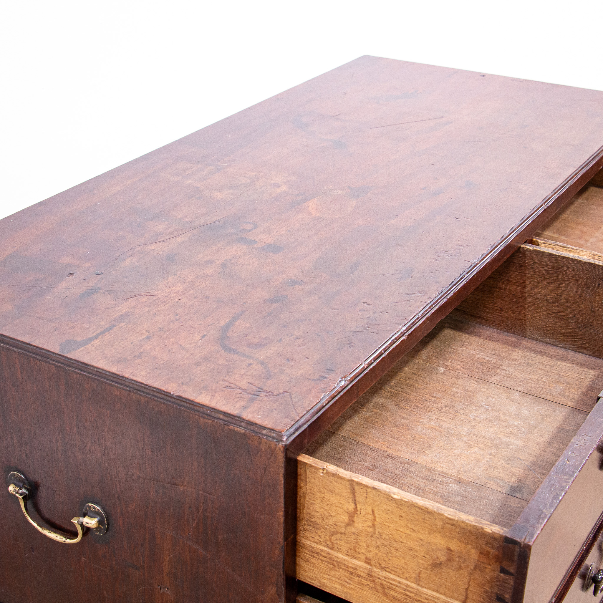 A handsome storage piece, this campaign style chest of drawers fits together as two pieces, originally allowing it to be easily dismantled and carried between locations. A solid and sturdy item of furniture, this is marked as having been associated with the Royal Navy.