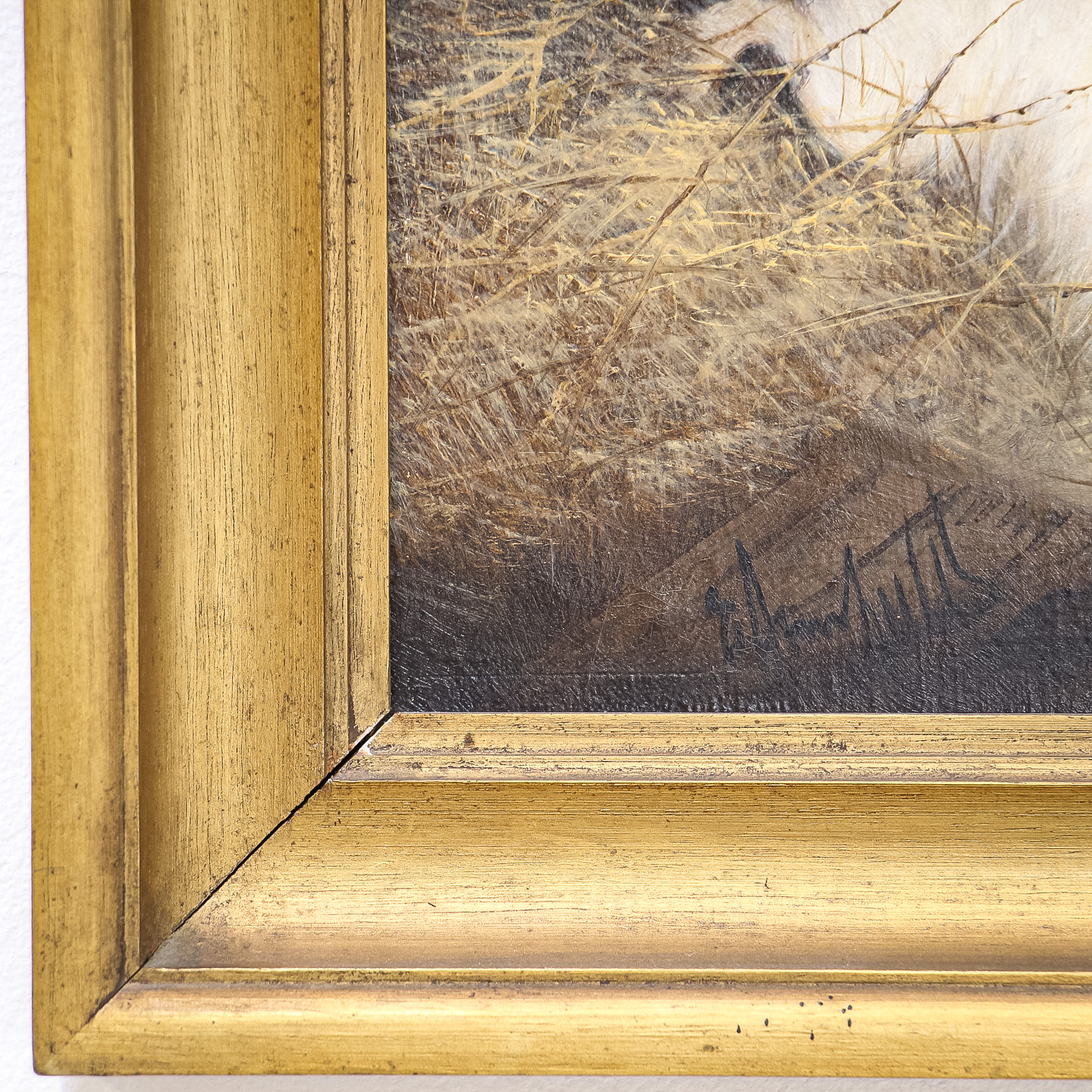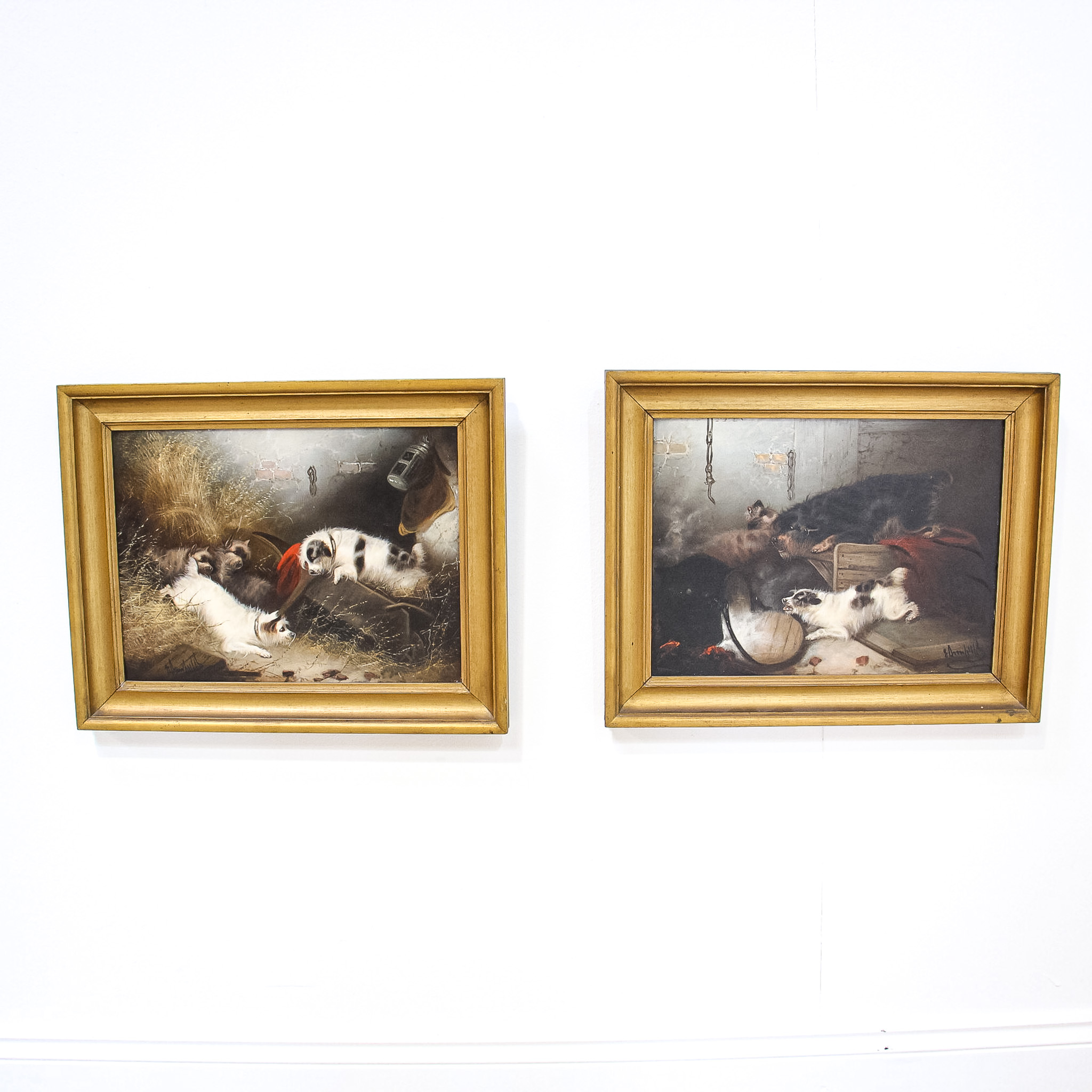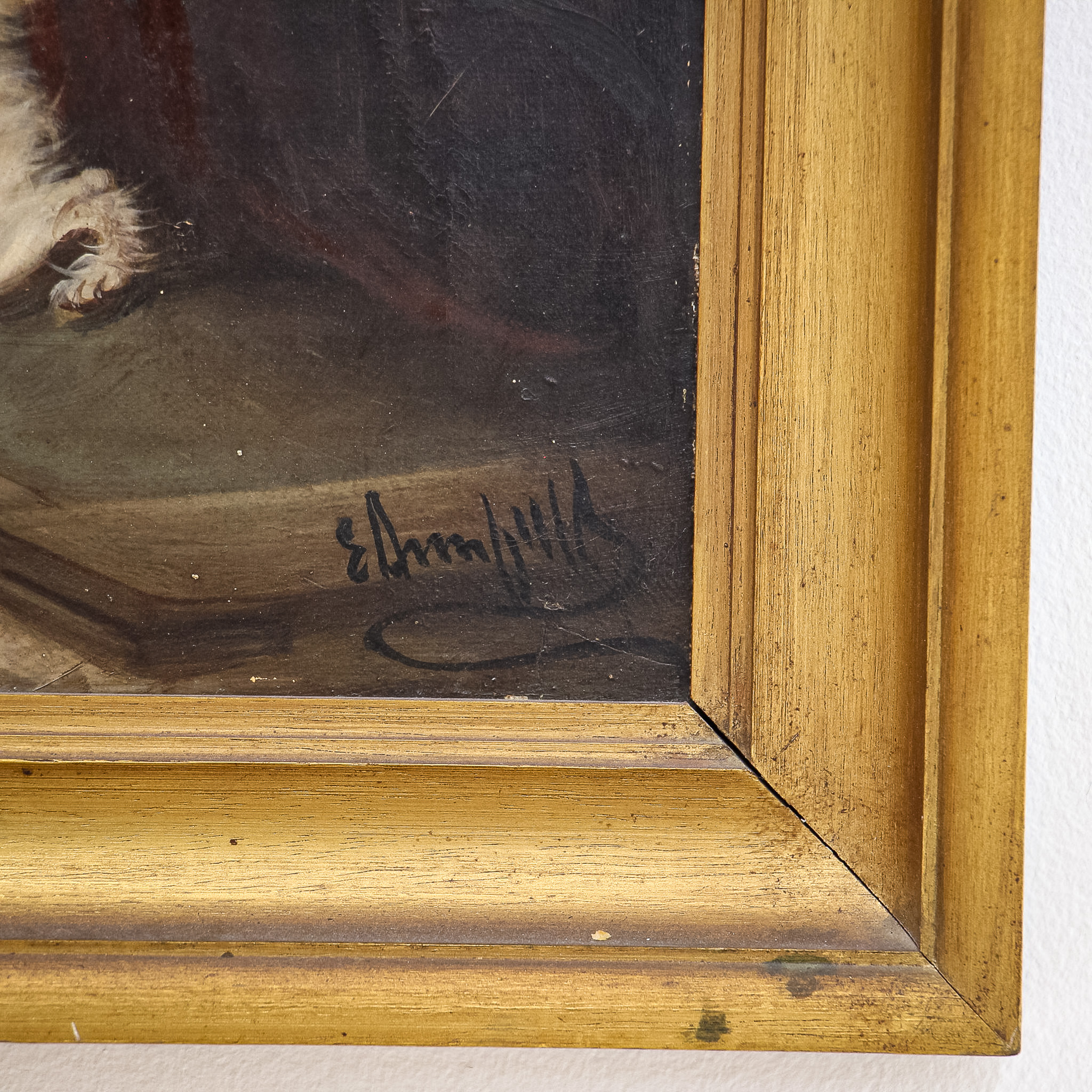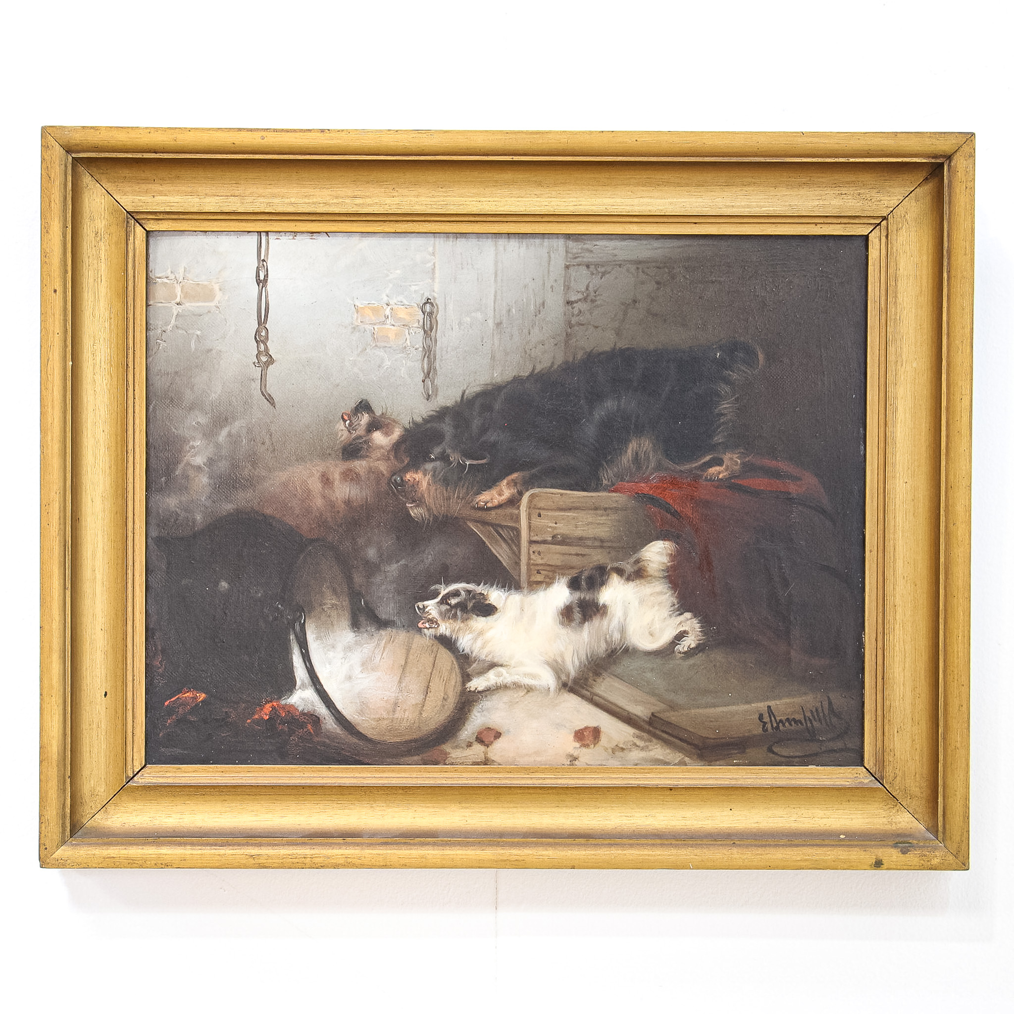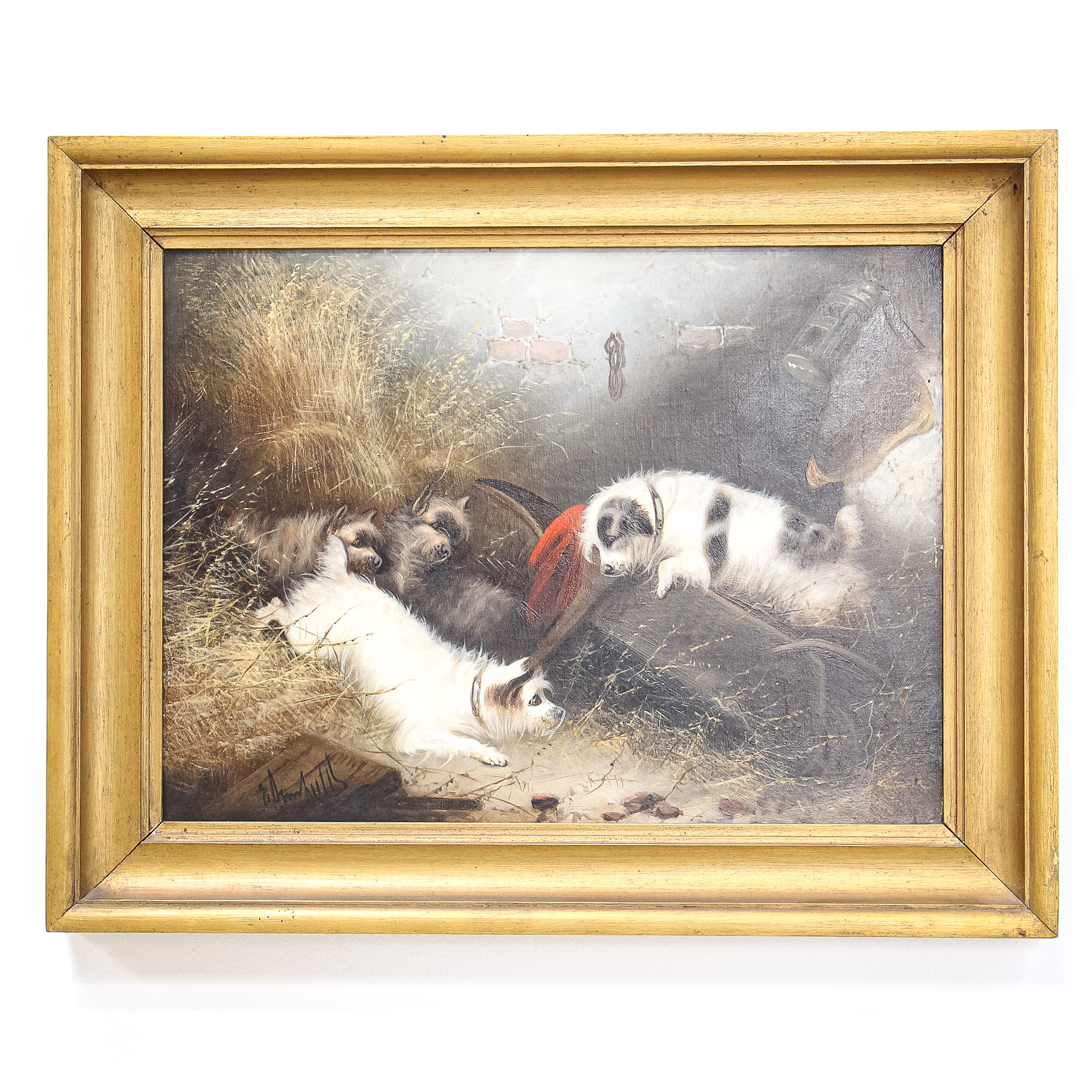 A wonderful pair of oil paintings by Edward Armfield (1857 – 1935) depicting his preferred subject matter of terrier dogs playing in various contexts. Both Armfield’s father (the animal artist George Armfield) and grandfather (William Armfield Hobday) were artists and he continued in the family tradition. He used several names during his life and is also known as Edgar Armfield Smith and Edwin George Armfield. His work is hung in several museums and galleries, including Brighton Museum, Leamington Spa Art Gallery, The Whitaker and the Wolverhampton Art Gallery.