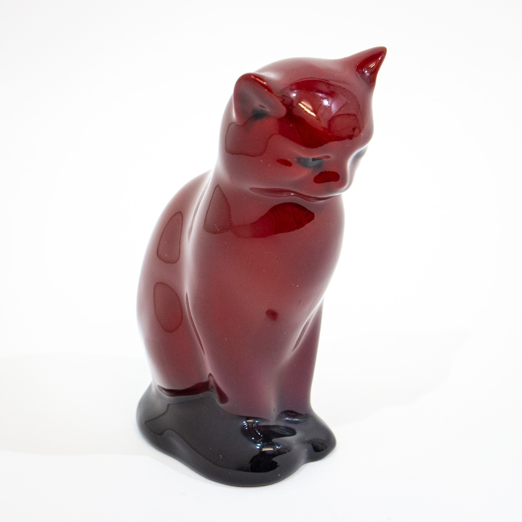 Royal Doulton Flambe cat, in a classic sitting pose highlighting the elegance and sleekness of the cat form. As well as the smooth, rich, red and black glaze signature to the Royal Doulton Flambe. This is a must for collectors of Flambe or lovers of cats. Stamp to the base.