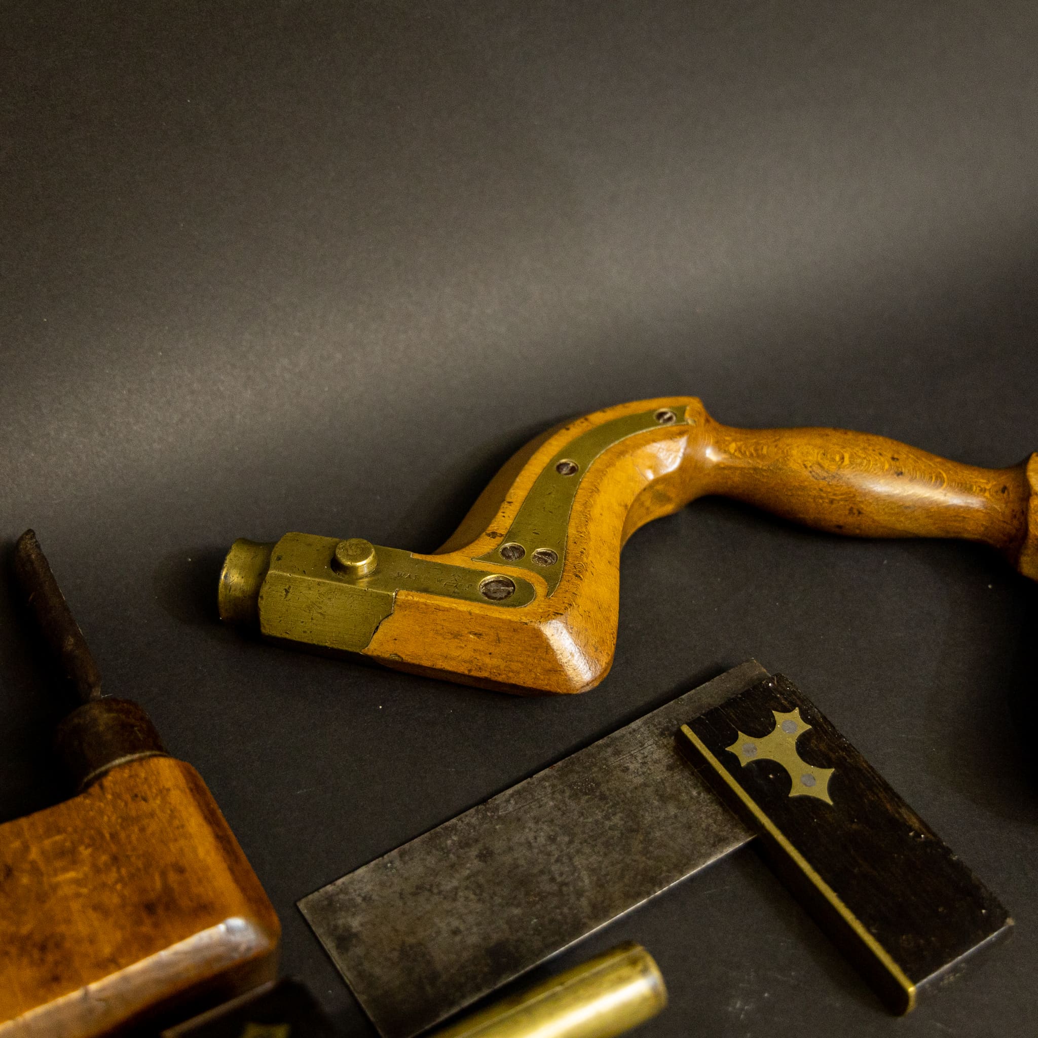 Selection of Six 19th Century Woodworking Tools. A fine set of tools comprising a Beechwood Brace by Ward, a Chairmakers Brace, two Mortice Gauges one by T Wall & Son, a 45 degree Angle Square and a small Set Square. The Braces in particular have a lovely patina to them and the set as a whole would be a superb addition to any collection. The pieces are in good condition with only age related signs of wear. 19th Century, Wood, British.