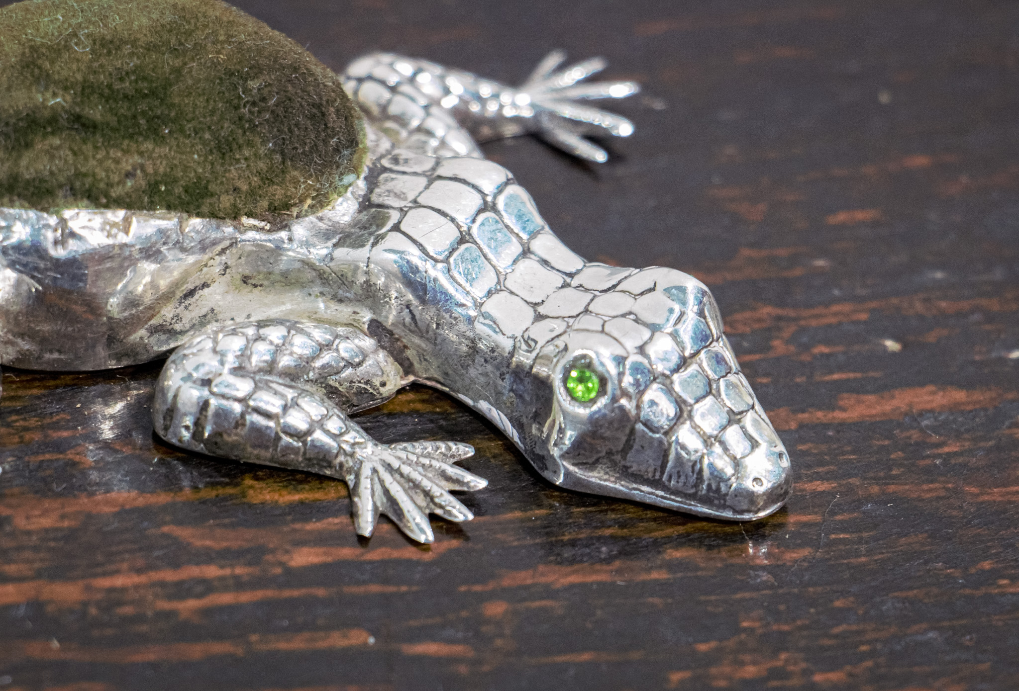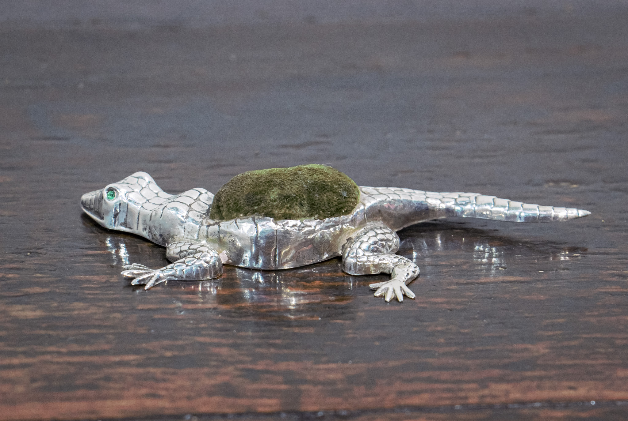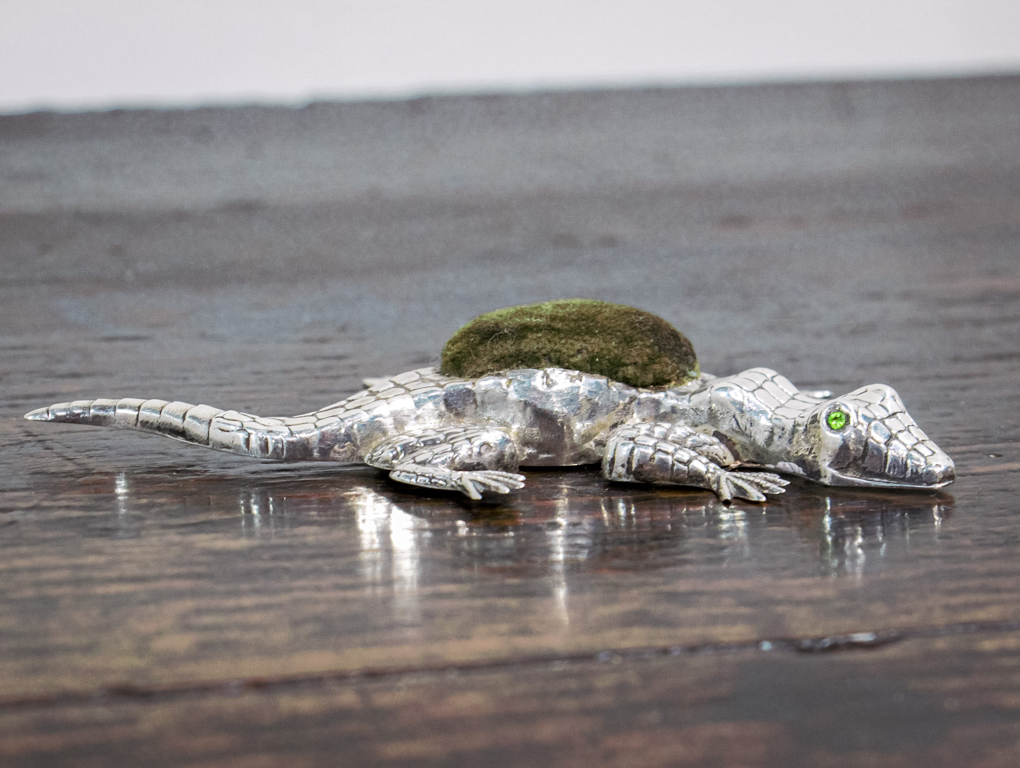 A highly unusual silver pin cushion in the form of an alligator. Exquisitely made with a fine attention to detail, especially to the body and face. Each segment of the animals skin can be seen as can its striking green eyes. This is a highly collectable rare piece by the renowned Crisford & Norris of (117-118 Vyse Street) Birmingham and dated to 1925. Full hallmarks to the underneath of the piece. Weight 35 grams.