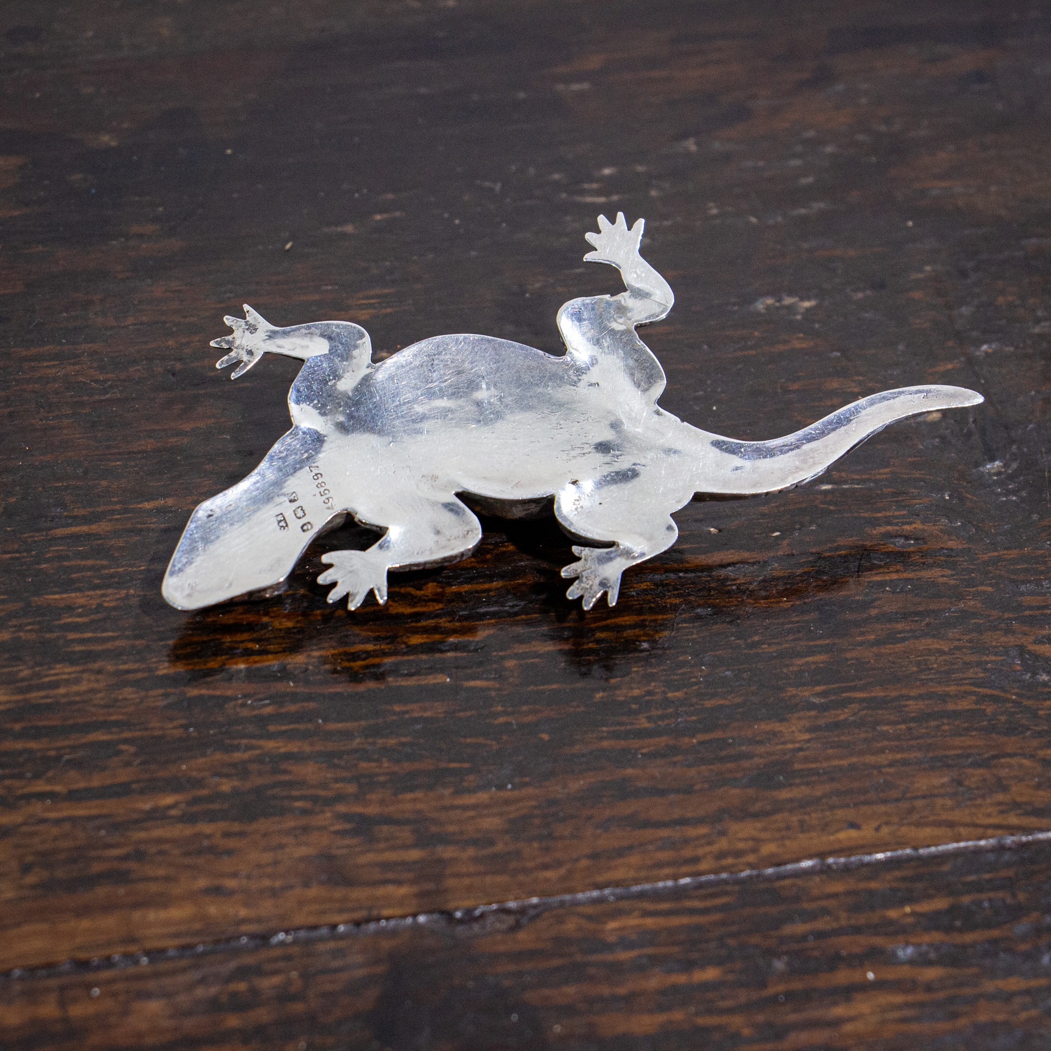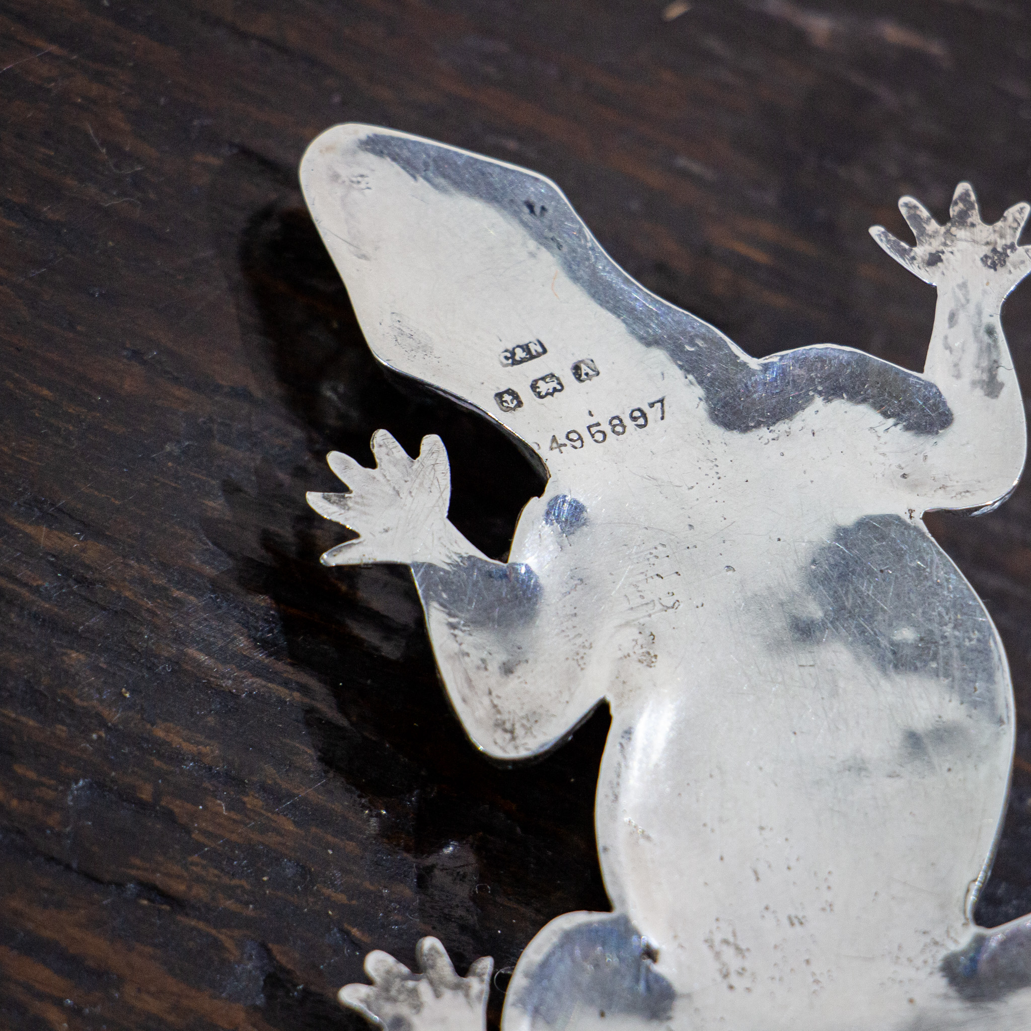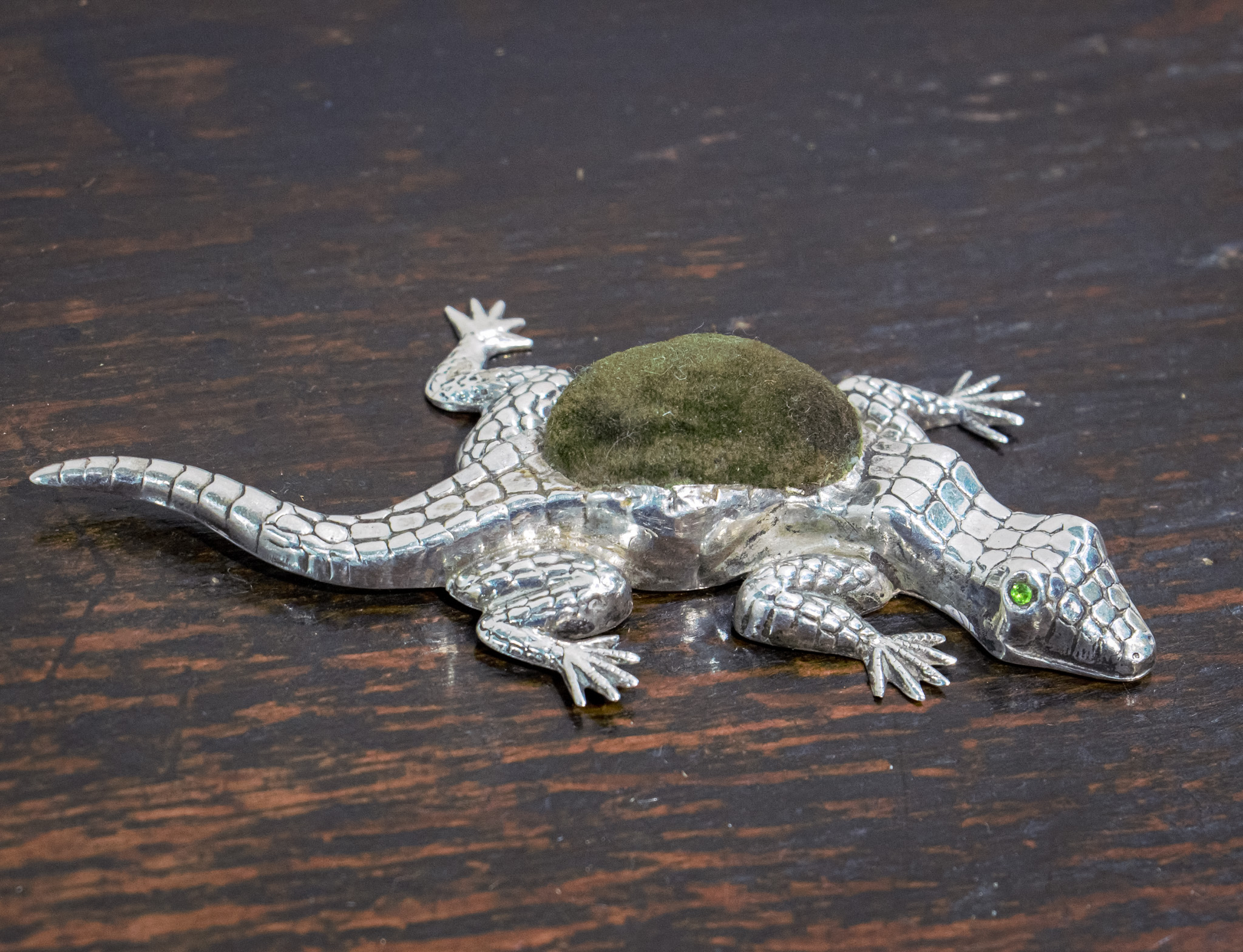 A highly unusual silver pin cushion in the form of an alligator. Exquisitely made with a fine attention to detail, especially to the body and face. Each segment of the animals skin can be seen as can its striking green eyes. This is a highly collectable rare piece by the renowned Crisford & Norris of (117-118 Vyse Street) Birmingham and dated to 1925. Full hallmarks to the underneath of the piece. Weight 35 grams.